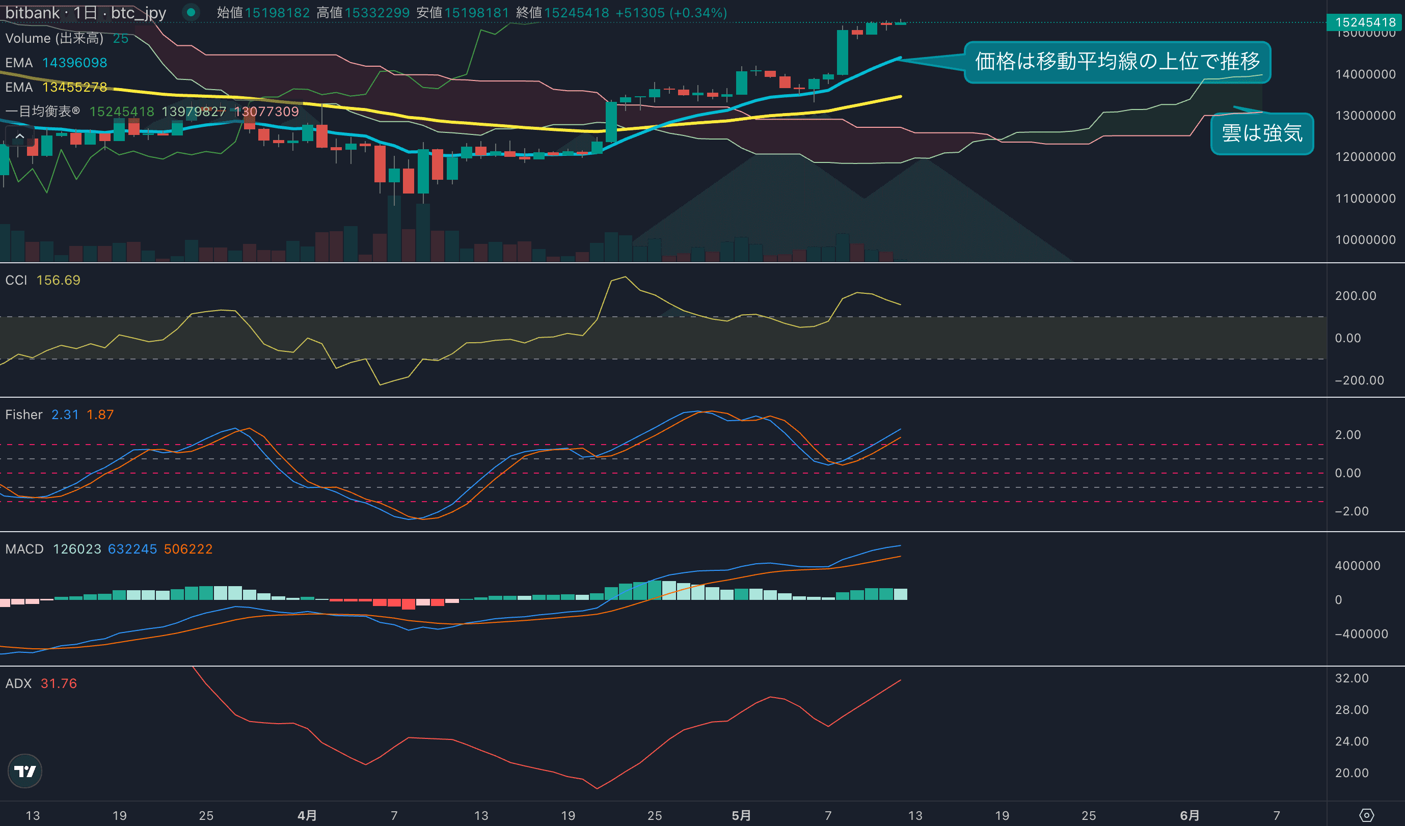 - 先週のビットコインは11.1%上昇し、5週連続の陽線を記録しました。足元では外国為替市場で円安となった影響もあり1500万円台を回復しました。日足はテクニカル的に強気な形となっており、底堅い動きが見られますが、短期オシレーターのCCIは買われ過ぎとなっています。先週大きく上昇した反動から利確売りも出やすい状況と言えます。新規の買いポジションを持つには押し目を待った方がいいでしょう。
