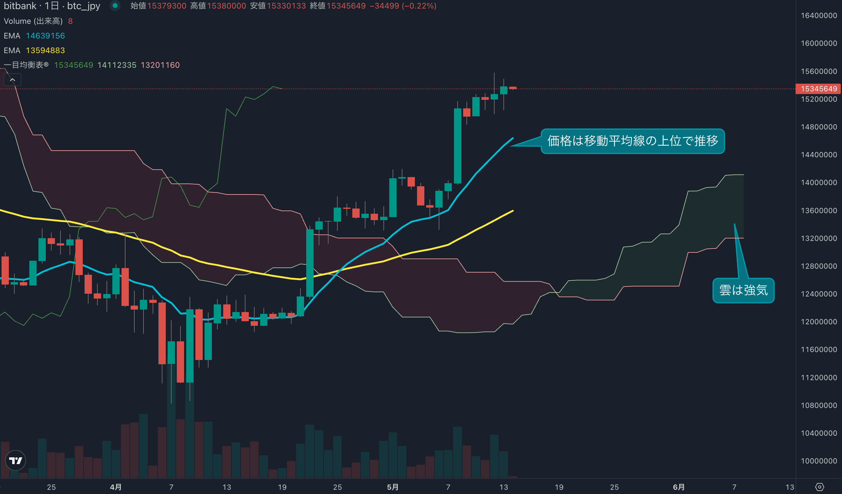 - 価格は14EMA(1453万円)を上回り強気示唆です。53EMA(1352万円)は上昇し始めており、長期トレンドも強気に傾いています。一目均衡表の雲は先行スパン1(1411万円)が先行スパン2(1320万円)を上回り強気示唆です。
