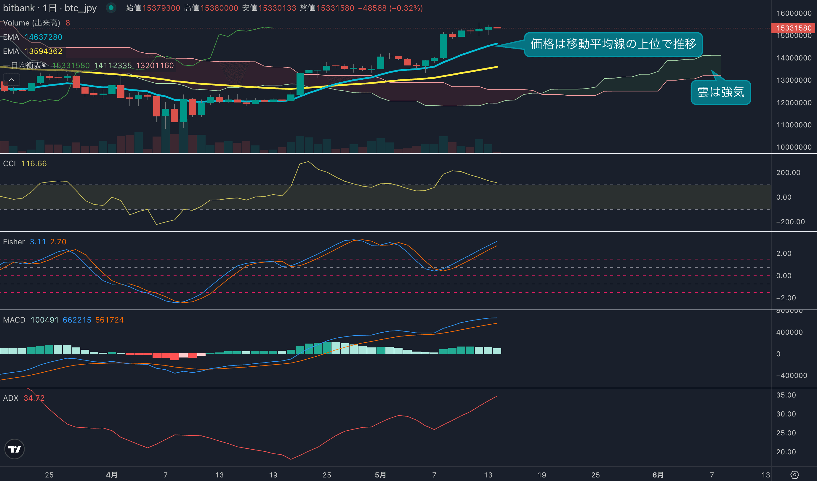 - オシレーター系インジケーターは、足元で上昇しています。CCIは買われ過ぎ水準となる133を記録。Fisherはプラス圏で遅行線を上回って推移しています。長期オシレーターのMACDも上昇が継続しています。