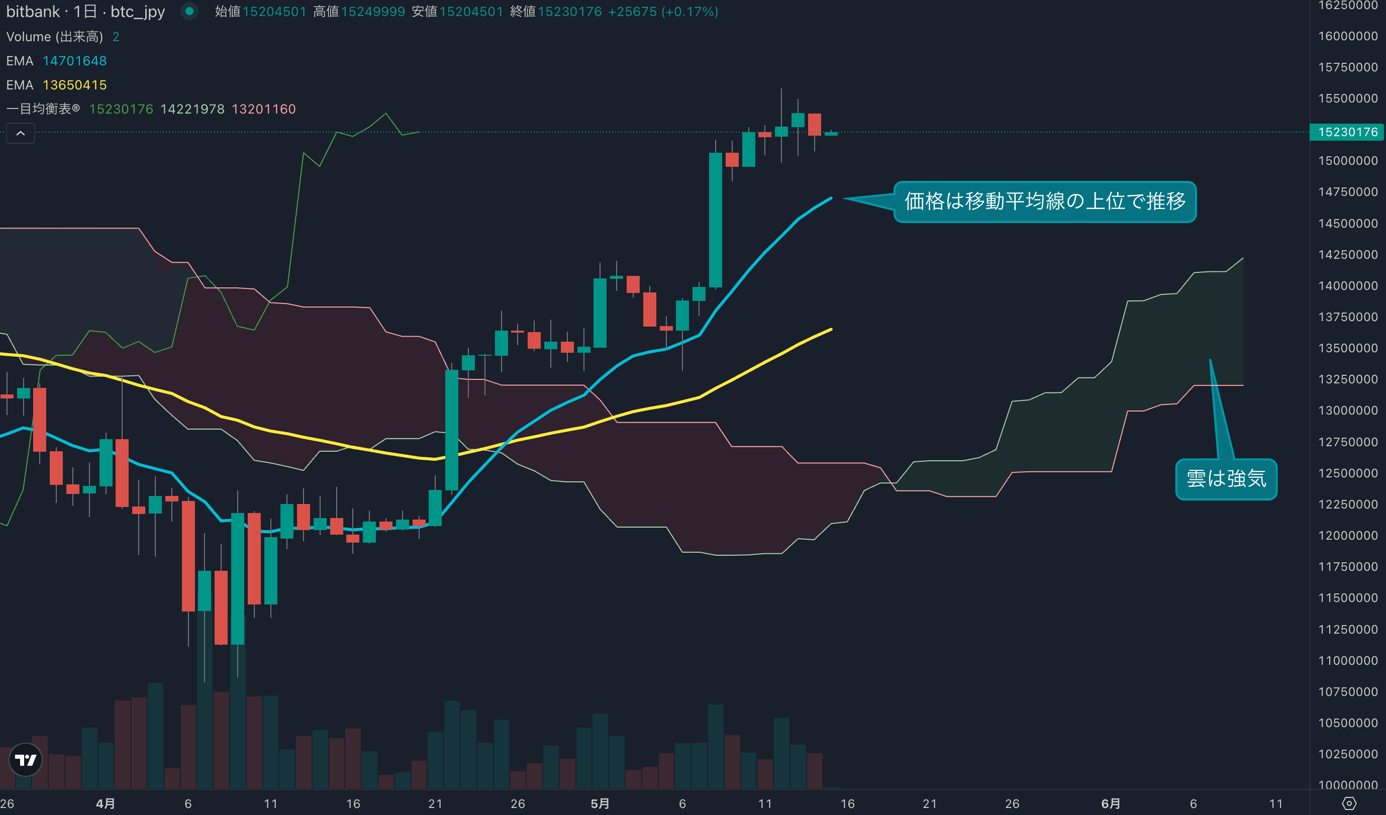 - 価格は14EMA(1462万円)を上回り強気示唆です。53EMA(1358万円)は上昇し始めており、長期トレンドも強気に傾いています。一目均衡表の雲は先行スパン1(1411万円)が先行スパン2(1320万円)を上回り強気示唆です。