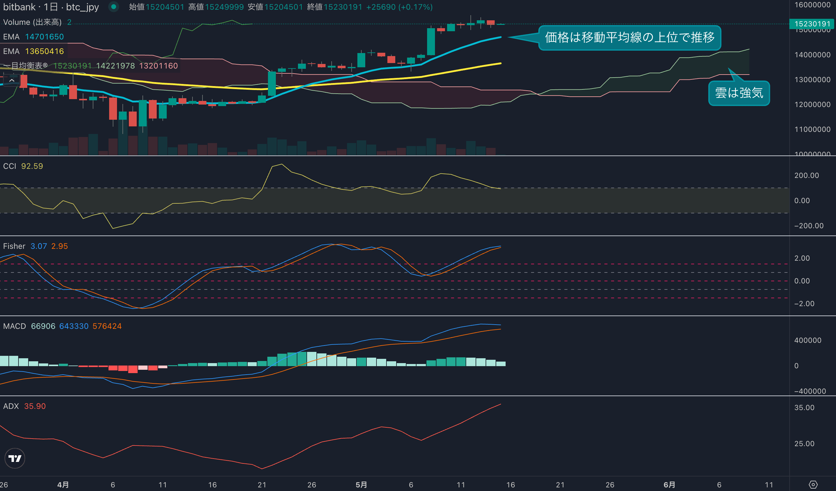 - 昨日のビットコインは1.1%下落し、終値は1520万円でした。3日ぶりの陰線を記録し、今週の上昇幅をほぼ打ち消す動きとなりました。高値圏で揉み合いの展開となっています。日足は移動平均線の上位を維持しています。