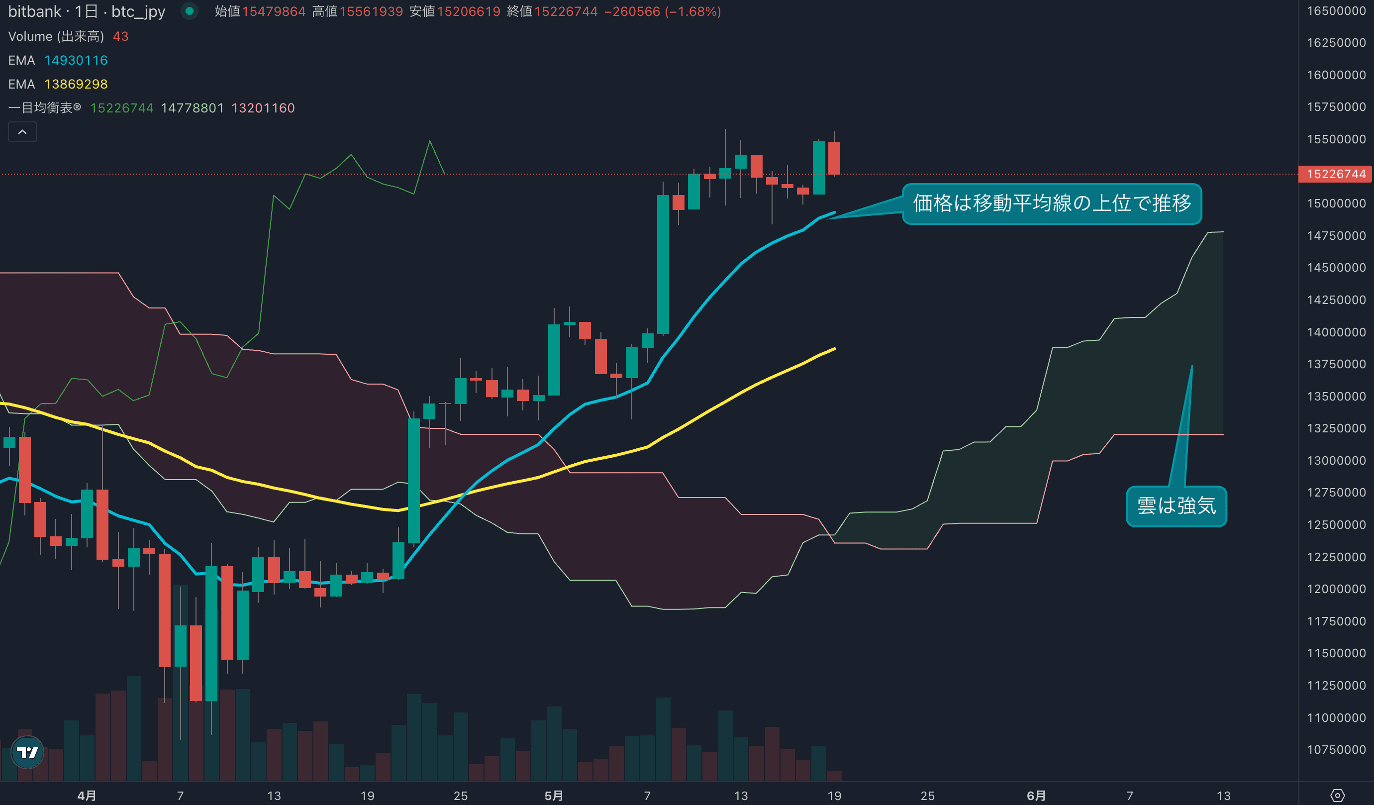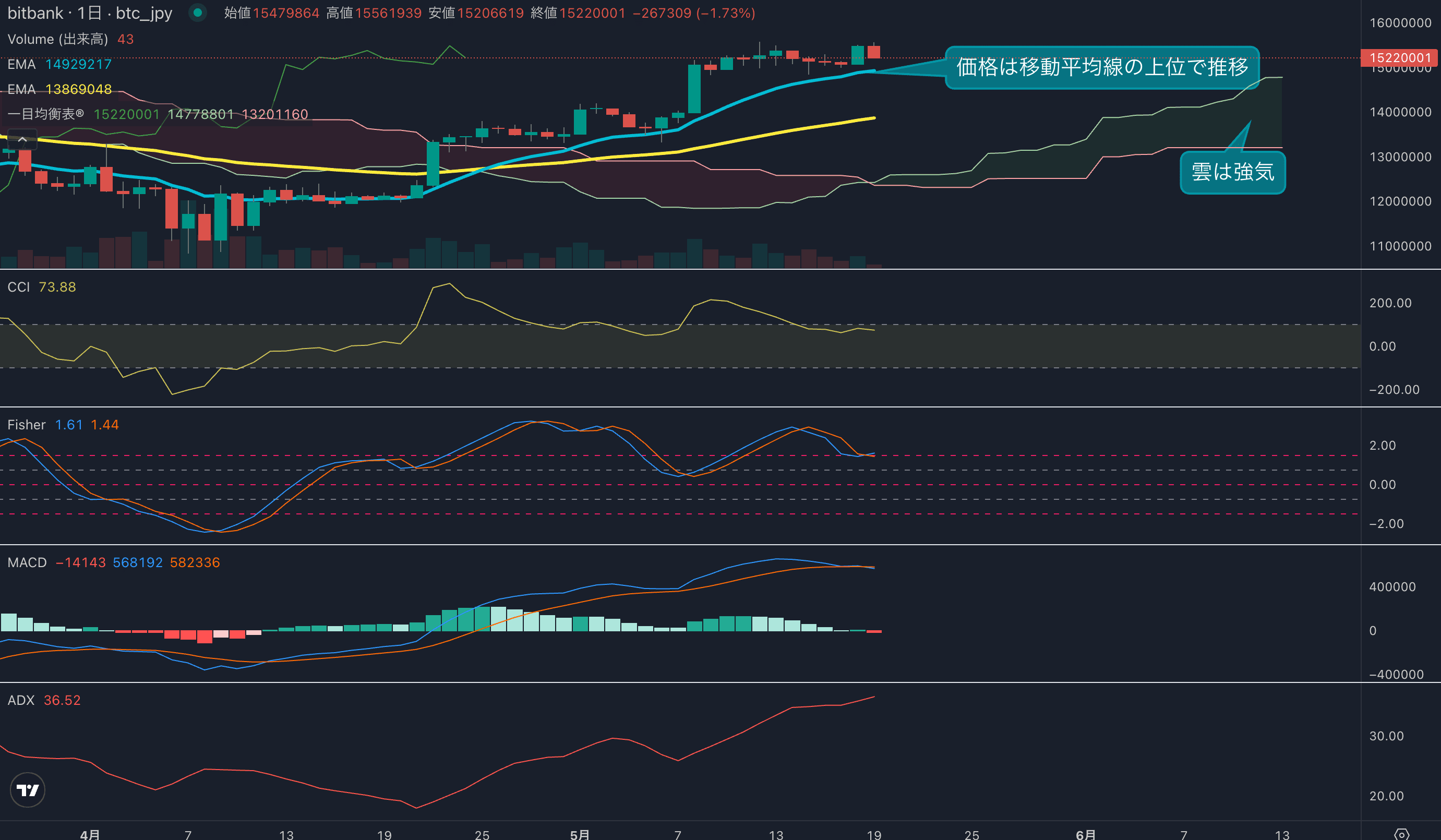 - 価格は14EMA(1488万円)を上回り強気示唆です。53EMA(1381万円)は上昇し始めており、長期トレンドも強気に傾いています。一目均衡表の雲は先行スパン1(1477万円)が先行スパン2(1320万円)を上回り強気示唆です。