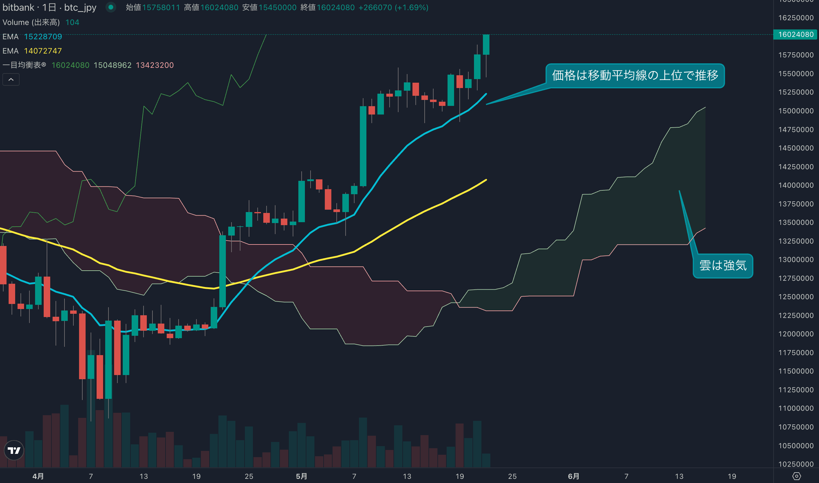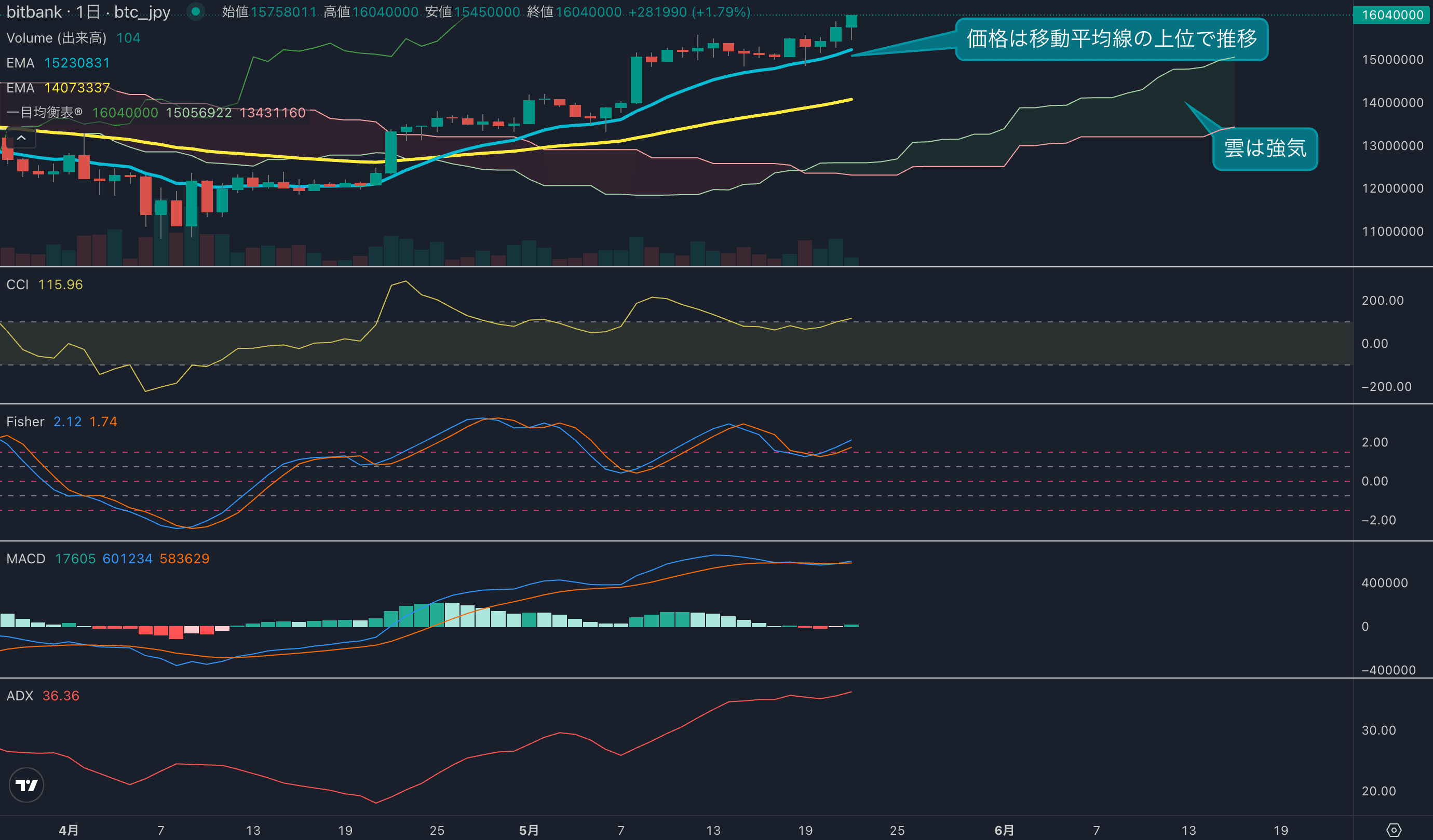 - 昨日のビットコインは2.1%上昇し、終値は1575万円でした。2日連続の陽線となり、高値を更新する展開となりました。日足は移動平均線から上放れする動きを見せています。