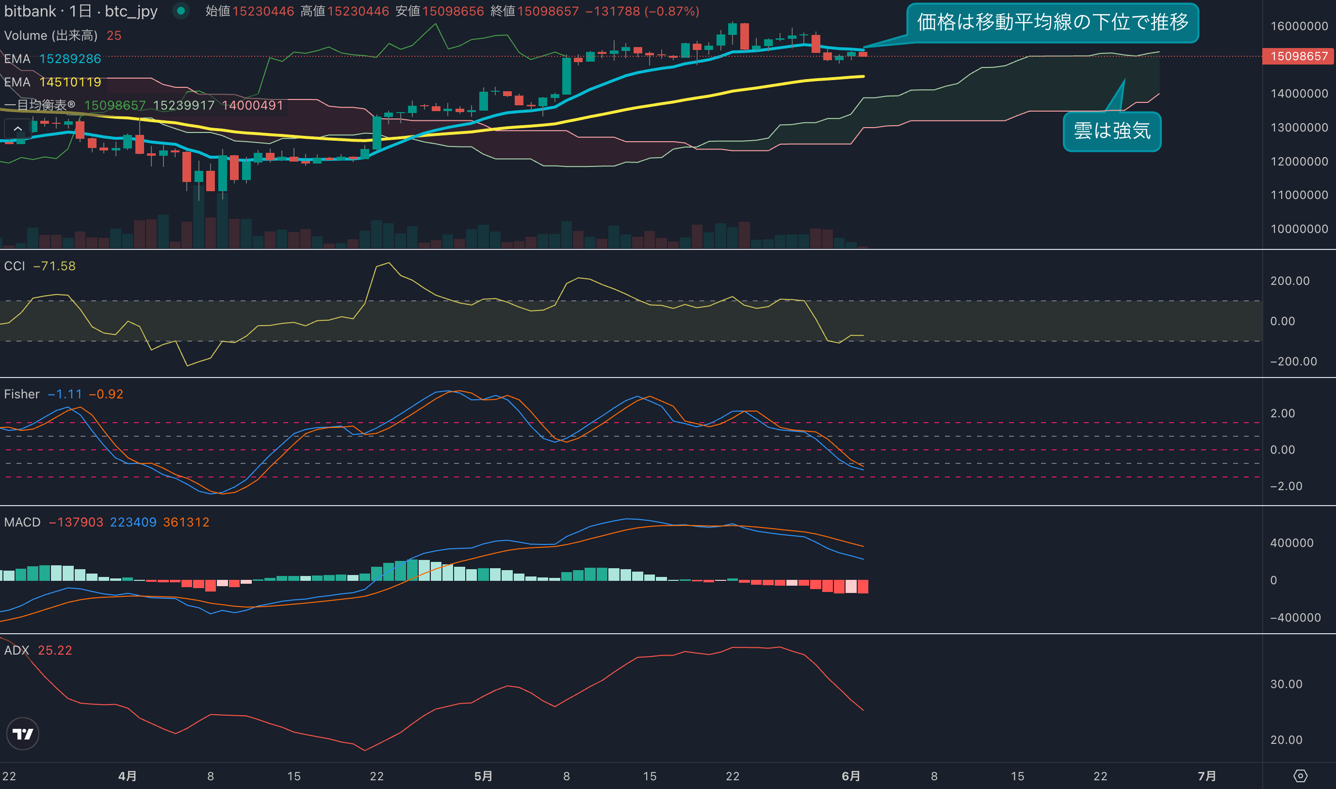 - 昨日のビットコインは0.7%上昇し、終値は1523万円でした。週末は底堅い動きとなり、土日ともに陽線を記録しました。日足は移動平均線の下位で取引されており、テクニカル的には弱気な値動きとなっています。