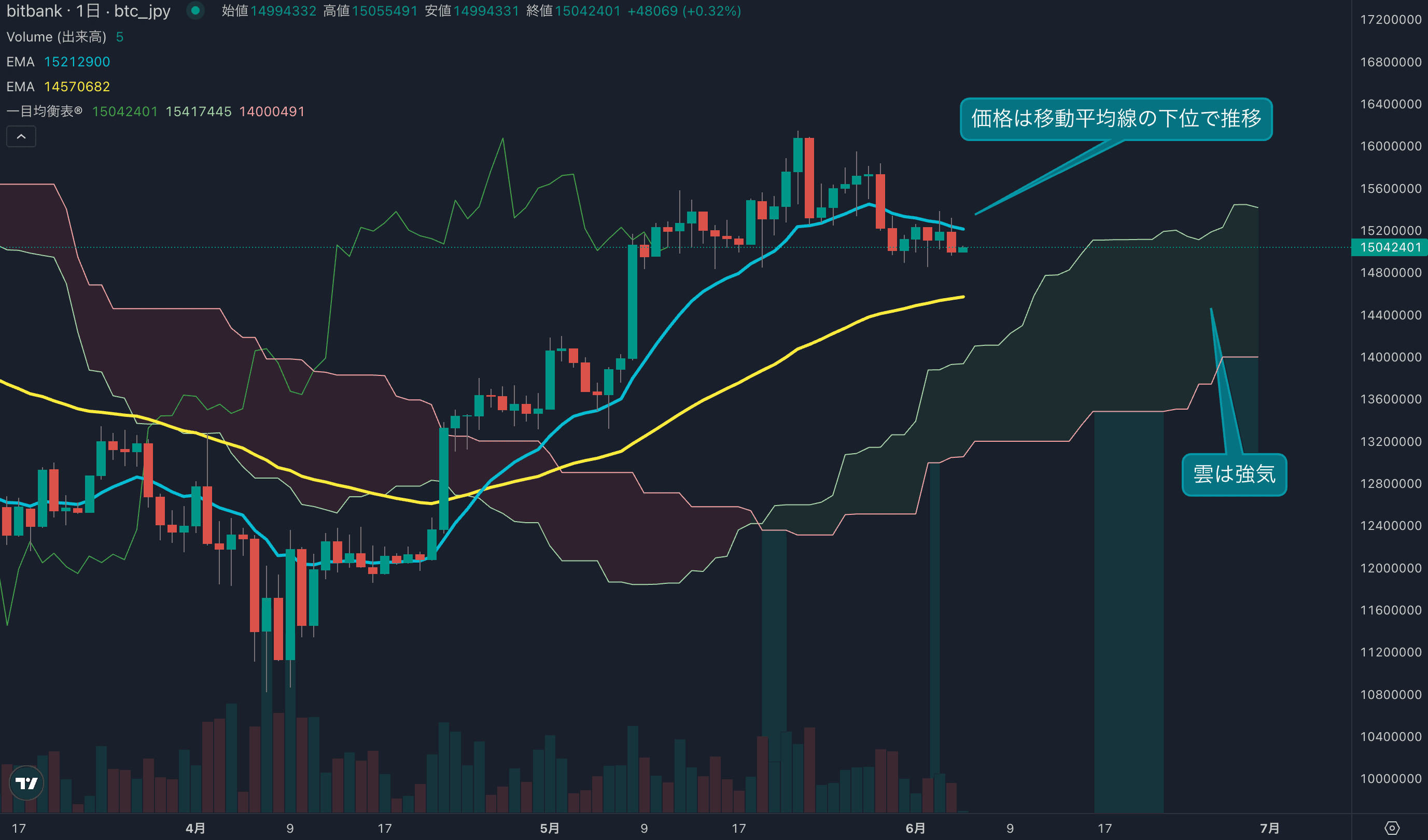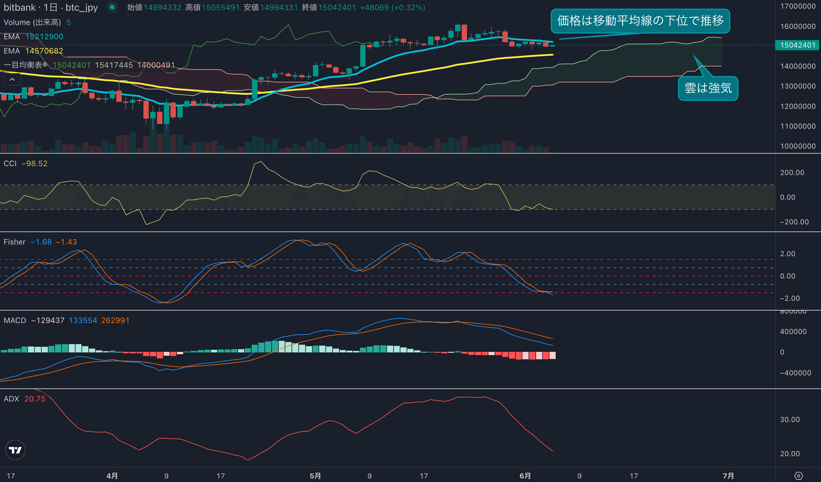 - 昨日のビットコインは1.2%下落し、終値は1499万円でした。今週はプラスとマイナスが交互にくる相場となっており、価格を調整する動きとなっています。日足は移動平均線の上位に浮上する場面もありましたが、終値にかけて売られました。