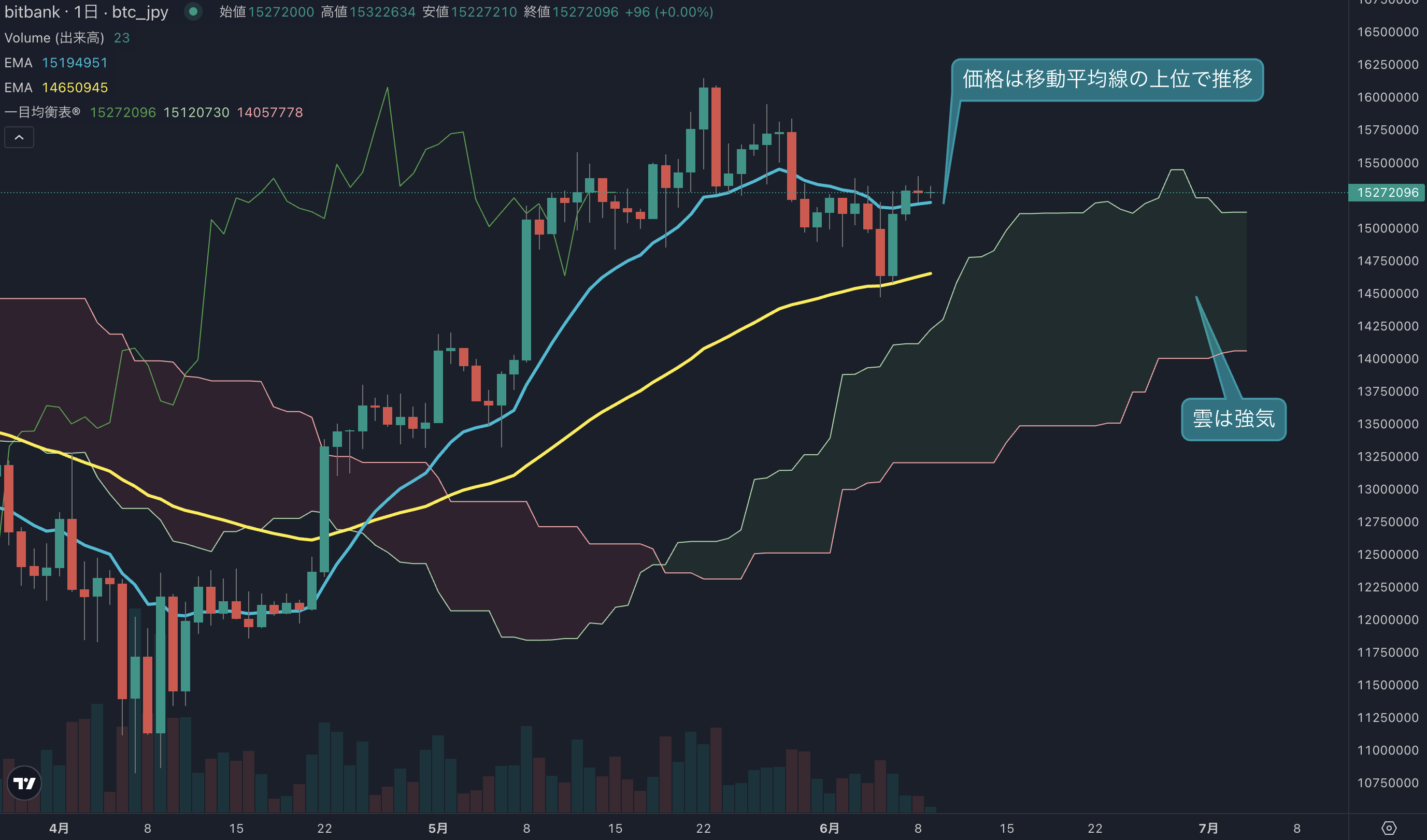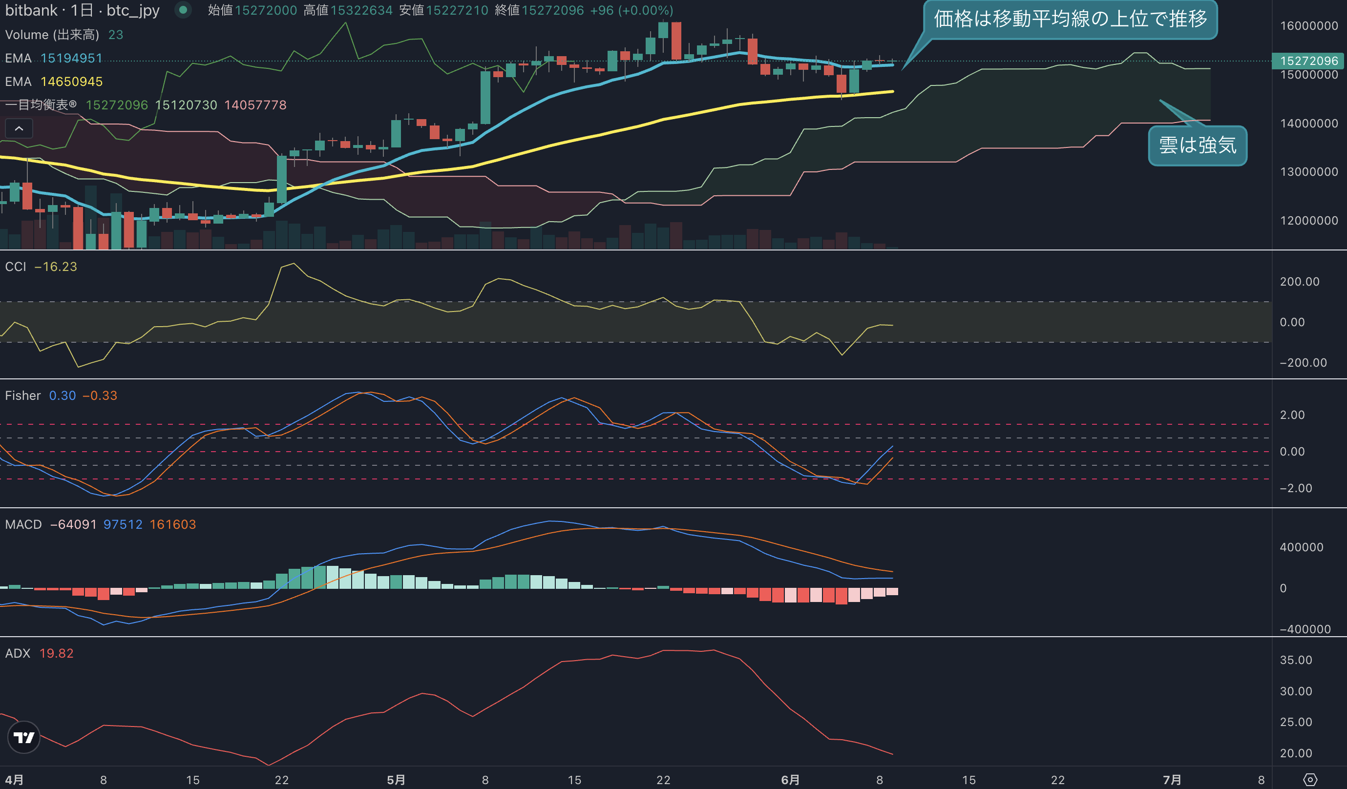 - 価格は14EMA(1518万円)を上回り強気示唆です。53EMA(1462万円)は上昇しており、長期トレンドは強気に傾いています。一目均衡表の雲は先行スパン1(1512万円)が先行スパン2(1405万円)を上回り強気示唆です。