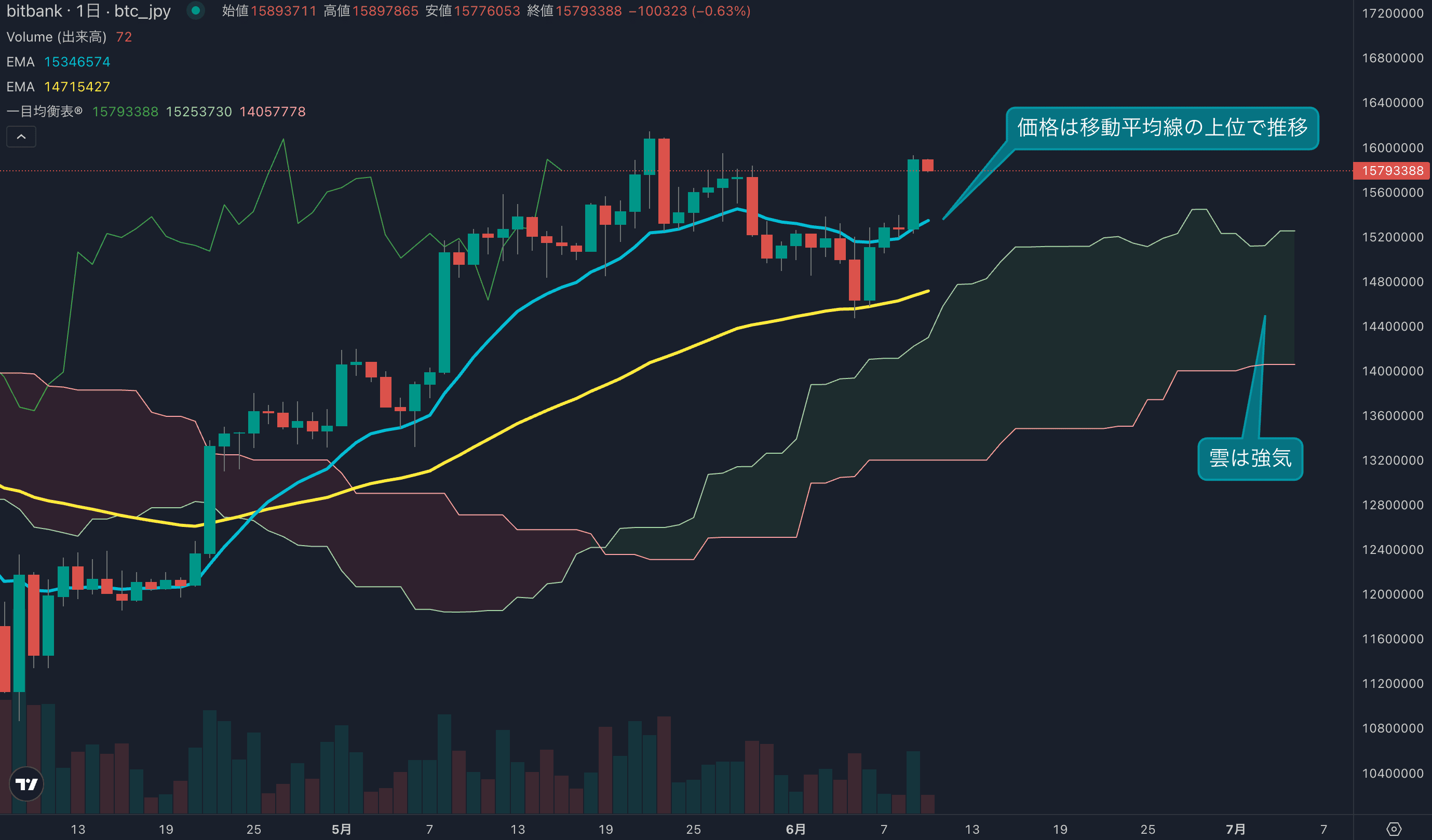 - 価格は14EMA(1527万円)を上回り強気示唆です。53EMA(1467万円)は上昇しており、長期トレンドも強気に傾いています。一目均衡表の雲は先行スパン1(1525万円)が先行スパン2(1405万円)を上回り強気示唆です。