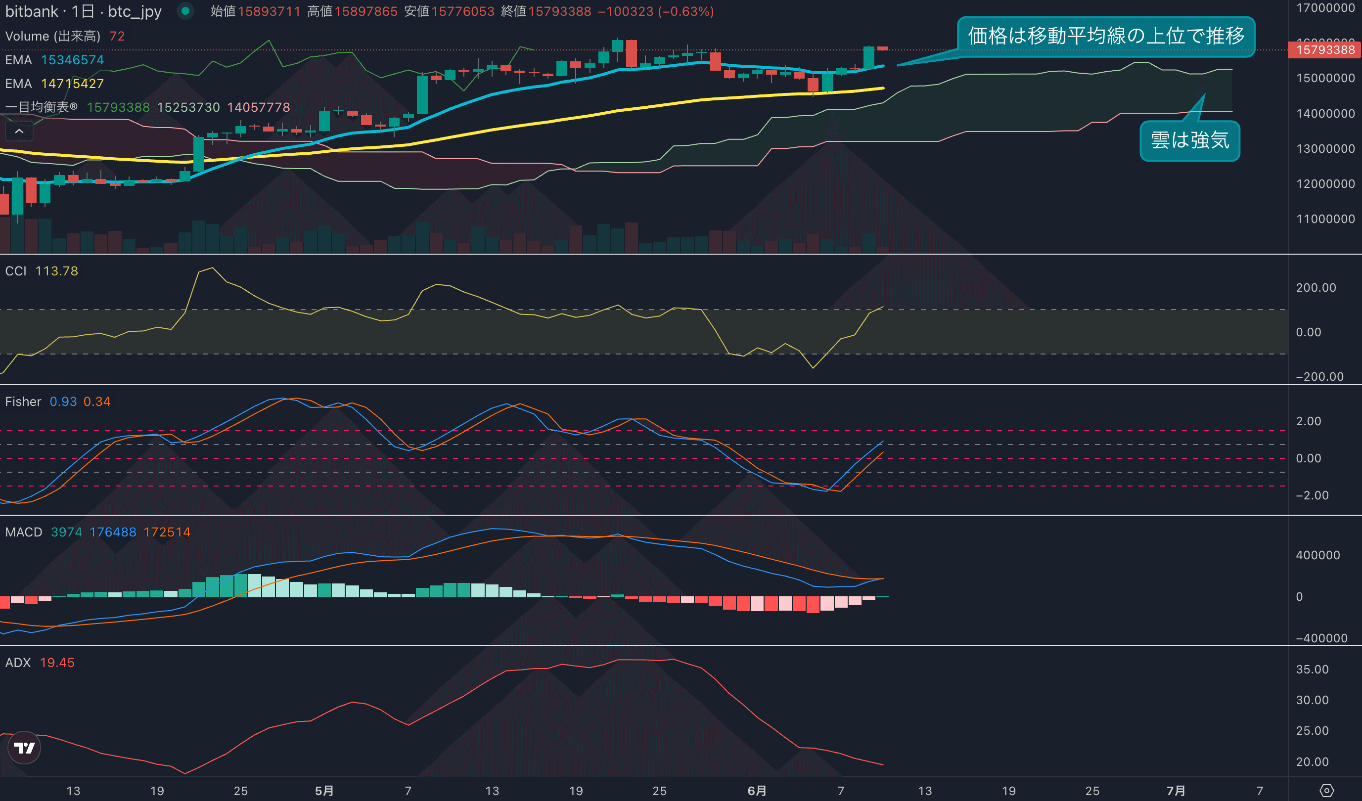 - 昨日のビットコインは4.0%上昇し、終値は1589万円でした。今週の月曜日は買いが先行する動きが見られました。移動平均線から上放れしようとする展開となっています。