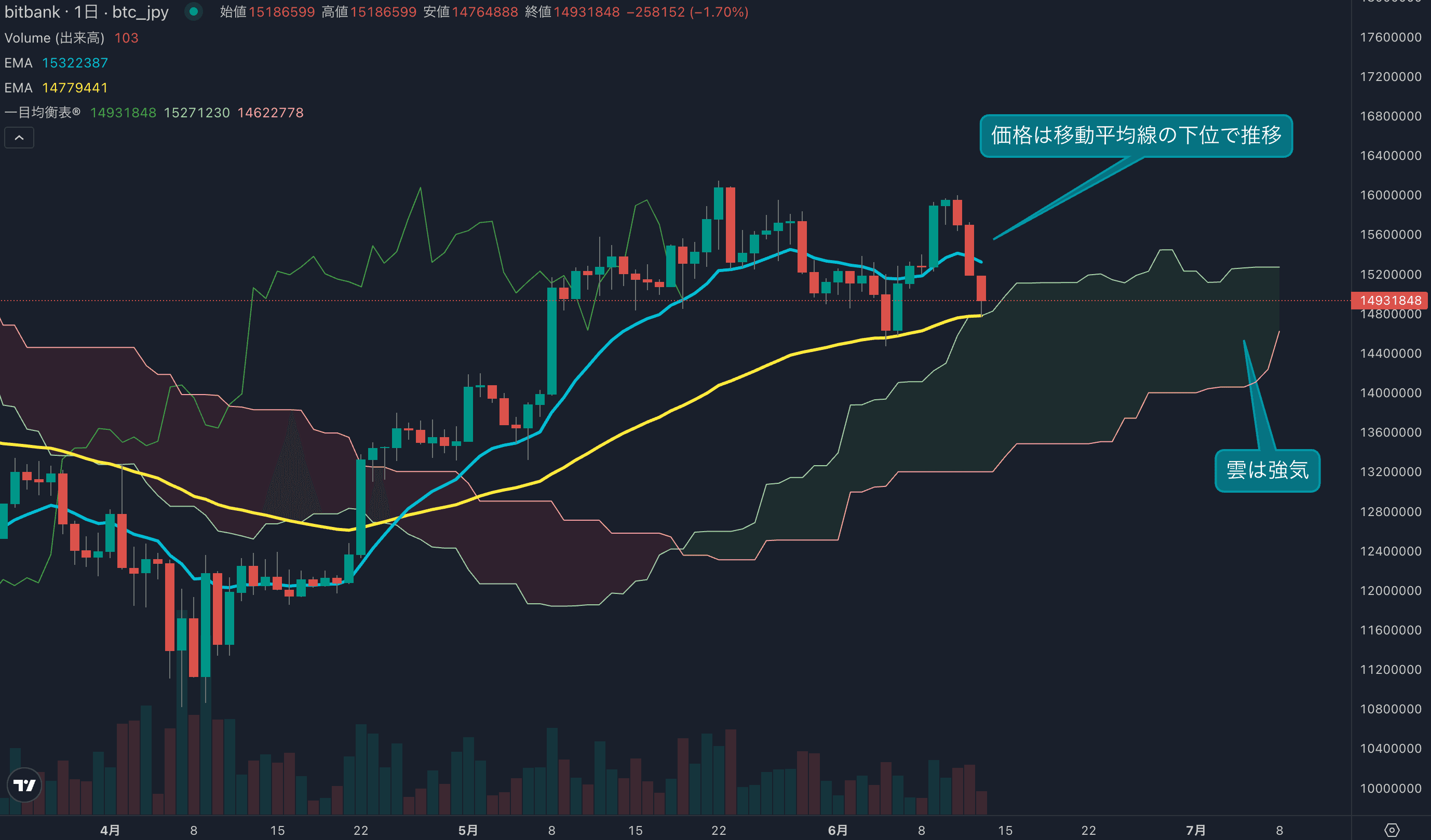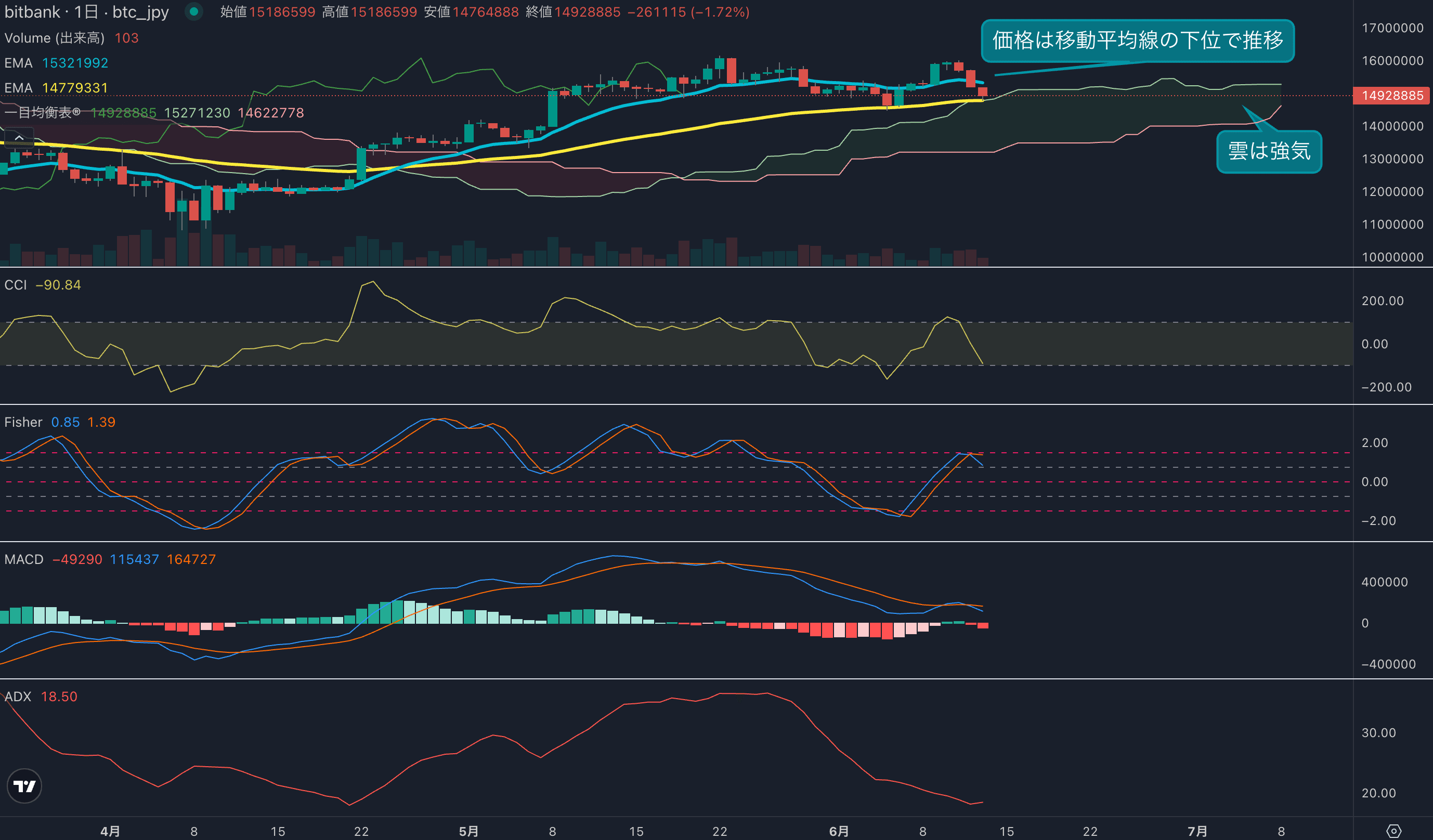 - 価格は14EMA(1538万円)を下回り弱気示唆です。53EMA(1477万円)は上昇しており、長期トレンドも強気に傾いています。一目均衡表の雲は先行スパン1(1527万円)が先行スパン2(1423万円)を上回り強気示唆です。