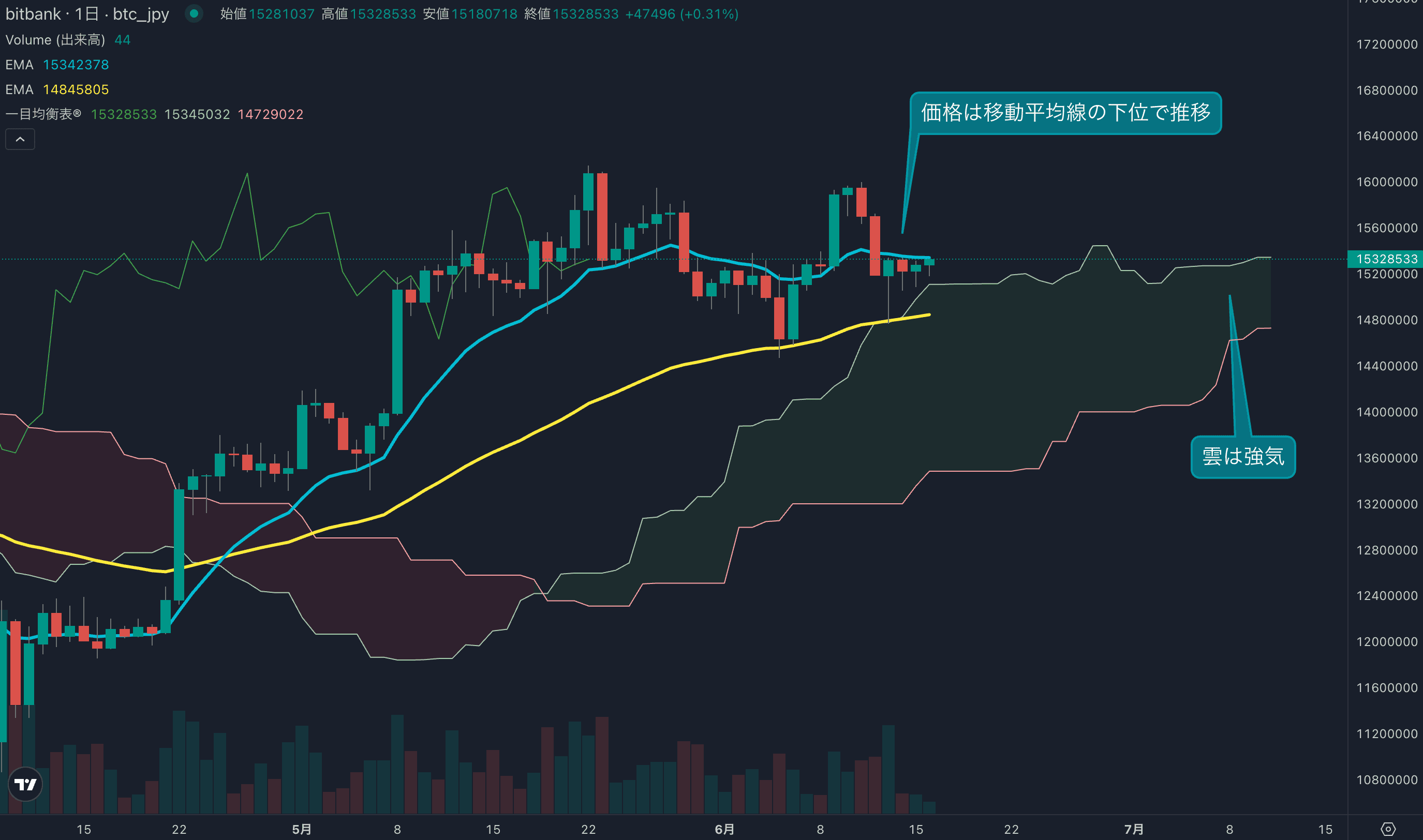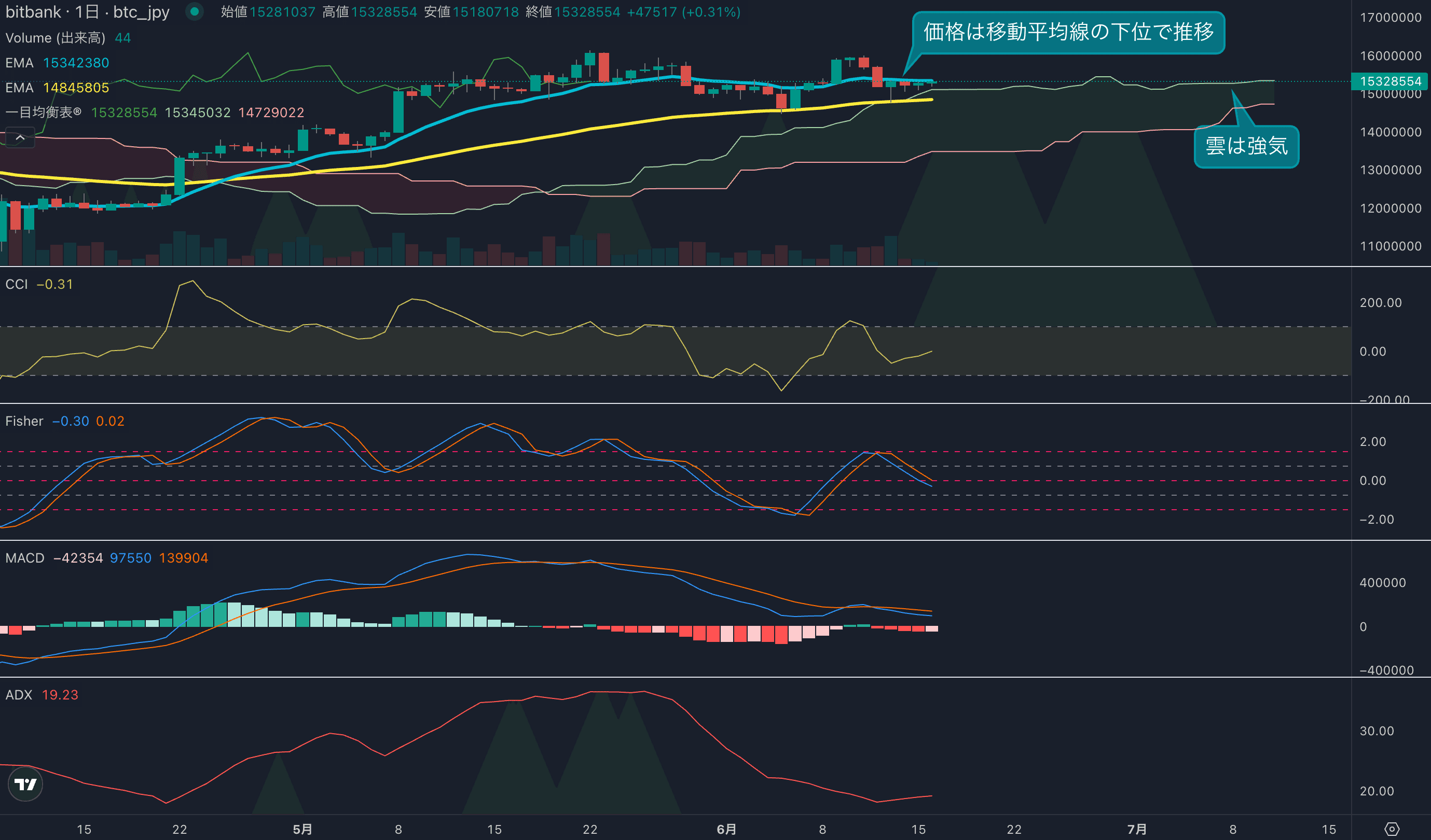- 先週のビットコイン週足は0.06%上昇し値動きとしては、ほぼ横ばいでしたが2週連続の陽線となりました。先週は一時1500万円を割り込む場面もありましたが、終値にかけて買い戻されました。結果として底堅い動きとなりました。短期的には弱気なチャートが形成されていますが、本日は買い気配で相場が始まっています。週始めに移動平均線の上位に浮上できるか注目です。