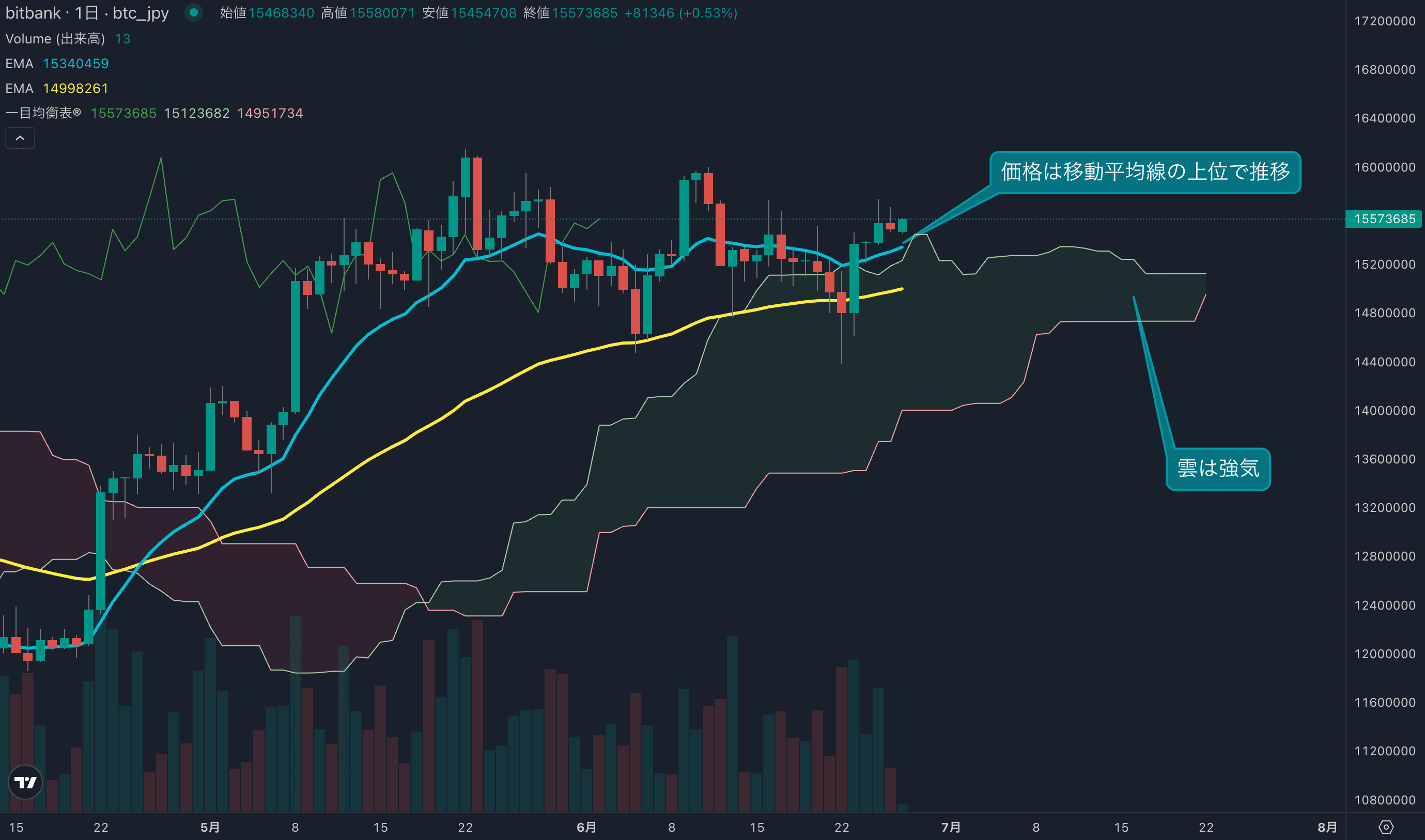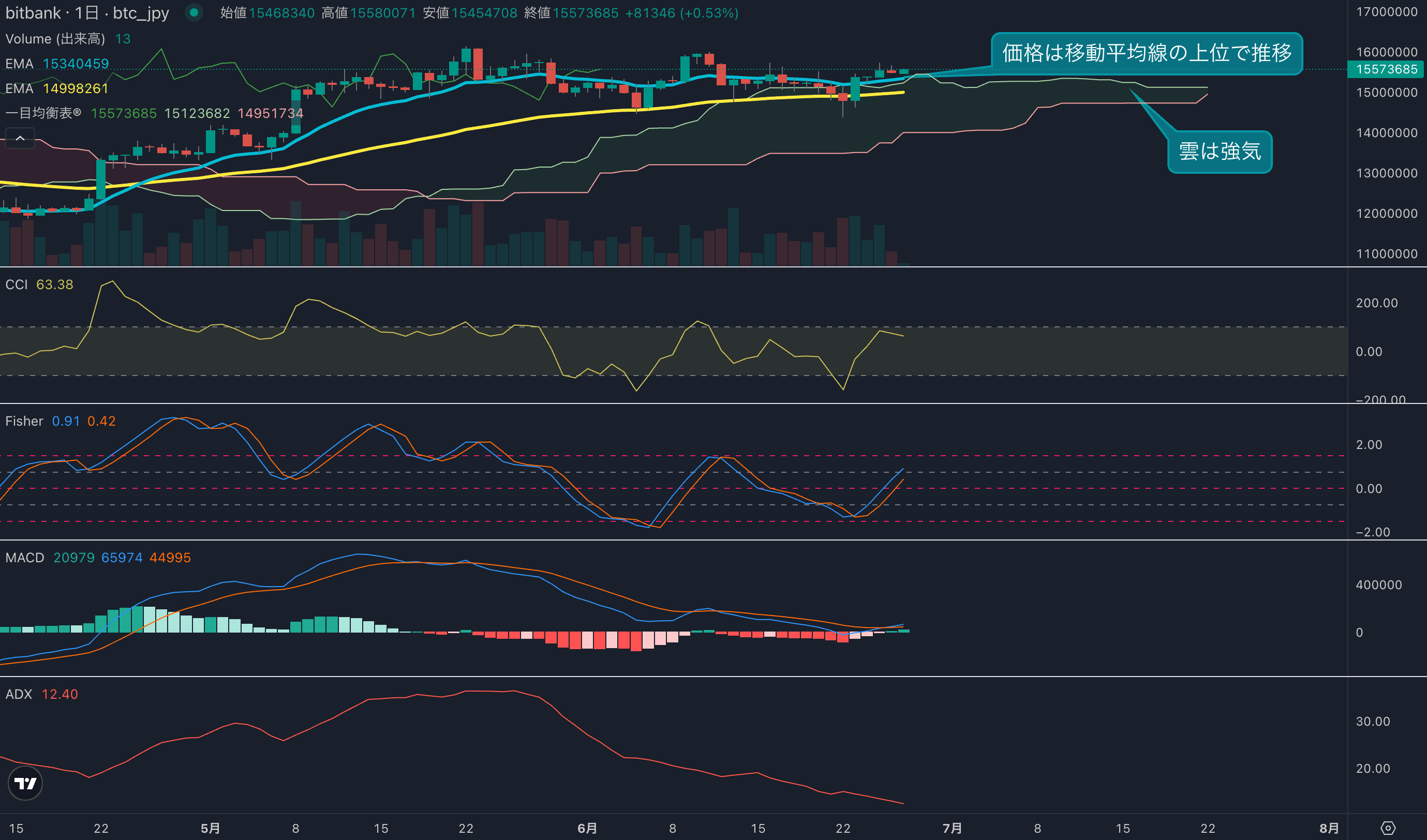 - 今週のビットコインは底堅い相場となっており、昨日は下落しましたが、週次では5%ほど上昇している状況です。週足の終値ベースでは、ここ5週間の高値を記録する可能性が高く、上値を追う準備が整っています。オシレーターも上昇傾向となっており、6月後半に入りモメンタムが回復しています。1600万円を超えてくるともう一段高の期待値が上がります。7月の相場に向けて日足チャートは強気な状態に移行しています。