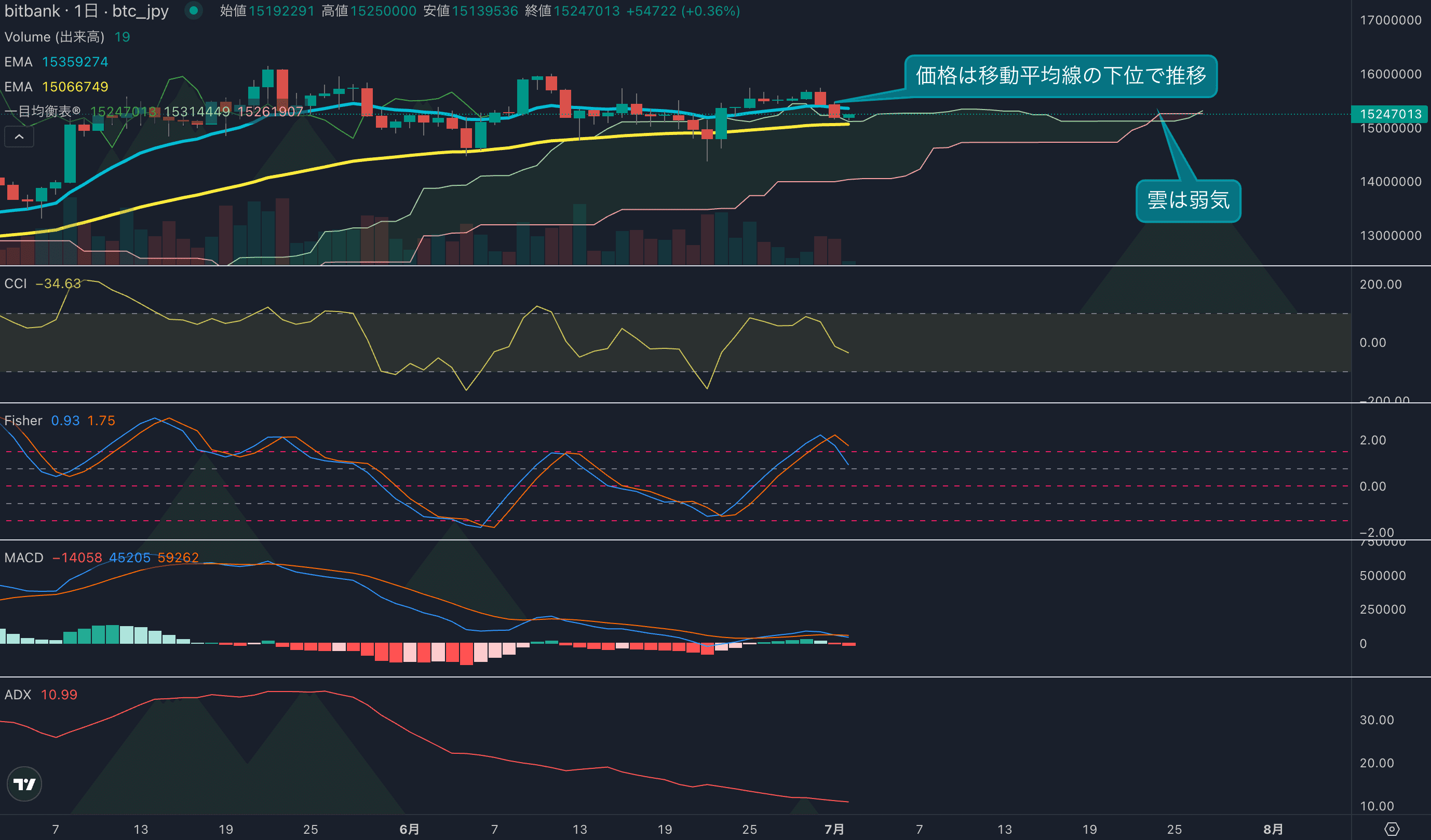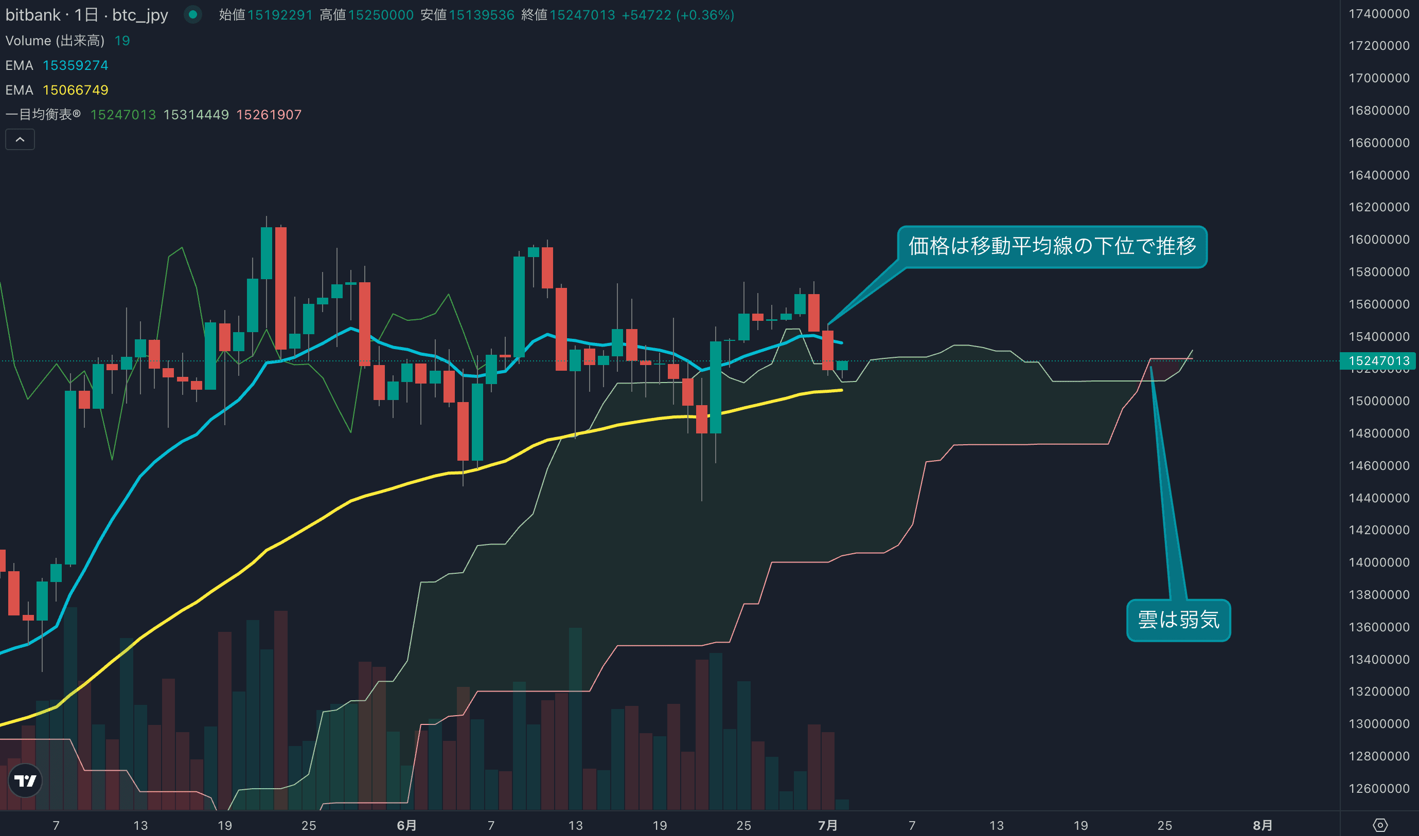 - 昨日のビットコインは1.5%下落し、終値は1519万円でした。今週は売りが優勢な相場となっており、2日連続の陰線を記録しました。日足は移動平均線を下回りました。
