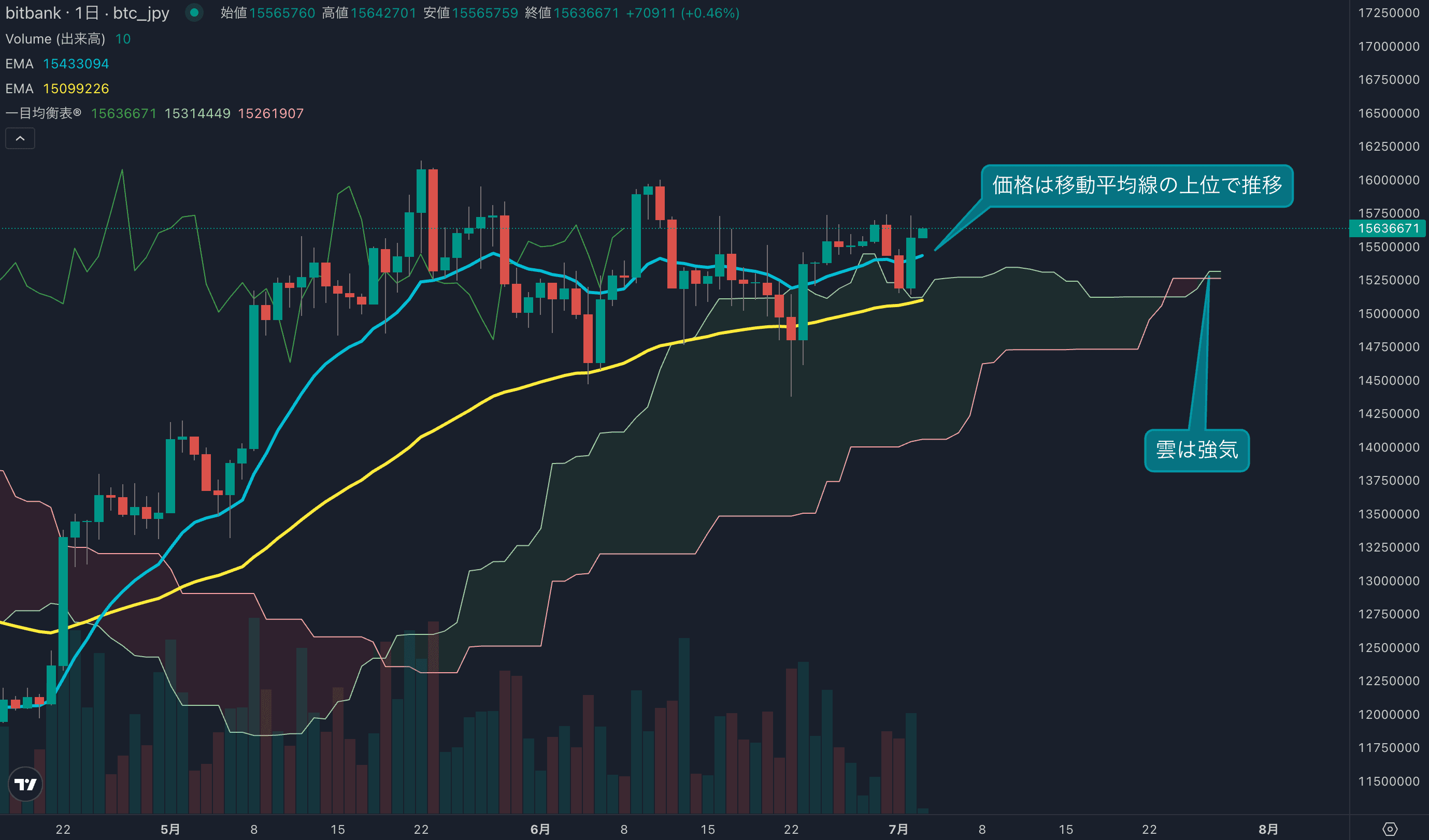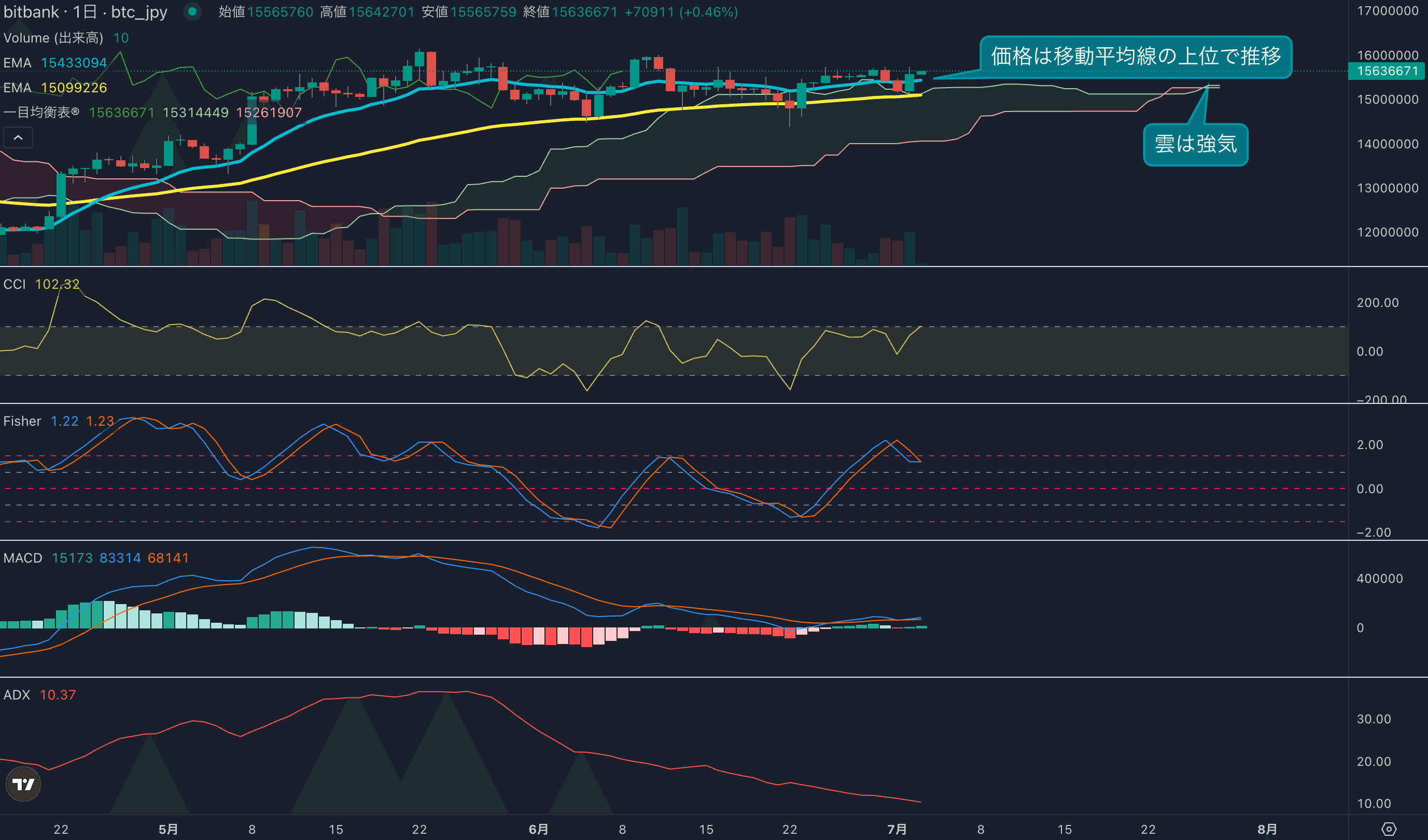 - 昨日のビットコインは2.4%上昇し、終値は1556万円でした。昨日の上昇で今週の下落分をほぼ戻しました。日足は再度移動平均線の上位に浮上し、強気の値動きが戻ってきています。