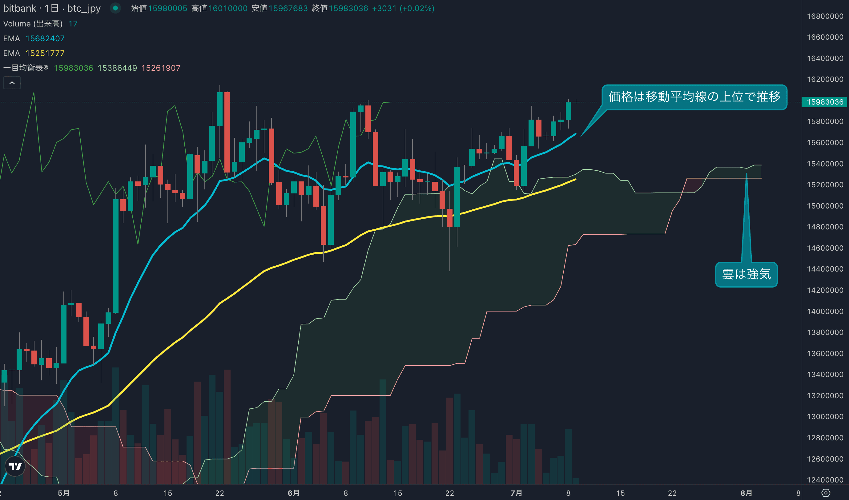 - 昨日のビットコインは1.0%上昇し、終値は1598万円でした。日足は4日連続の陽線を記録しました。昨日は先週の高値を更新し、強気の値動きとなっています。