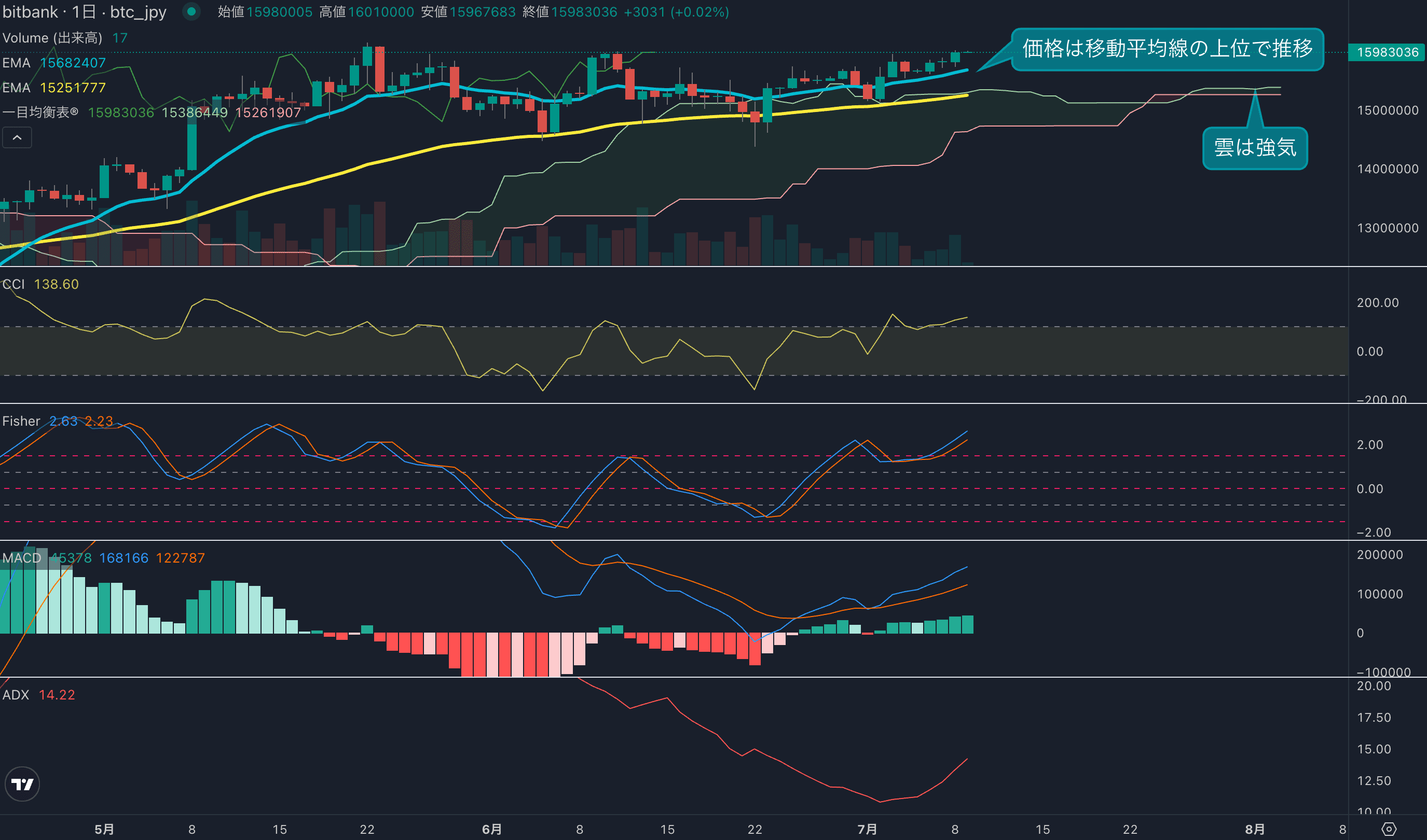 - 今週のビットコインは、足元で4日連続の陽線を記録するなど強い相場となっています。価格は1600万円にタッチする動きとなり、5月からの高値圏を試す展開です。オシレーターは引き続き上昇しており、短期のモメンタムは上方向で推移しています。ADXも徐々に上昇してきており、トレンドの発生が近いことを示唆しています。5月に記録した高値1614万円を更新できるか注目です。