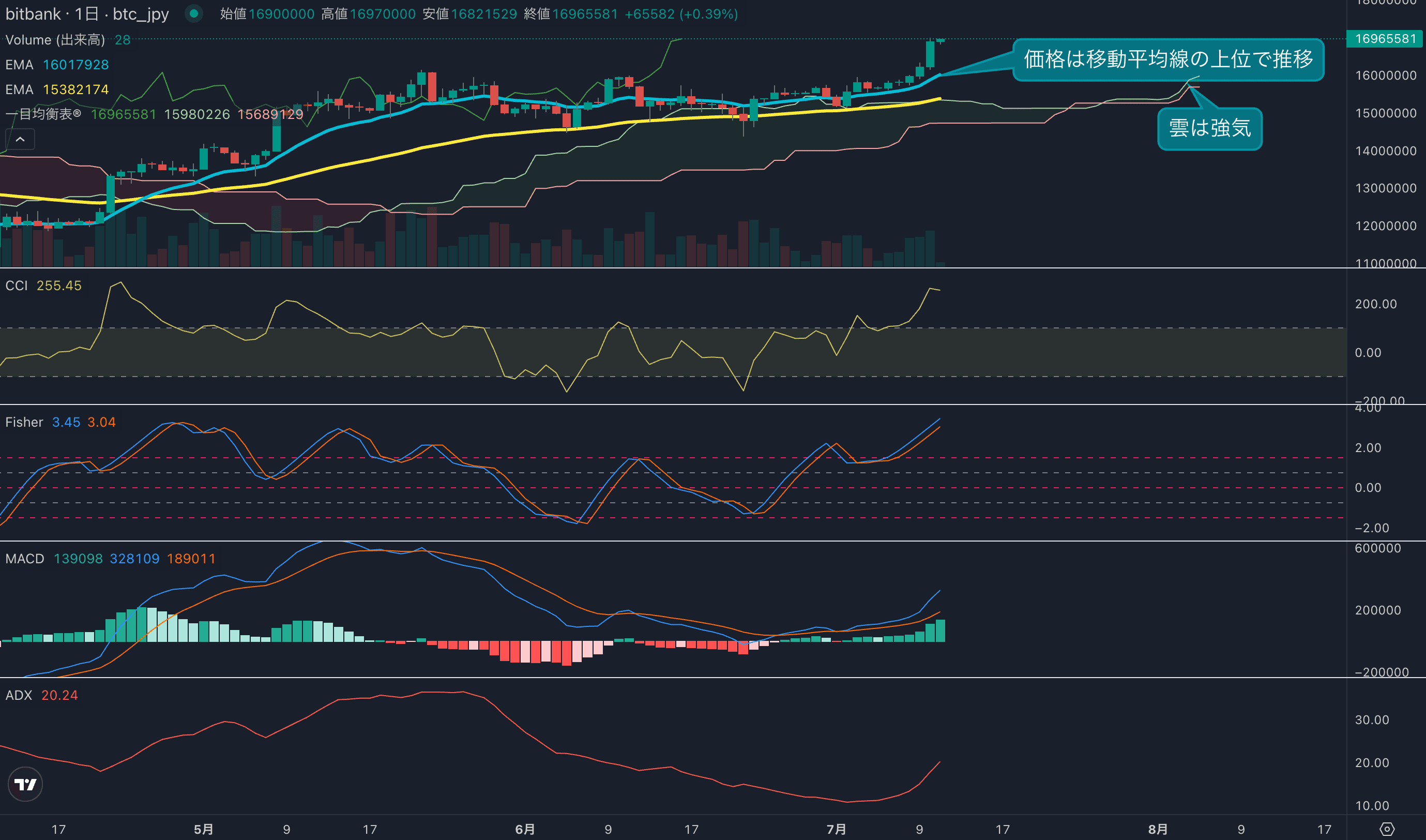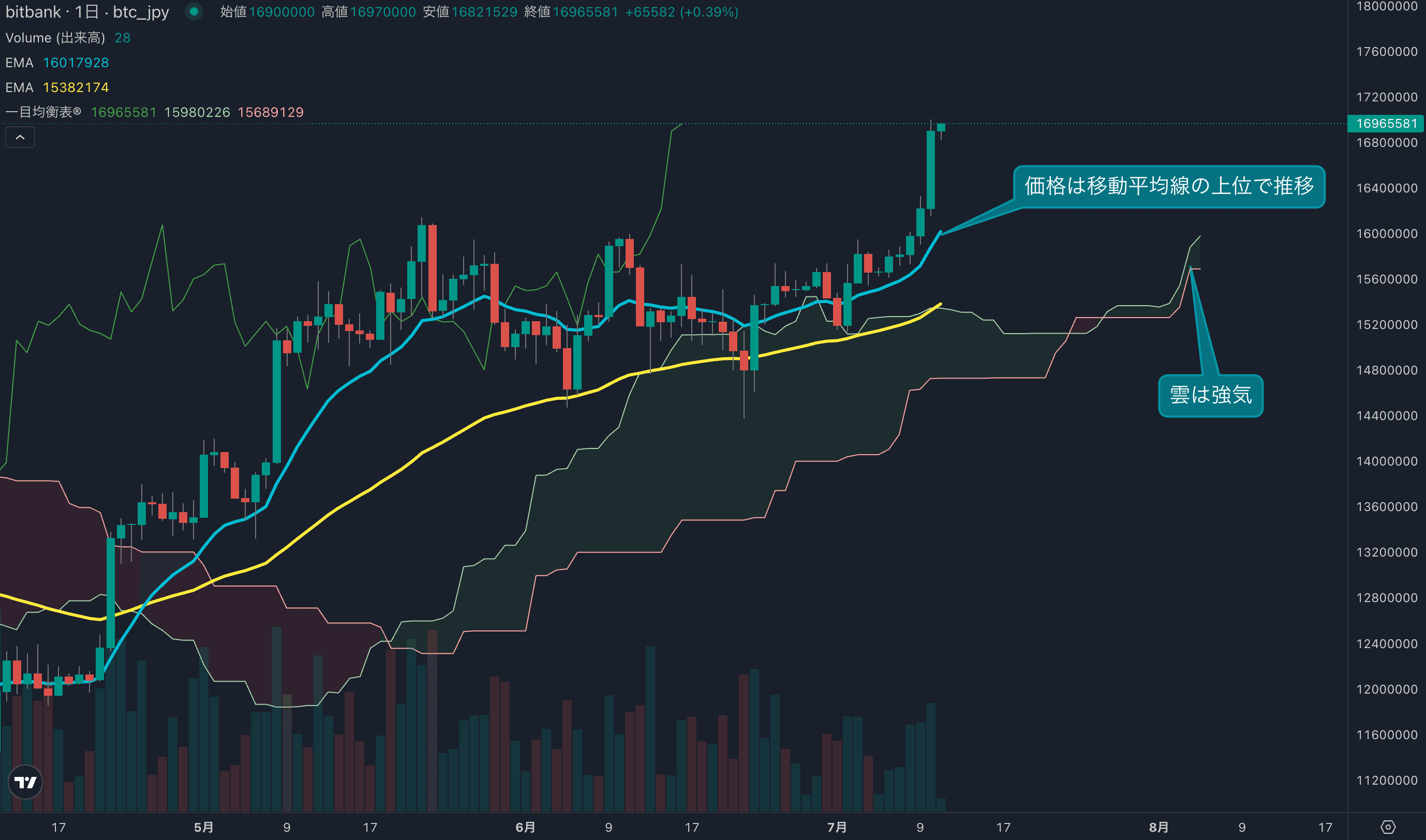 - 昨日のビットコインは4.1%上昇し、終値は1689万円でした。日足は6日連続の陽線を記録しています。相場は高値を追う展開となり、強気の値動きが見られます。