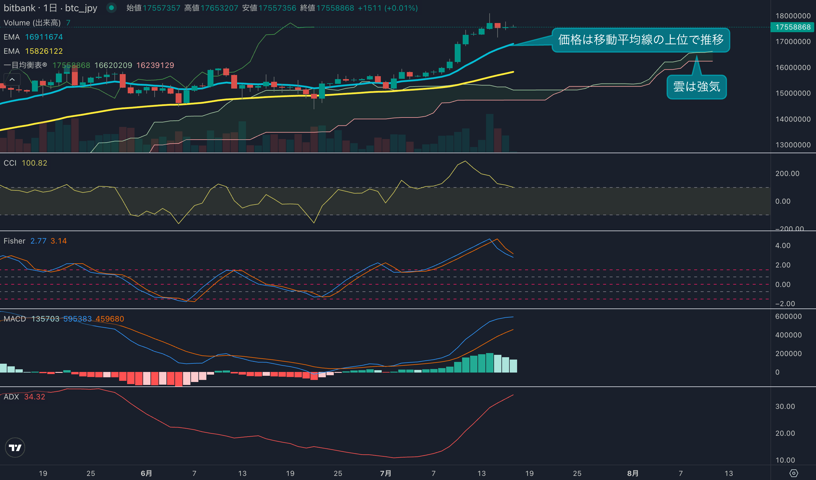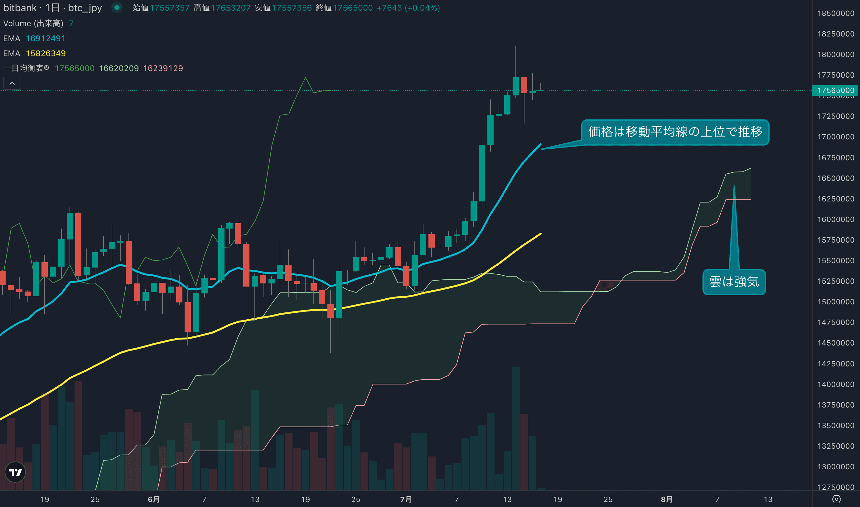 - 昨日のビットコインは0.1%上昇し、終値は1755万円でした。今週は上下に動く展開となり、週次ではほぼ横ばいの動きとなっています。日足は移動平均線の上位で推移し、強気の値動きです。
