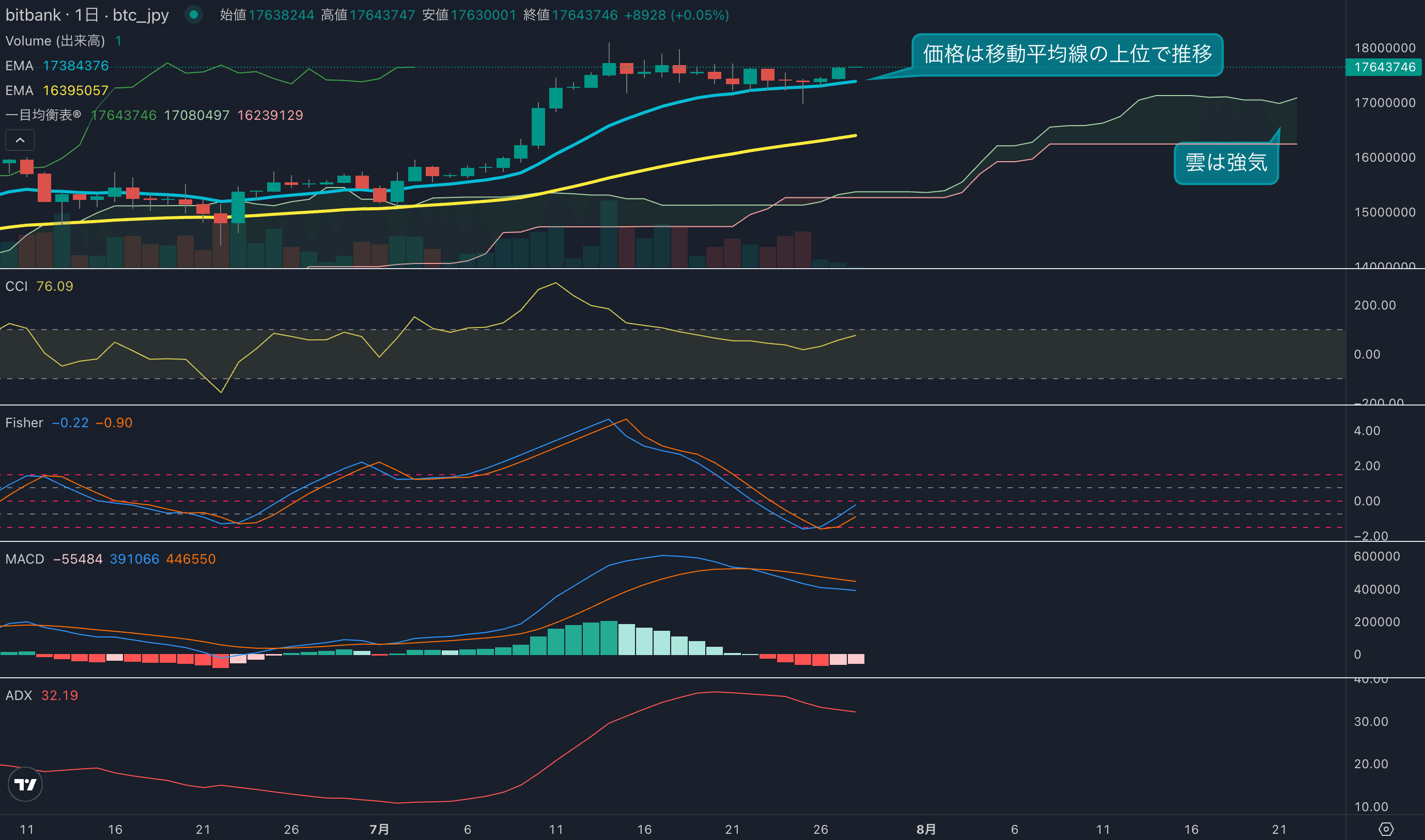 - 価格は14EMA(1734万円)を上回り強気示唆です。53EMA(1634万円)は上昇しており、長期トレンドも強気に傾いています。一目均衡表の雲は先行スパン1(1697万円)が先行スパン2(1623万円)を上回り強気示唆です。