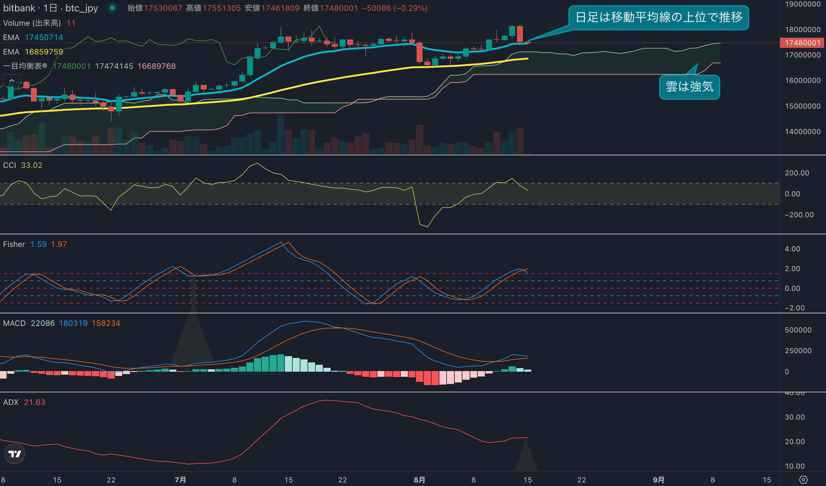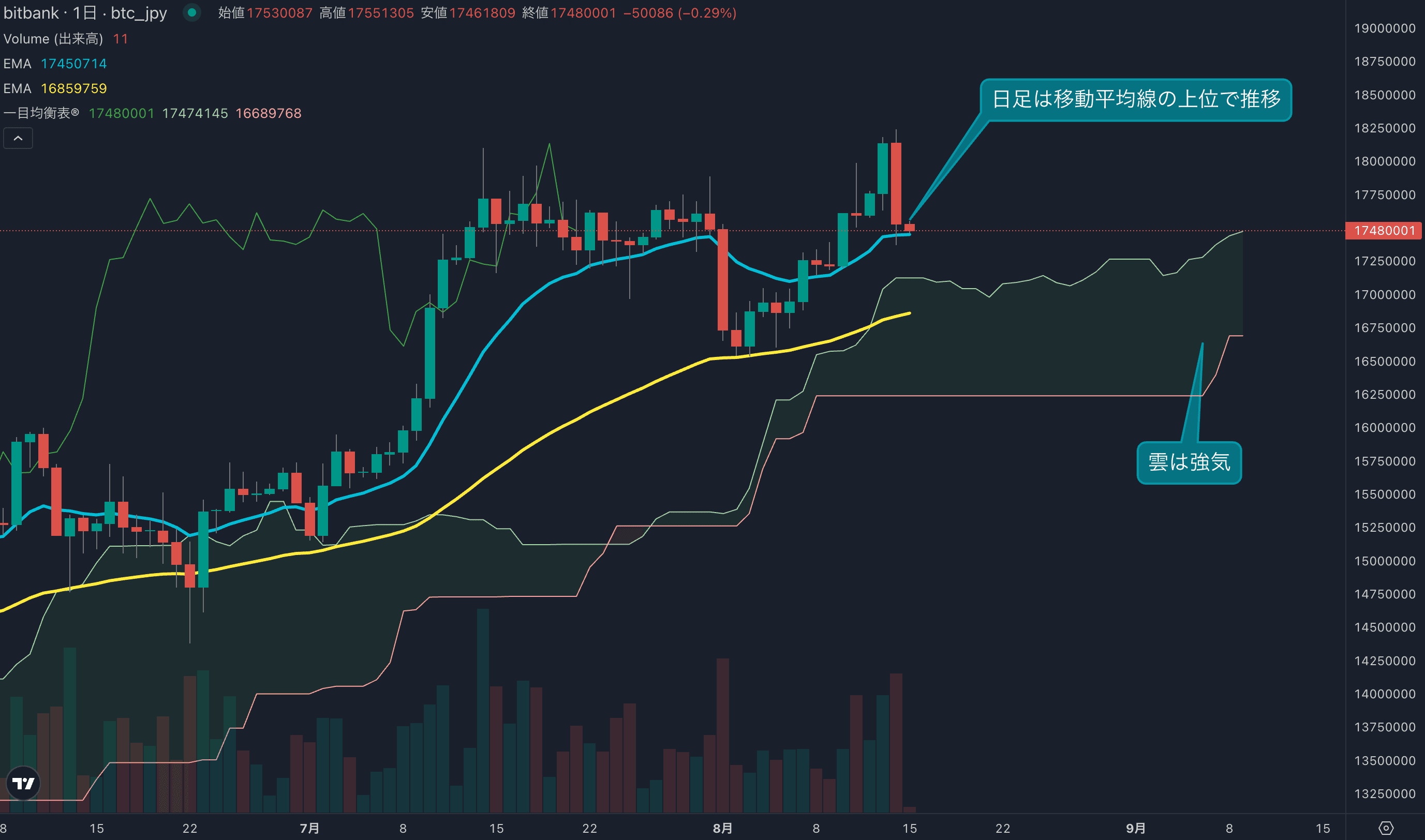 - 価格は14EMA(1744万円)を上回り強気示唆です。53EMA(1683万円)は上昇しており、長期トレンドも強気に傾いています。一目均衡表の雲は先行スパン1(1744万円)が先行スパン2(1668万円)を上回り強気示唆です。