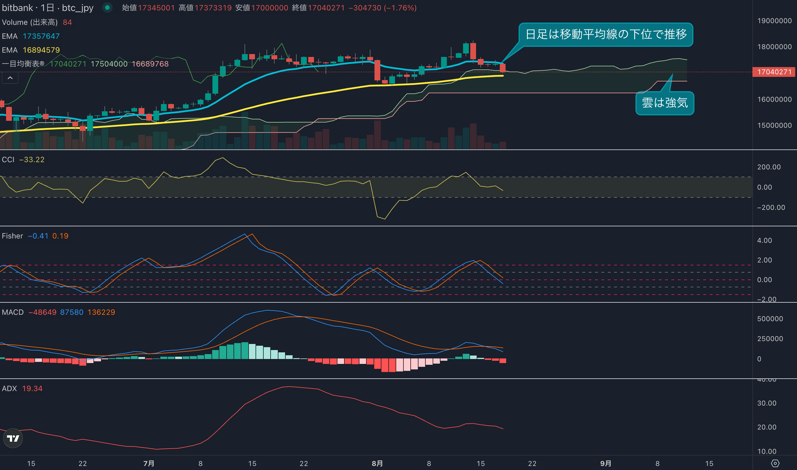 - 昨日のビットコインは0.1%上昇し、終値は1734万円でした。先週は、週の後半から移動平均線を下回る動きとなり、土日もほぼ横ばいと冴えない動きでした。週明けも売られる展開となっています。