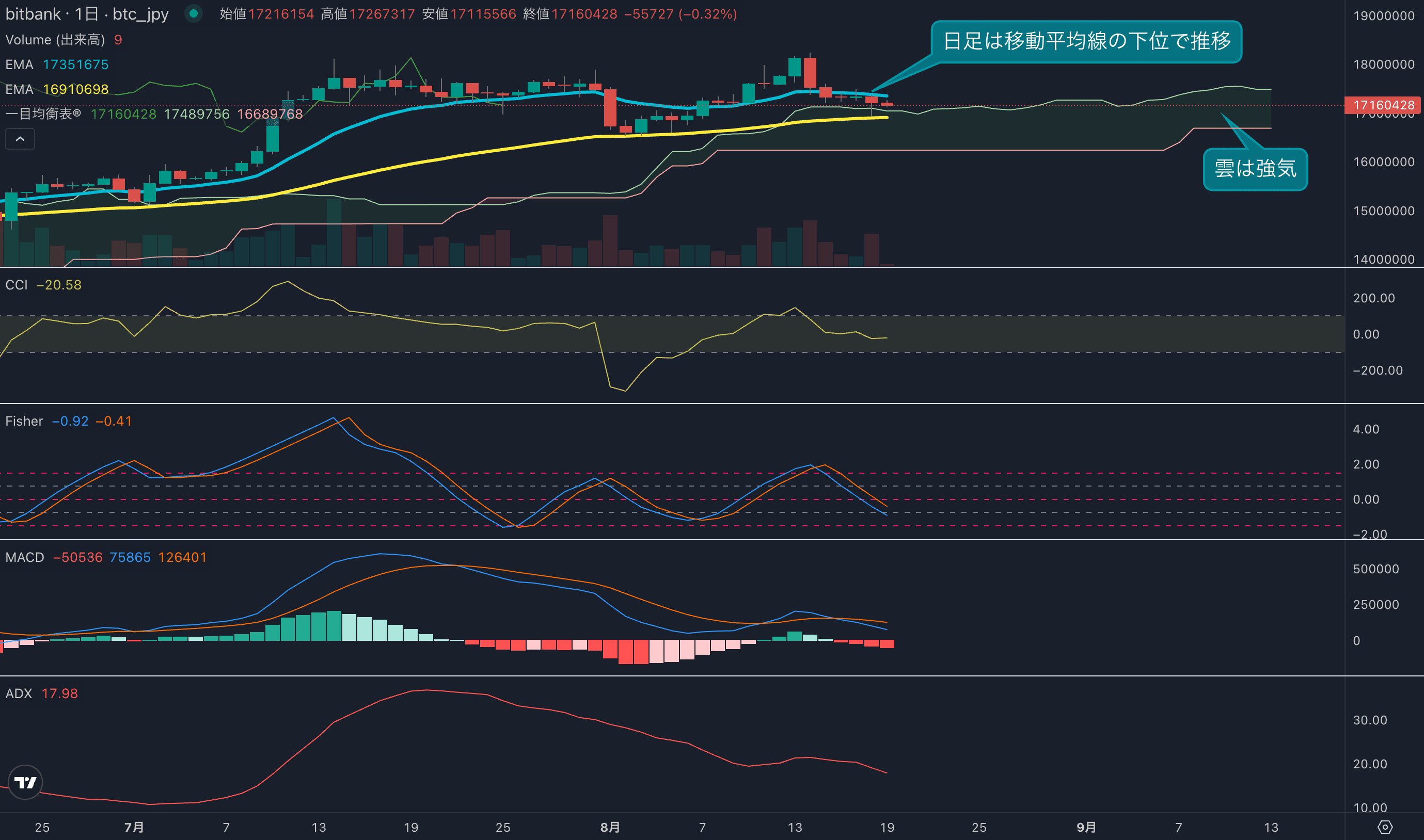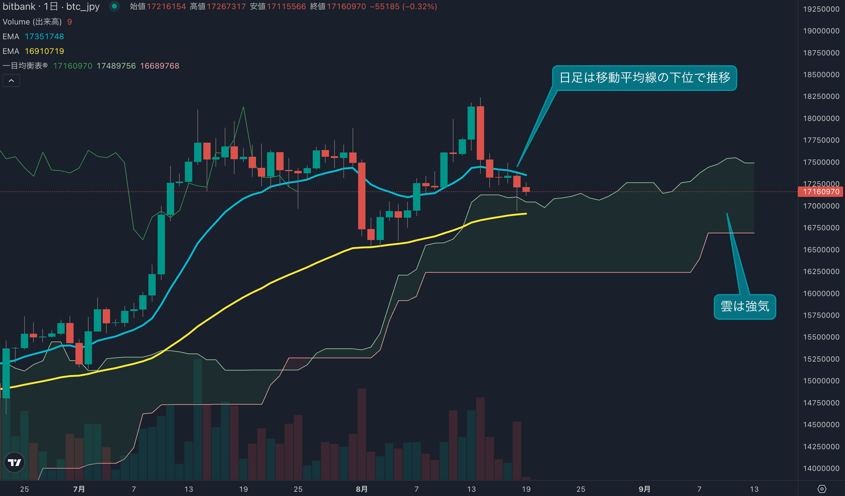 - 昨日のビットコインは0.7%下落し、終値は1721万円でした。今週の月曜日は売りが強い相場となり、一時1700万円を割り込む動きも見られました。終値にかけて買い戻しも入りましたが、日足は移動平均線の下位を維持しています。