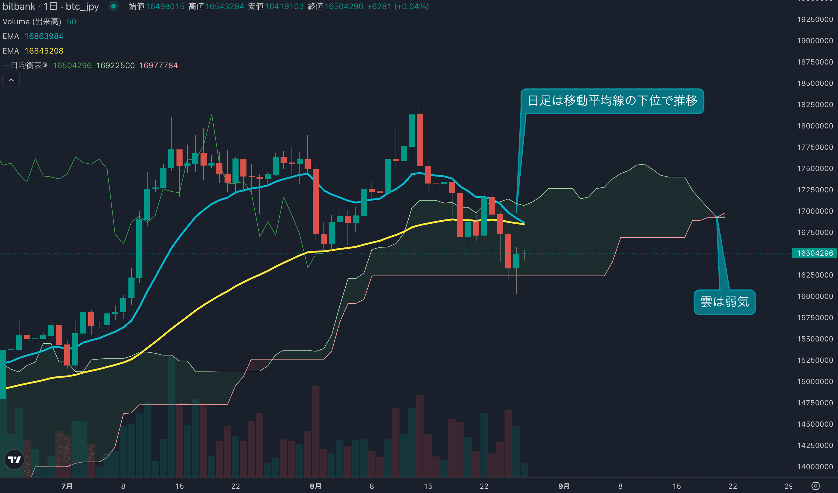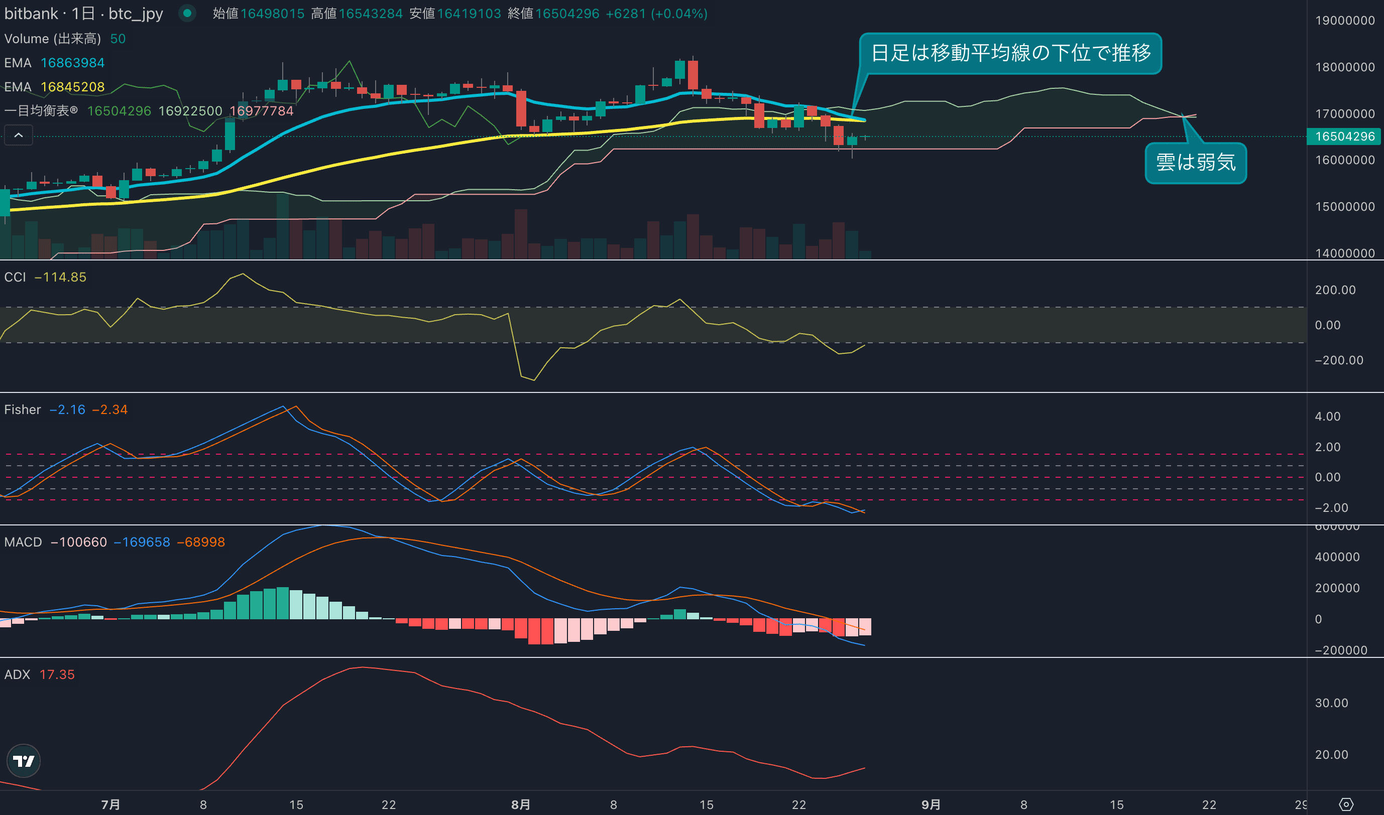 - 昨日のビットコインは1.0%上昇し、終値は1649万円でした。一時1600万円に迫る動きもありましたが、終値にかけて買い戻されました。日足は一目均衡表の雲の中を維持しています。
