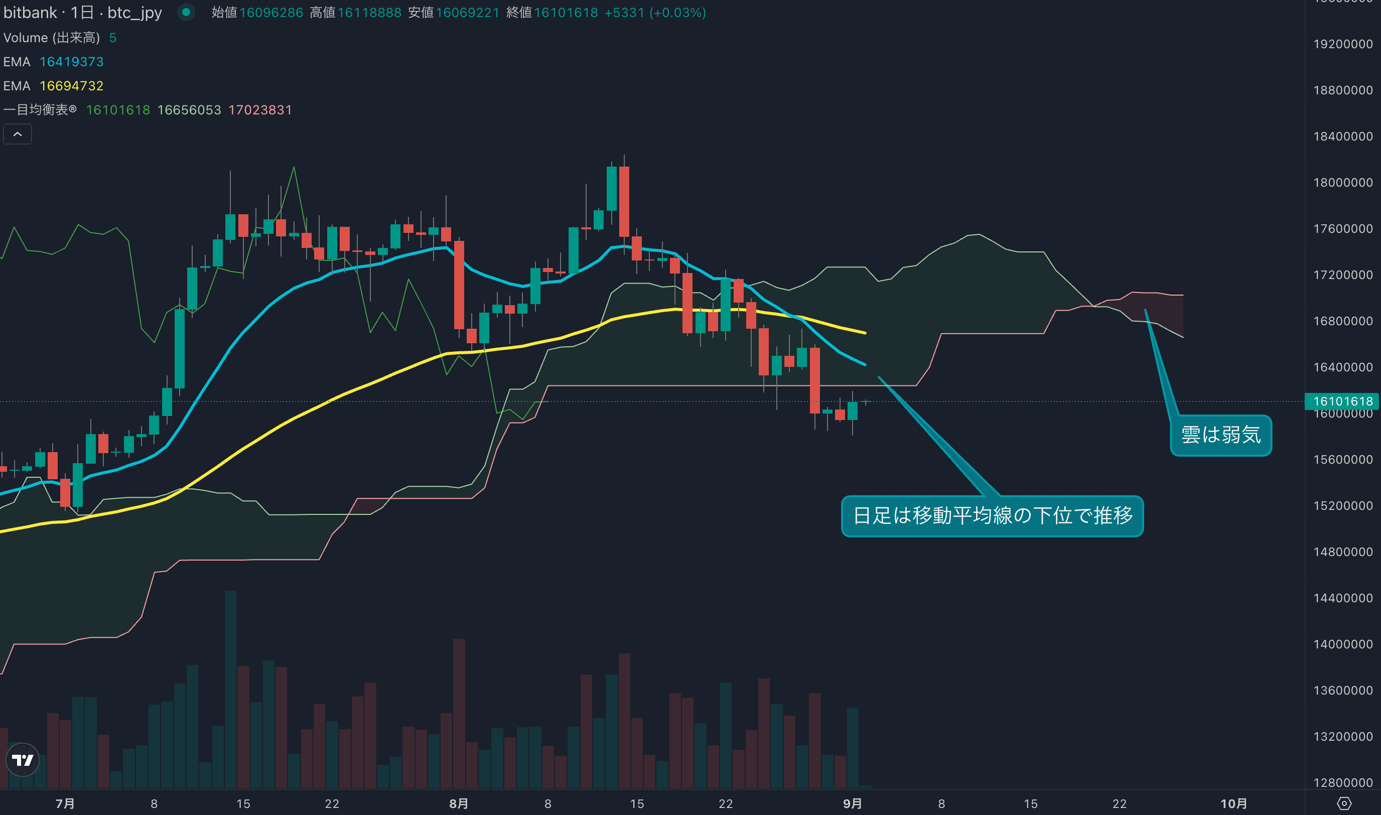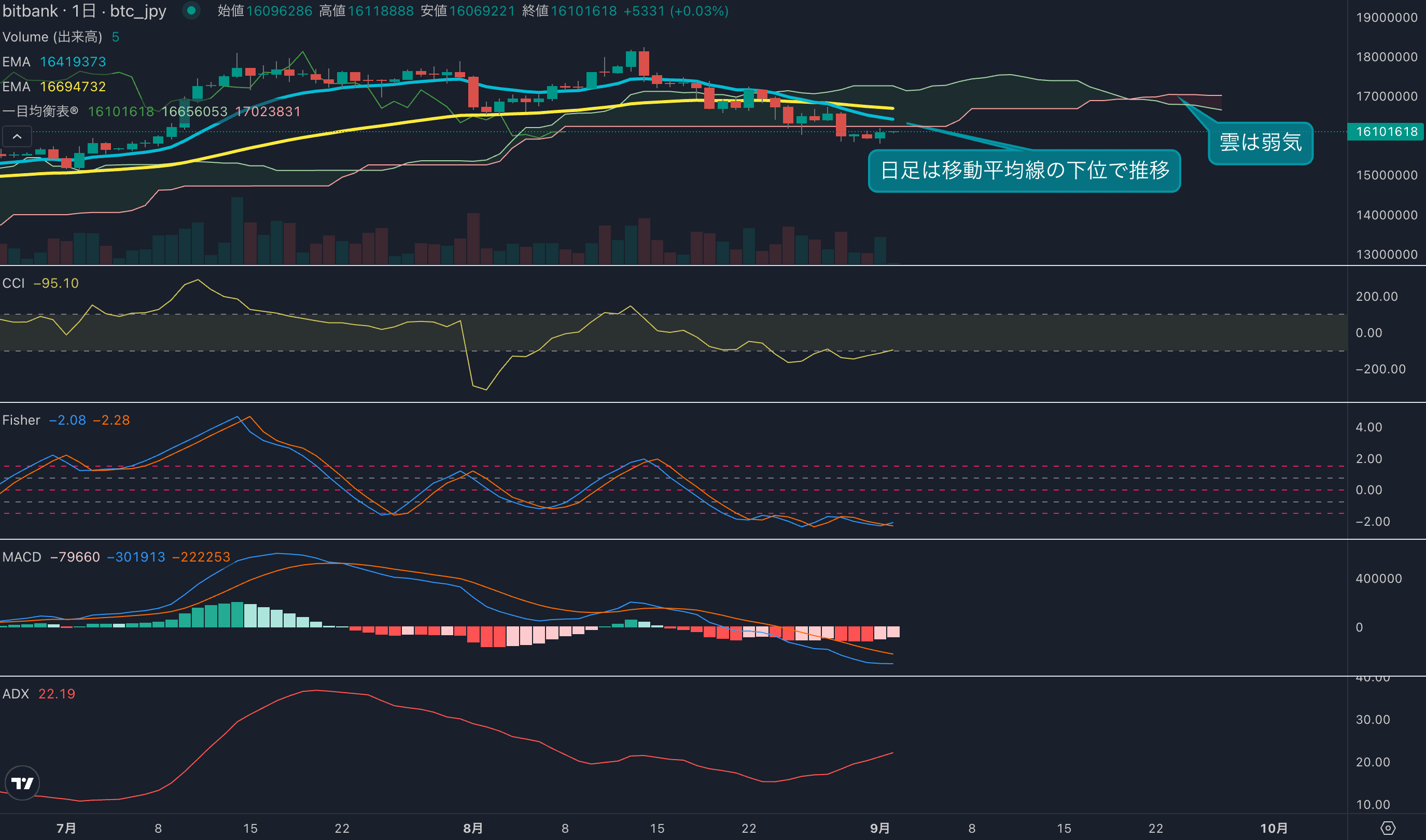 - 昨日のビットコインは0.9%上昇し、終値は1609万円でした。今週の始めの相場はプラスとなり、1600万円台を回復しました。日足は依然として移動平均線の下位で推移し、弱い値動きとなっています。