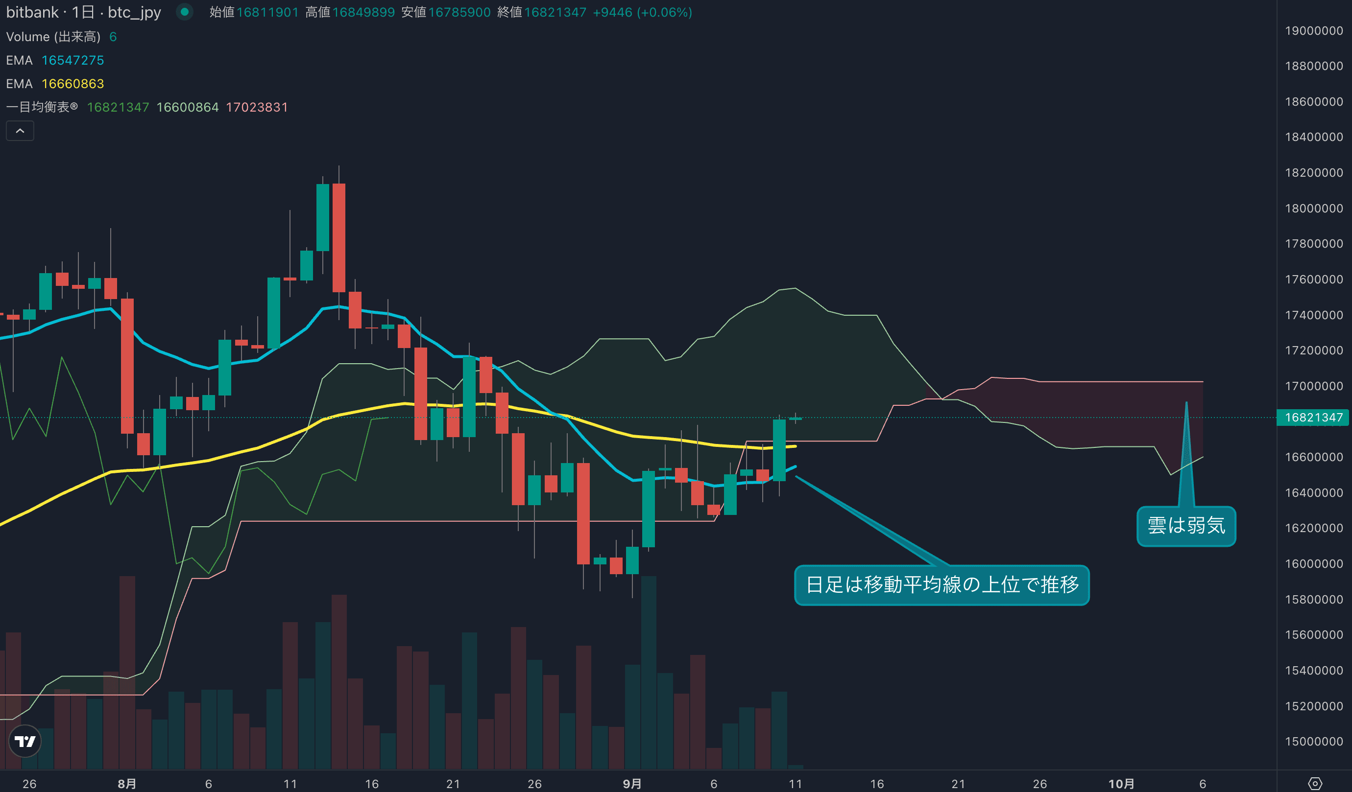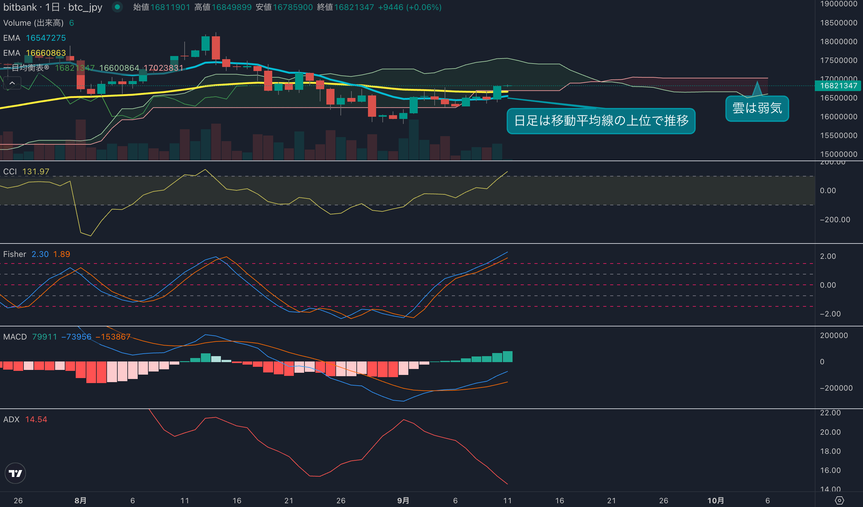 - 昨日のビットコインは2.1%上昇し、終値は1681万円でした。日足は長期移動平均線を上回りました。ここ2週間の高値となり、買いが強い状況です。