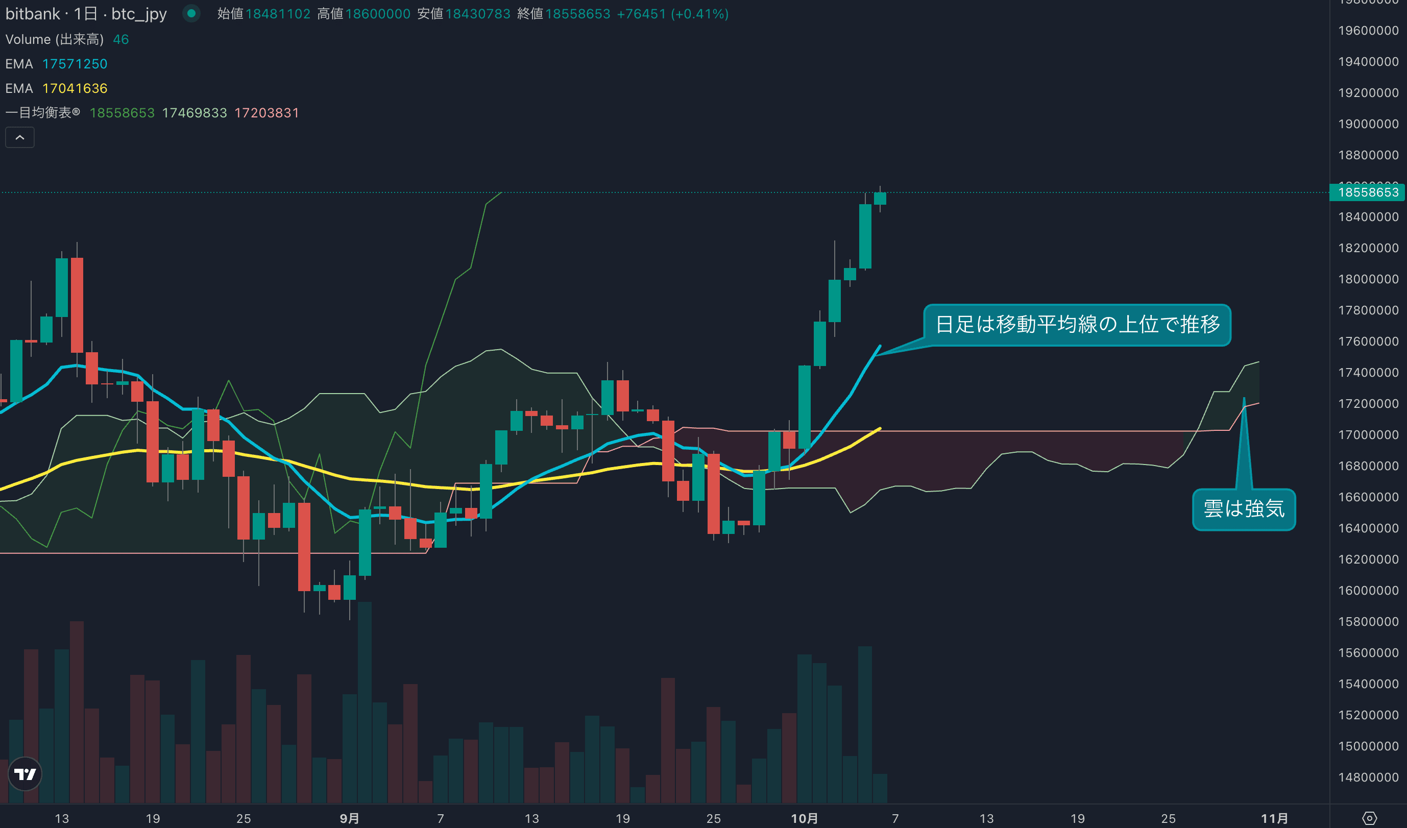 - 先週のビットコイン週足は10.2%上昇し、過去最高値を更新しました。価格は1800万円台に突入し、8月2週目に記録した高値を上回りました。10月に入り買いが強い状況となり、テクニカル的には上昇トレンドの発生が示唆されています。ADXは久々に20を超えており、上方向へのボラティリティが上がっていることを示しています。今週も強い値動きが想定され、買いポイントを探る相場となるでしょう。
