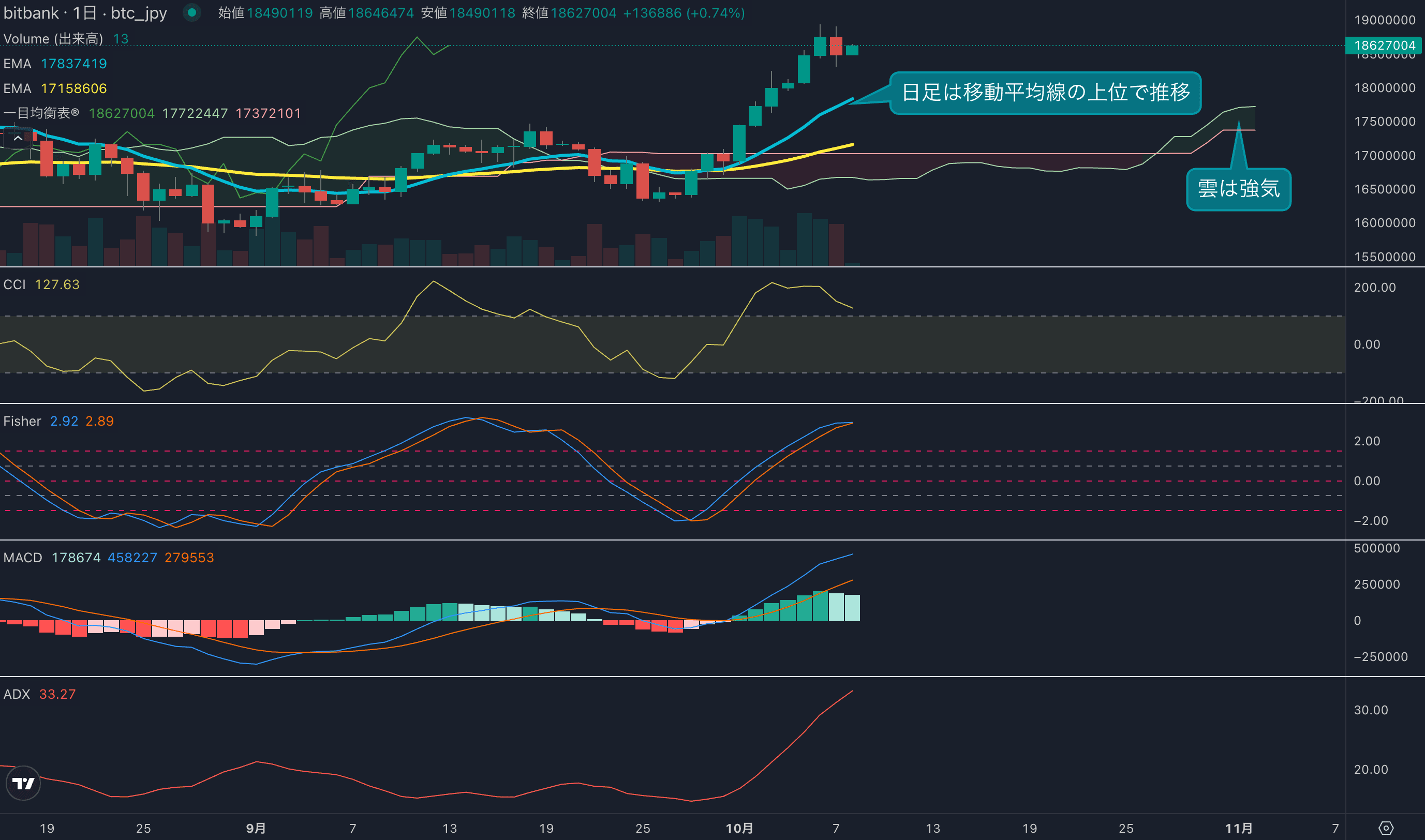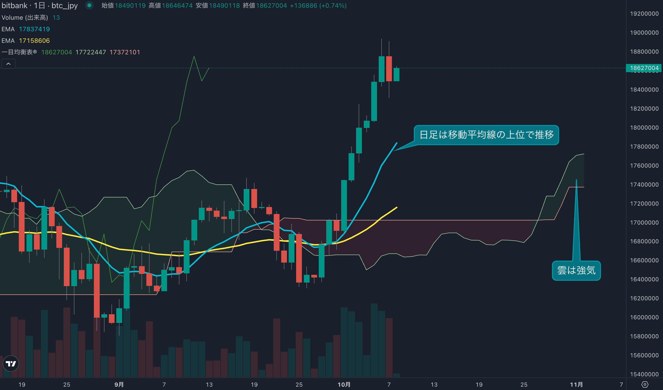 - 価格は14EMA(1710万円)を上回り強気示唆です。53EMA(1771万円)は上昇しており、長期トレンドも強気です。一目均衡表の雲は先行スパン1(1770万円)が先行スパン2(1737万円)を上回り強気示唆です。