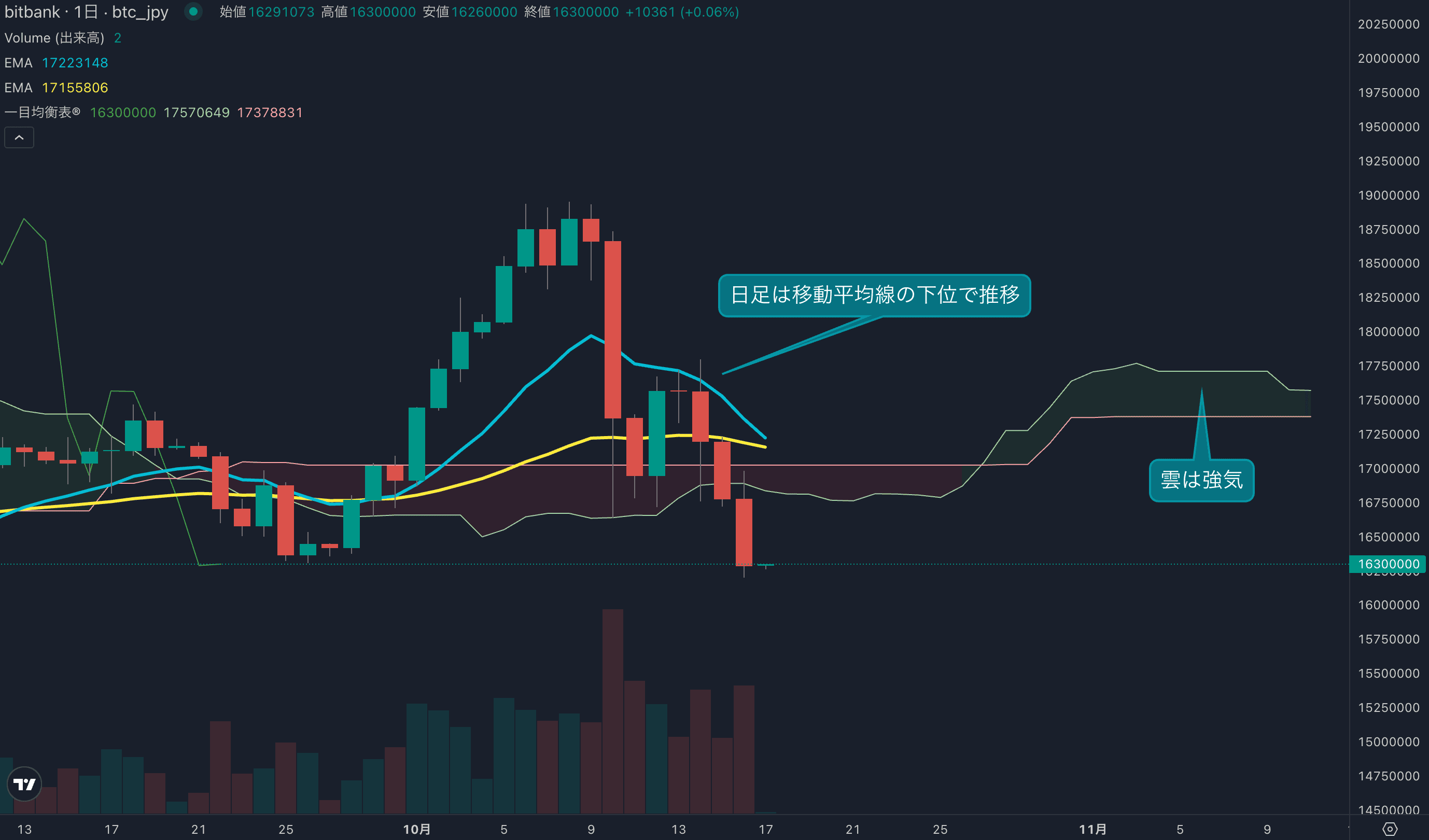 - 価格は14EMA(1736万円)を下回り弱気示唆です。53EMA(1718万円)は下落しており、長期トレンドも弱気です。一目均衡表の雲は先行スパン1(1757万円)が先行スパン2(1737万円)を上回り強気示唆です。