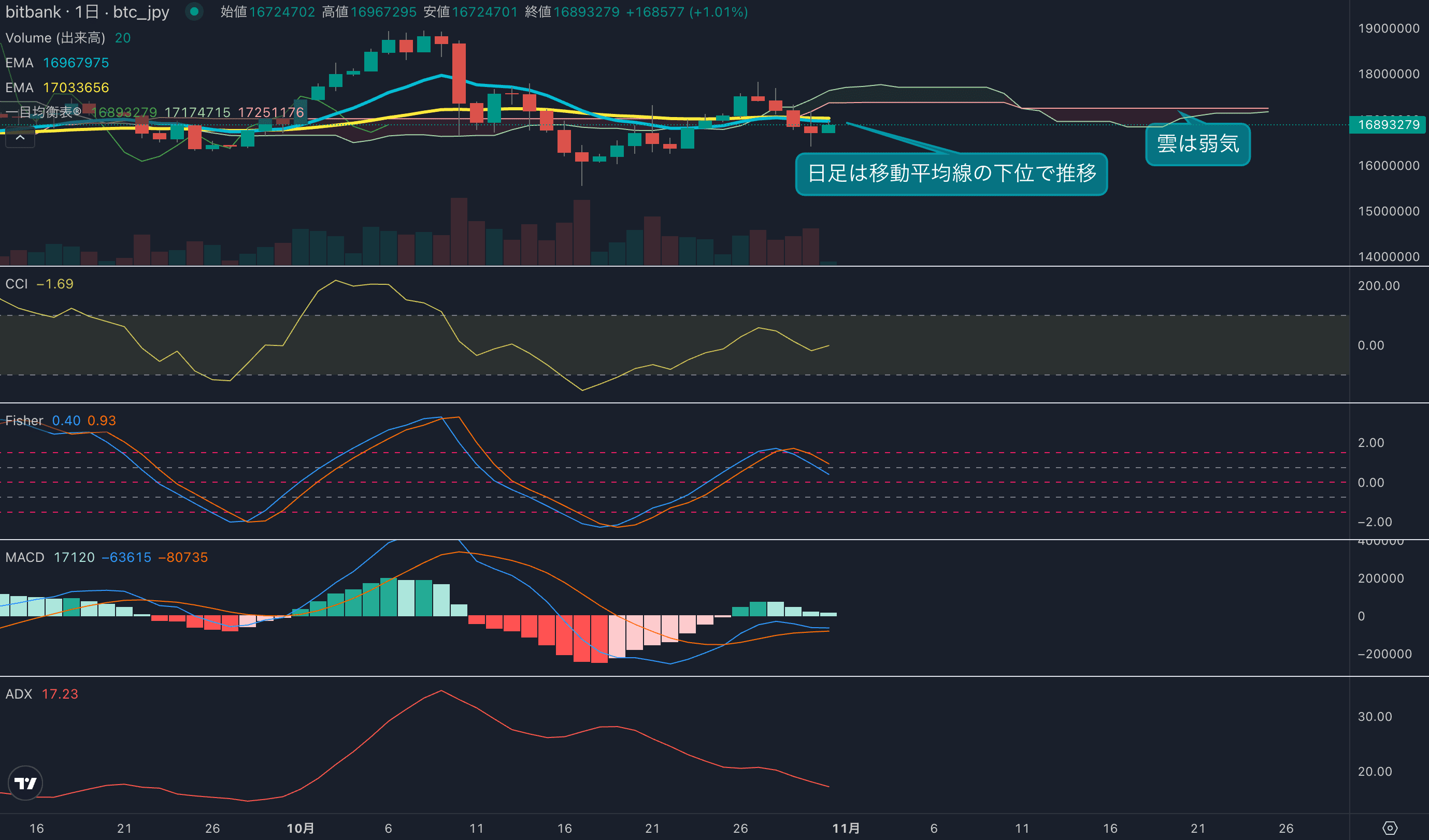 - 今週のビットコイン日足は全てマイナスとなっており、先週の上昇分のほとんどを戻す動きとなりました。10月の最終週は売りに押され、月足でも小幅にマイナスを記録しています。短期のオシレーターはマイナス圏入り、下落トレンド入りを意識せざるを得ないチャートが形成されています。一方ADXは下落しており、まだ下落方向へのボラティリティの上昇には至っていません。今月の安値は1600万円近辺となっており、ここを割り込んでいないことはまだプラス材料と言えます。1600万円を再度割り込むような動きがあれば、下落トレンド入りがさらに意識され売りが加速する可能性があります。来週は11月に入り相場が反転するか注目の1週間となるでしょう。