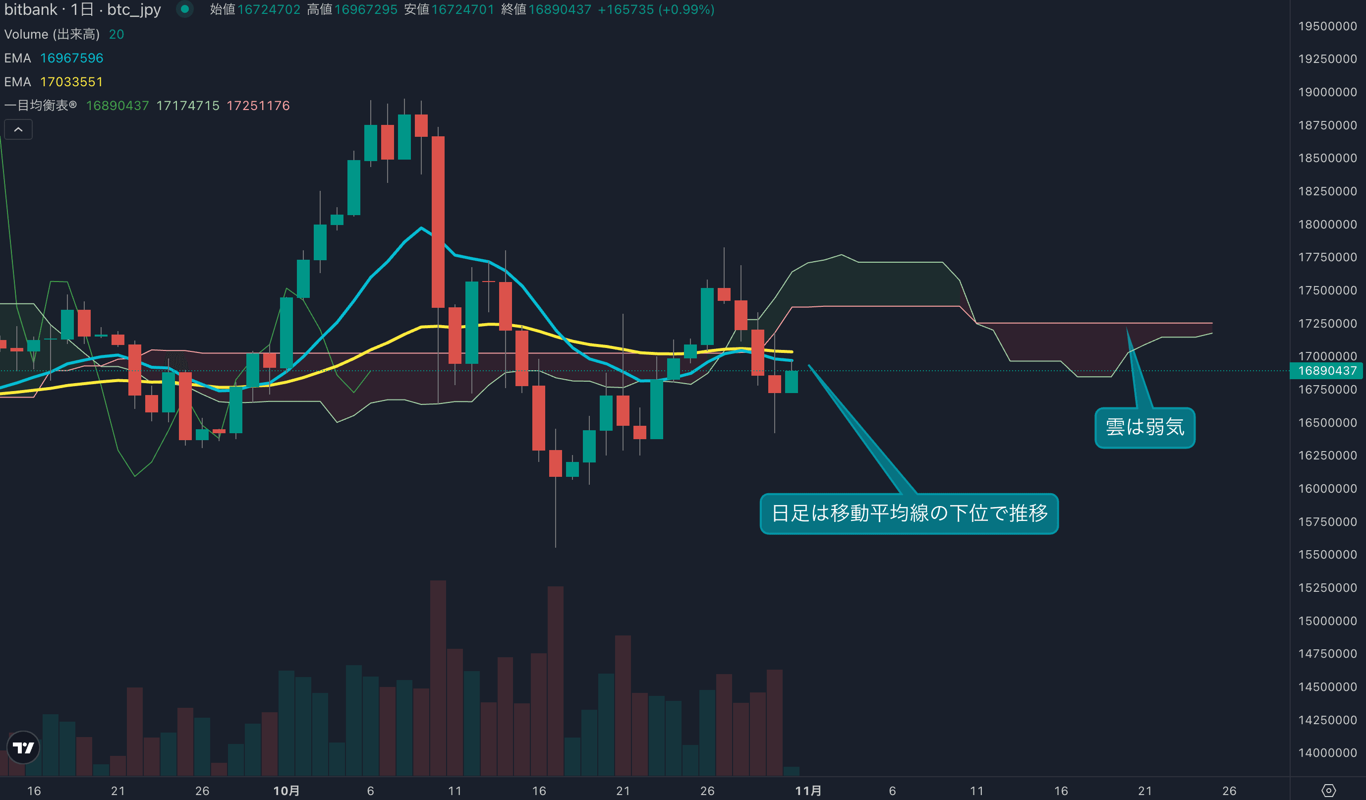 - 価格は14EMA(1697万円)を下回り弱気示唆です。53EMA(1703万円)は横ばい推移しており、長期トレンドは中立です。一目均衡表の雲は先行スパン1(1714万円)が先行スパン2(1725万円)を下回り弱気示唆です。