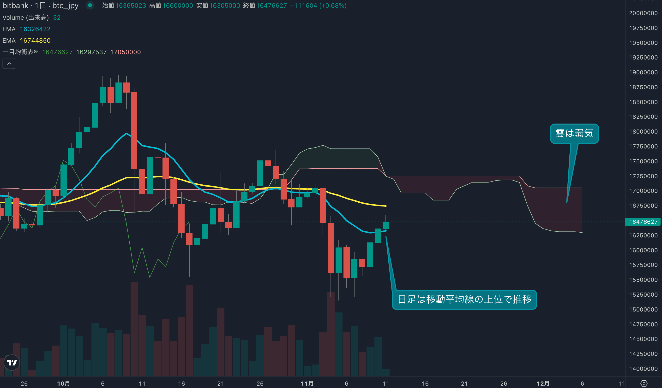 - 昨日のビットコインは1.4%上昇し、終値は1636万円でした。日足は3日連続の陽線となり、足元では買い戻しが見られます。昨日は短期移動平均線を僅かに上回り、強気の値動きとなりました。