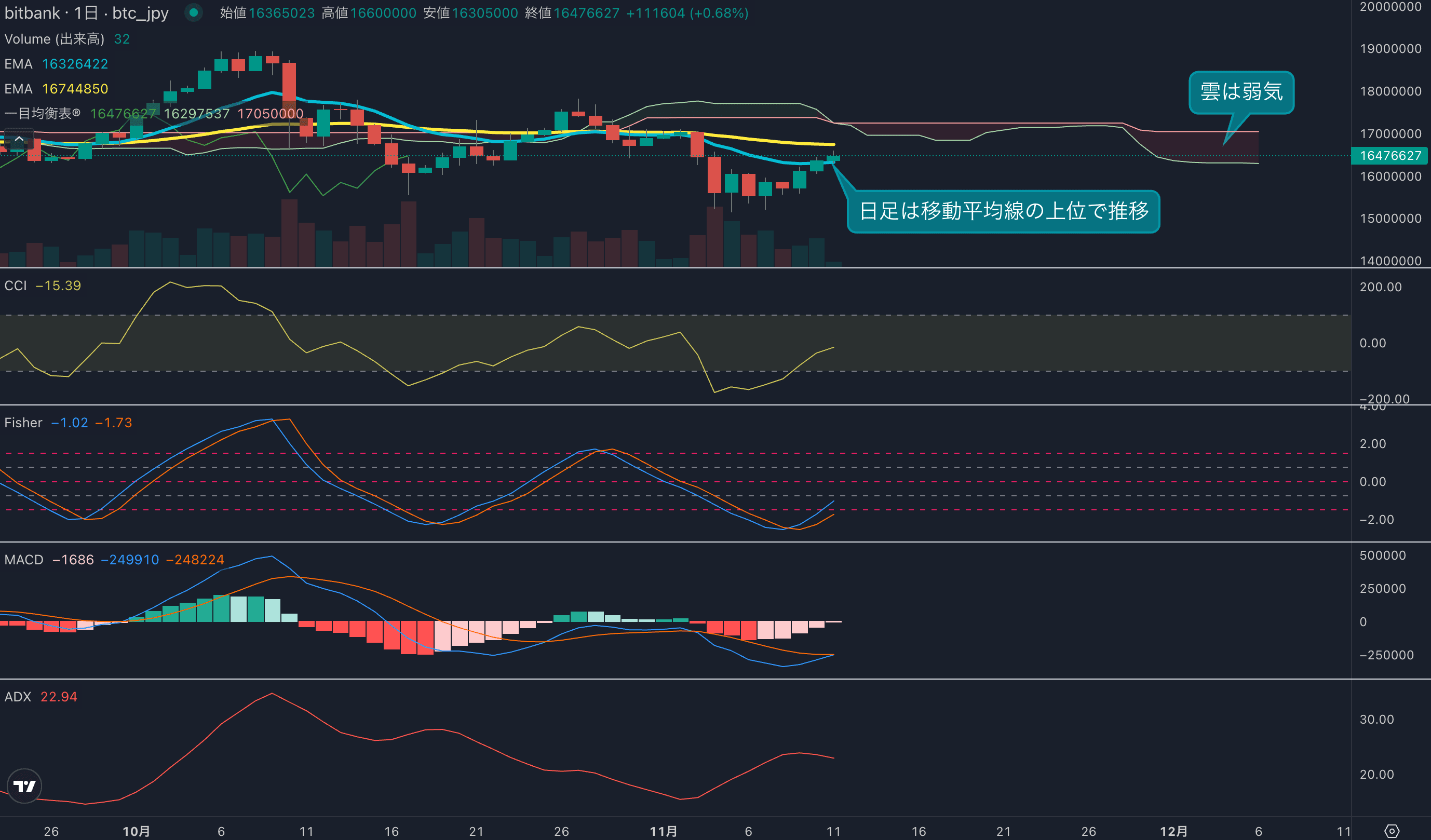 - 今週のビットコインは底堅い動きが見られ、買い戻しの流れとなっています。オシレーターも短期で上昇し、相場のモメンタムが回復しています。昨日の高値は1644万円となり、本日は1650万円台を回復できれば相場の雰囲気はさらに良くなるでしょう。価格は移動平均線の上位で推移しており、今週は相場のトレンド反転があるか注目です。