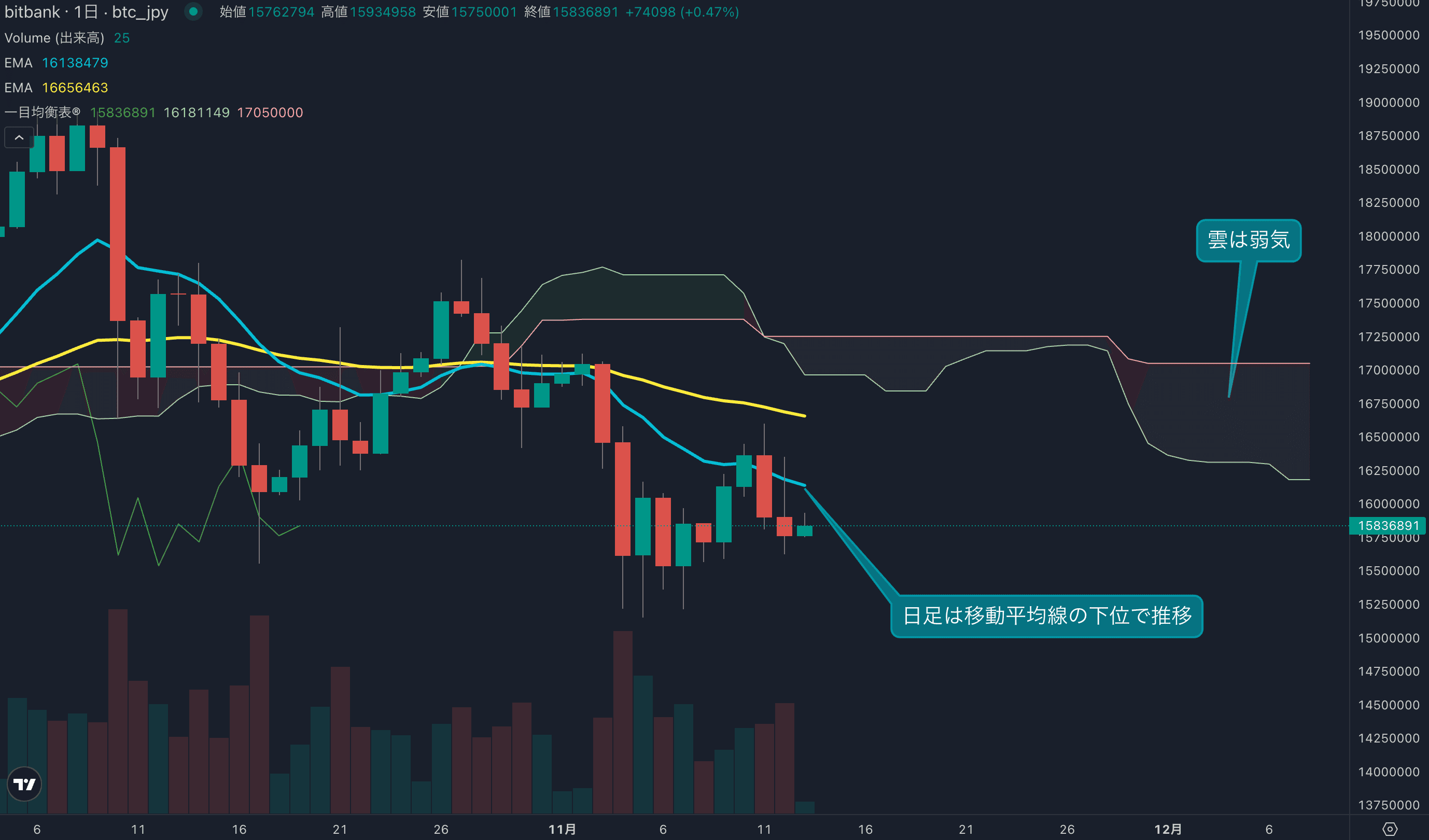 日足は2日連続の陰線を記録、価格は1600万円手前で推移