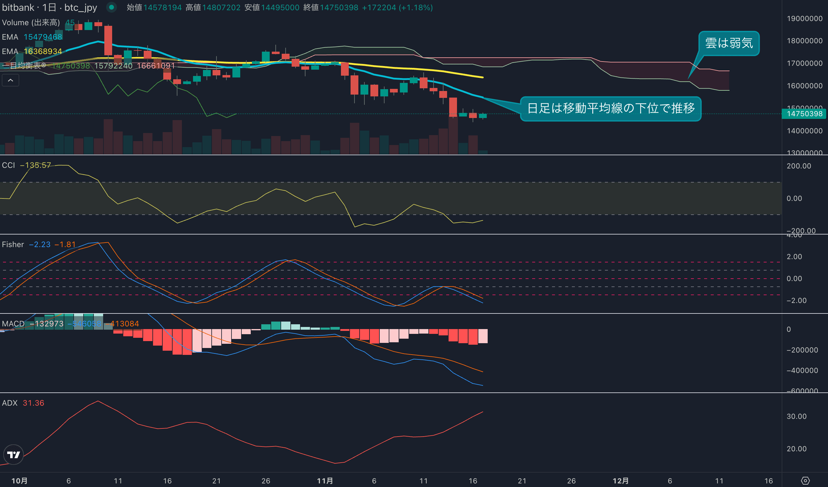- 価格は14EMA(1559万円)を下回り弱気示唆です。53EMA(1643万円)は下落傾向で、長期トレンドも弱気です。一目均衡表の雲は先行スパン1(1579万円)が先行スパン2(1666万円)を下回り弱気示唆です。