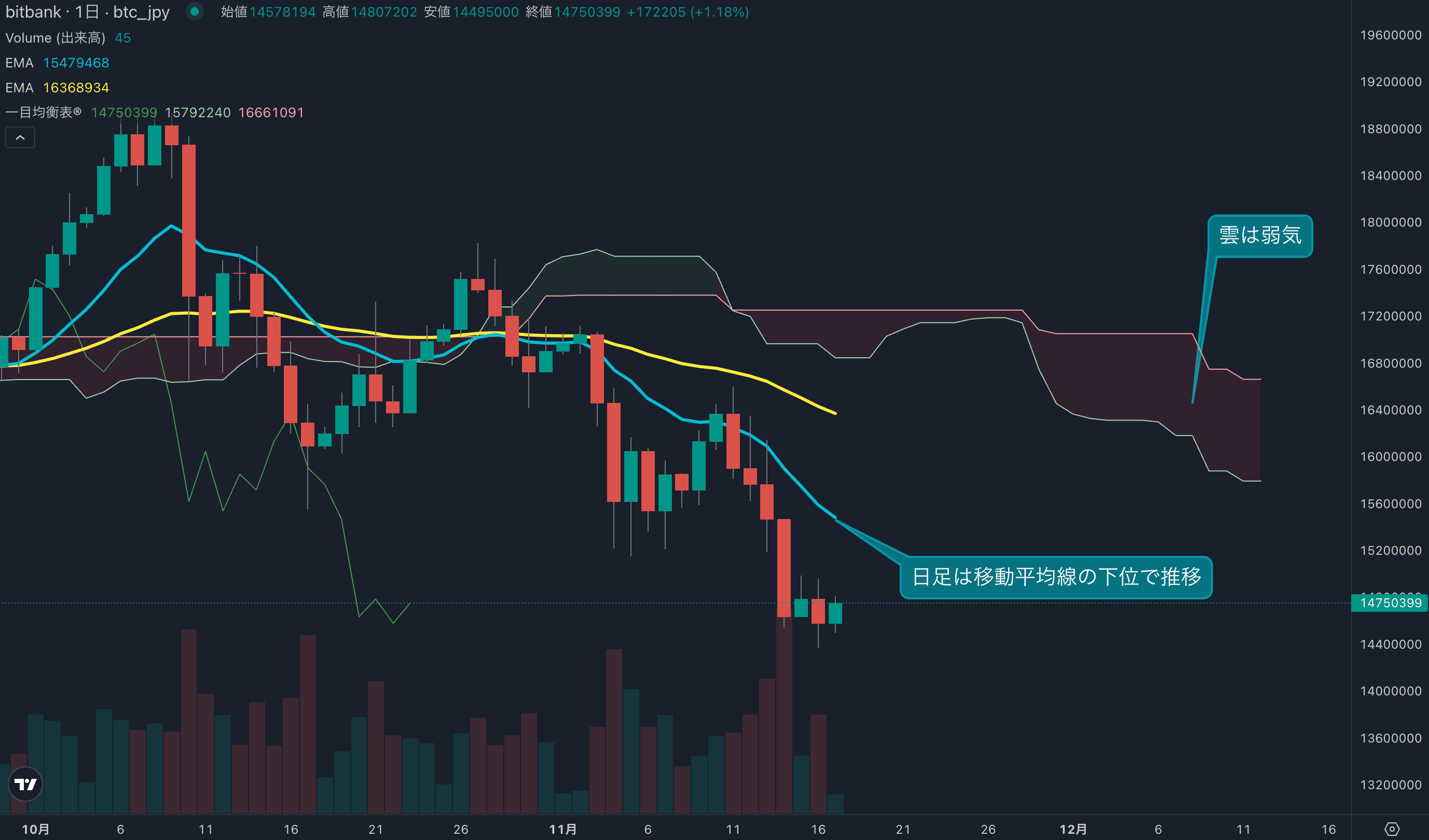 - 昨日のビットコインは1.4%下落し、終値は1457万円でした。土曜日は上昇したため、週末はほぼ横ばいの動きとなりました。日足は移動平均線から下に乖離し、かなり弱い値動きとなっています。