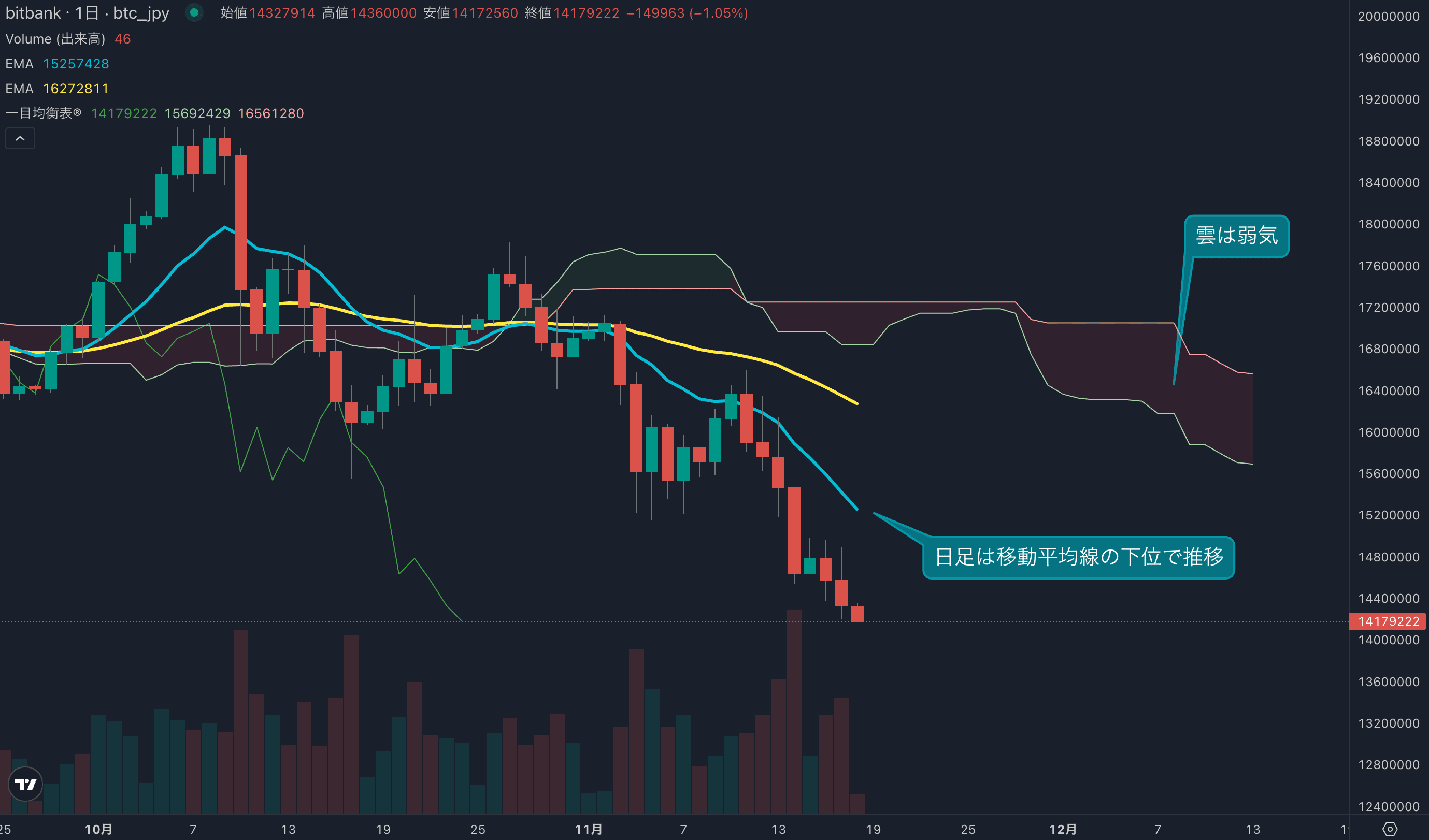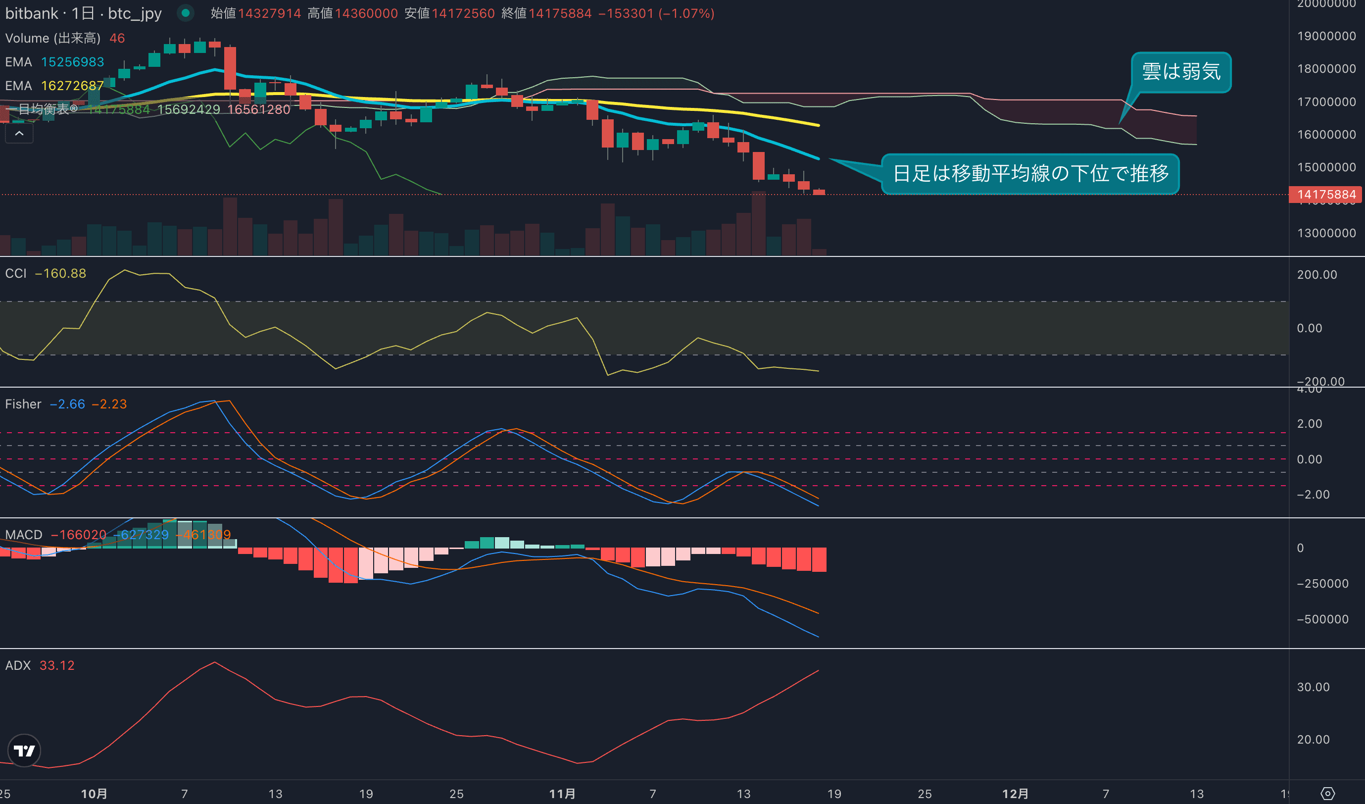 - 昨日のビットコインは1.7%下落し、終値は1432万円でした。日足は2日連続の陰線を記録しました。今週も月曜日から売られる展開となり、上値が重い状況となっています。日足は短期移動平均線から100万円ほど下に乖離しています。