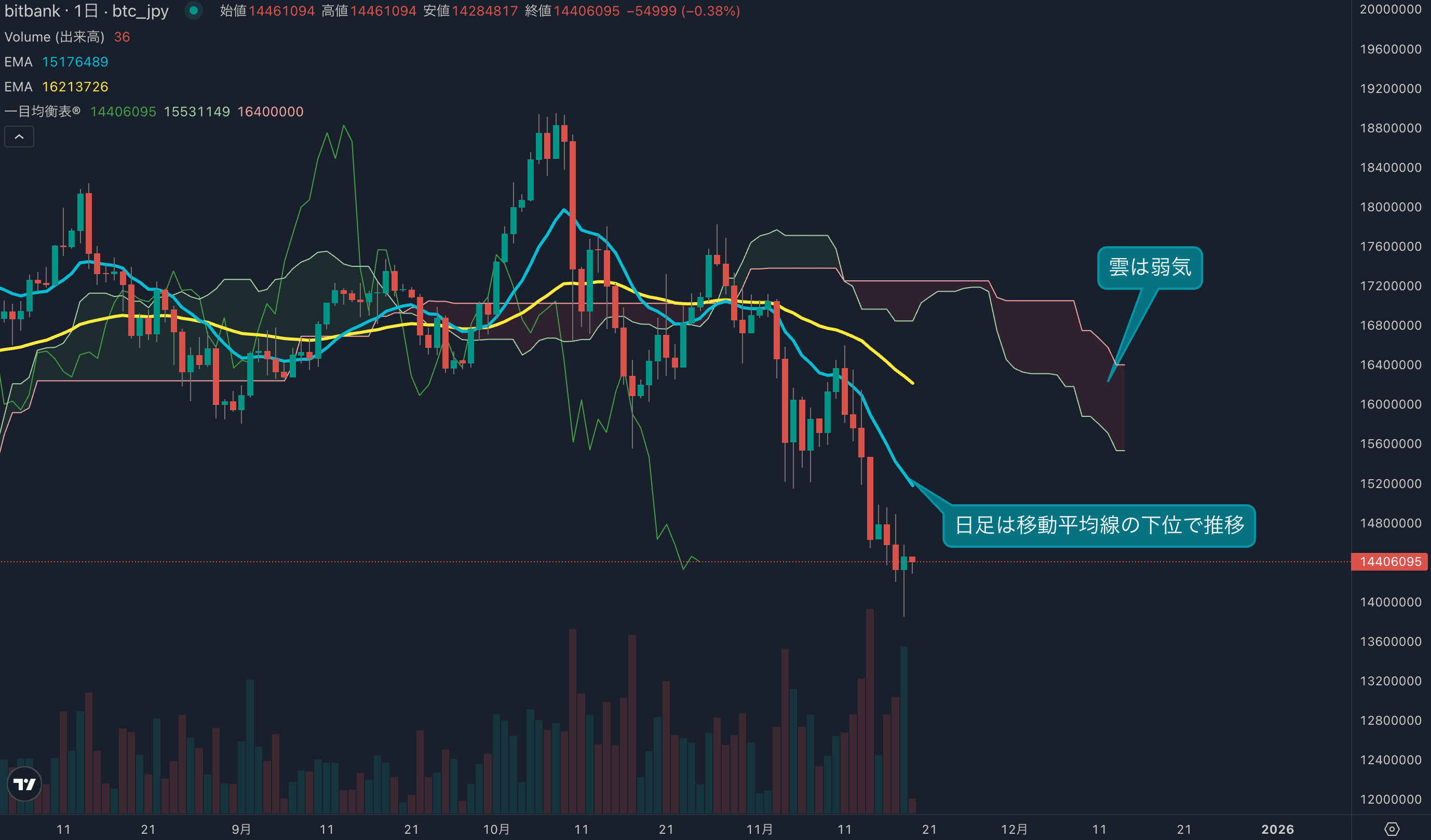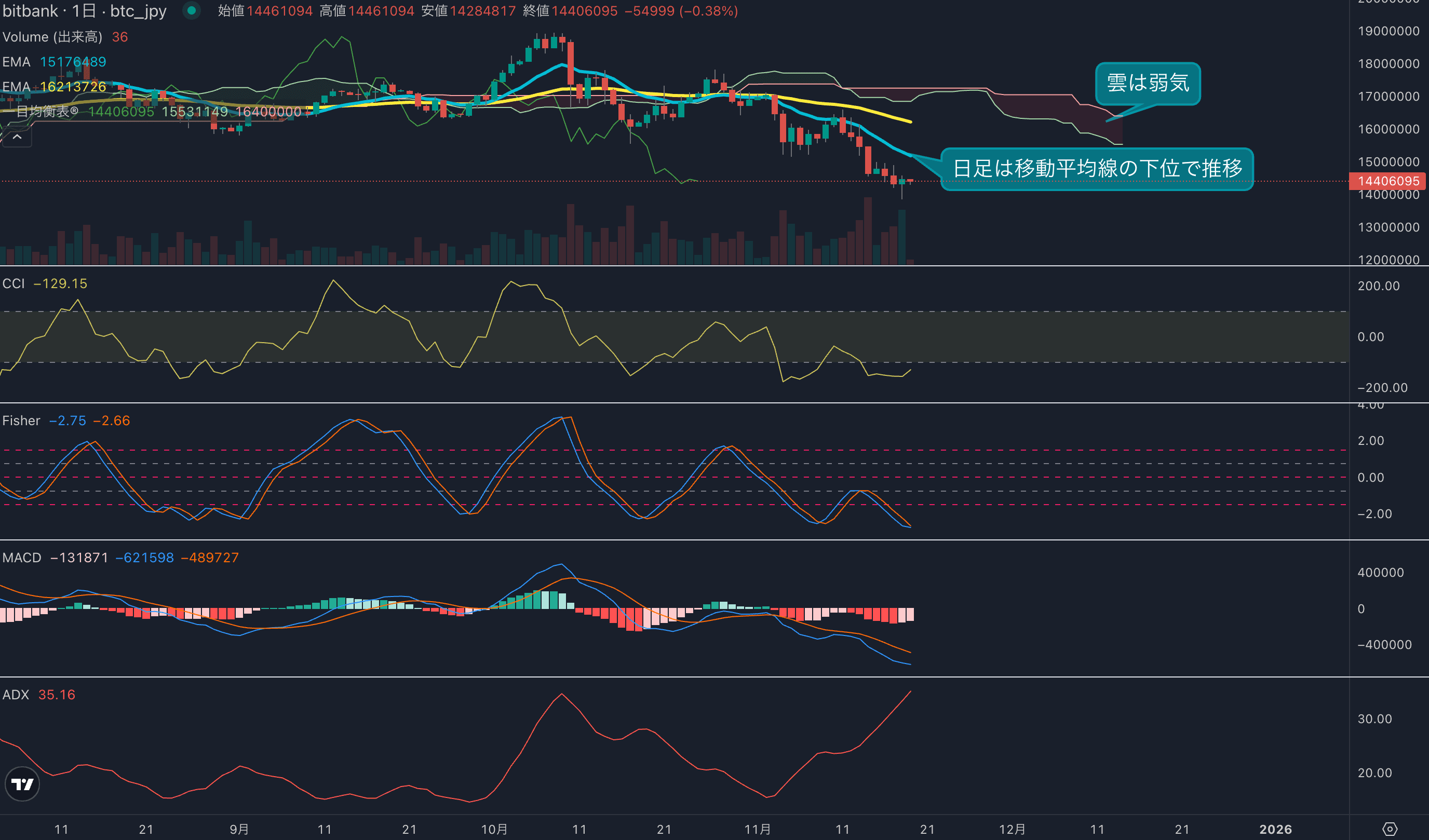 - 価格は14EMA(1529万円)を下回り弱気示唆です。53EMA(1628万円)は下落傾向で、長期トレンドも弱気です。一目均衡表の雲は先行スパン1(1553万円)が先行スパン2(1640万円)を下回り弱気示唆です。