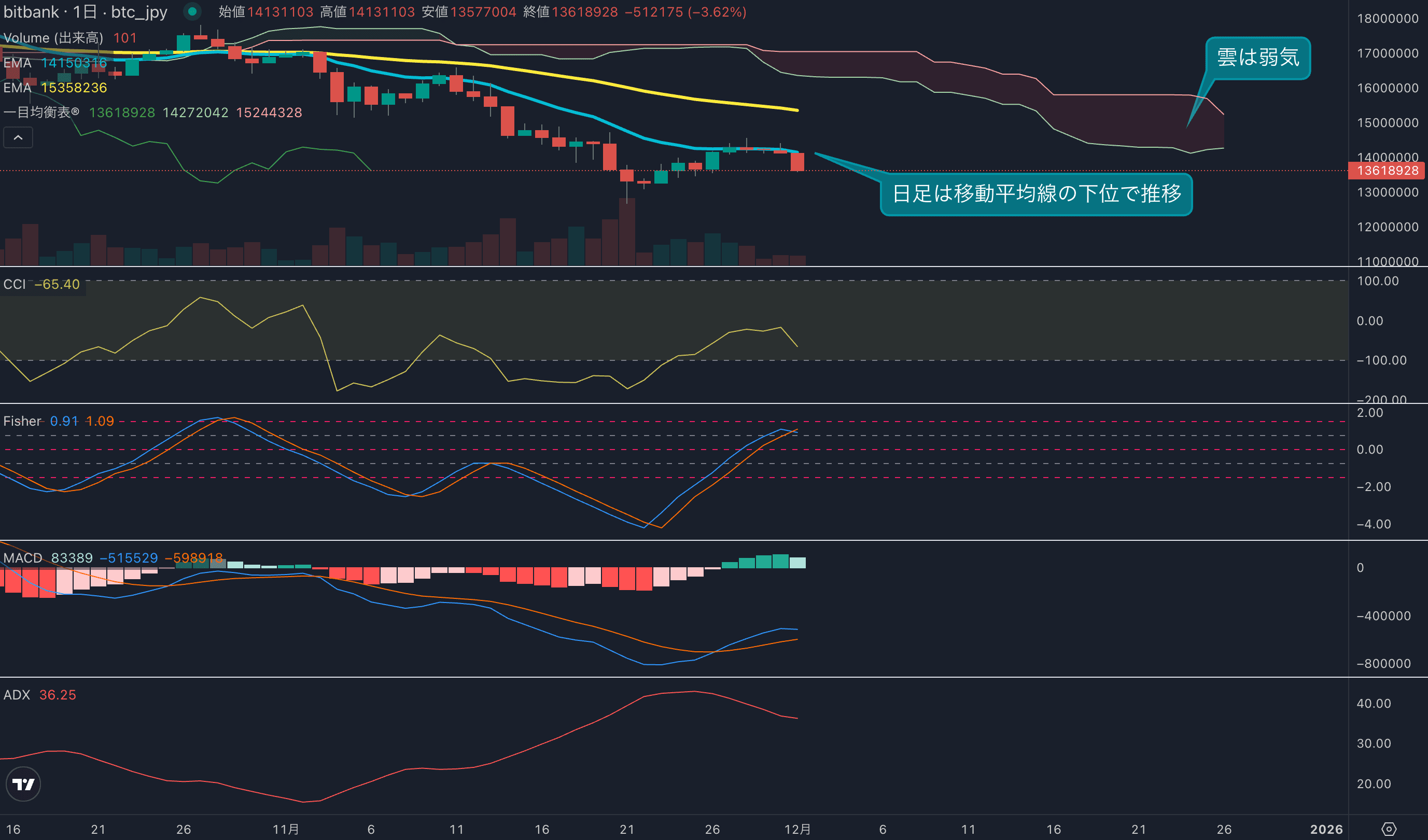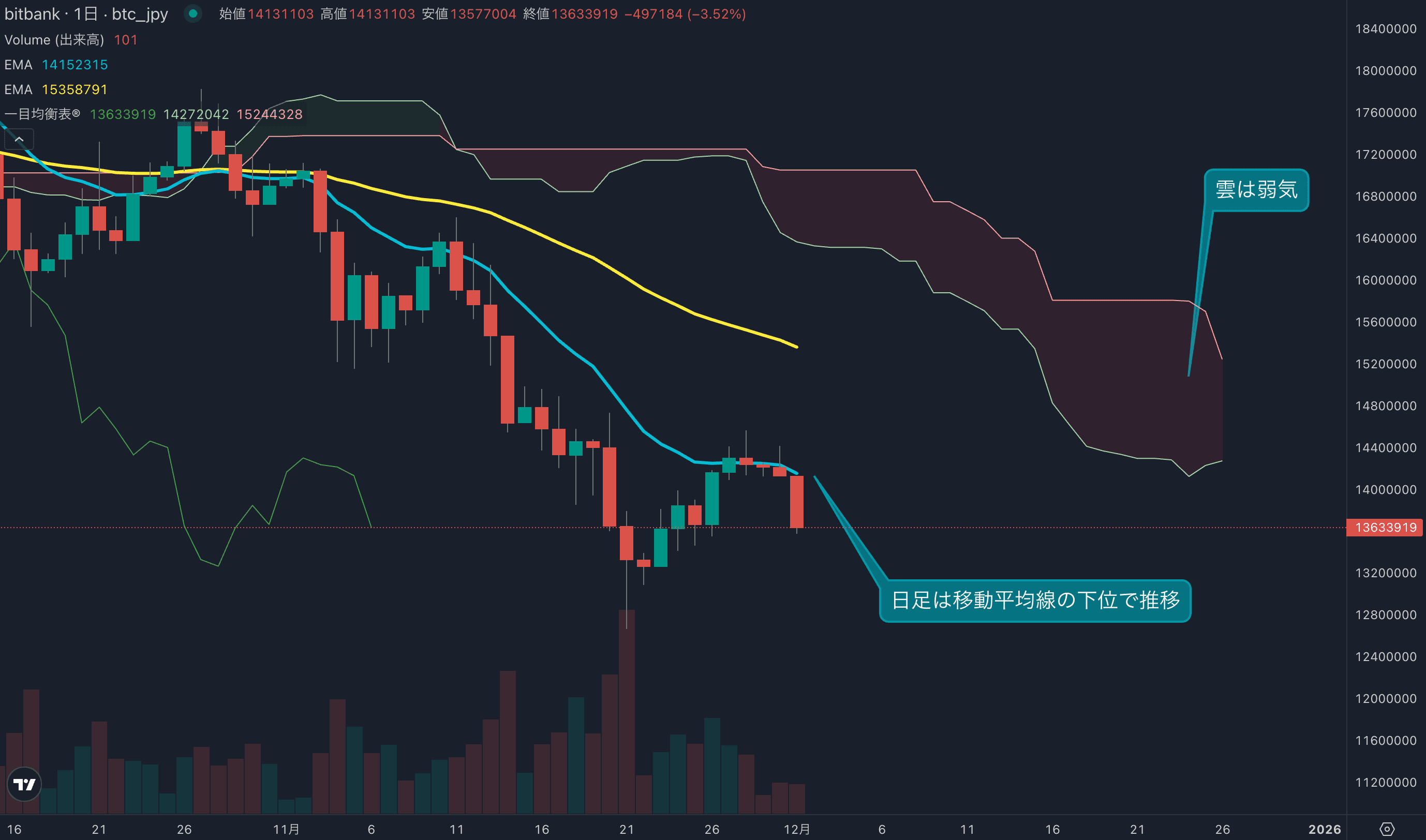 - 価格は14EMA(1423万円)を下回り弱気示唆です。53EMA(1542万円)は下落傾向で、長期トレンドも弱気です。一目均衡表の雲は先行スパン1(1422万円)が先行スパン2(1569万円)を下回り弱気示唆です。