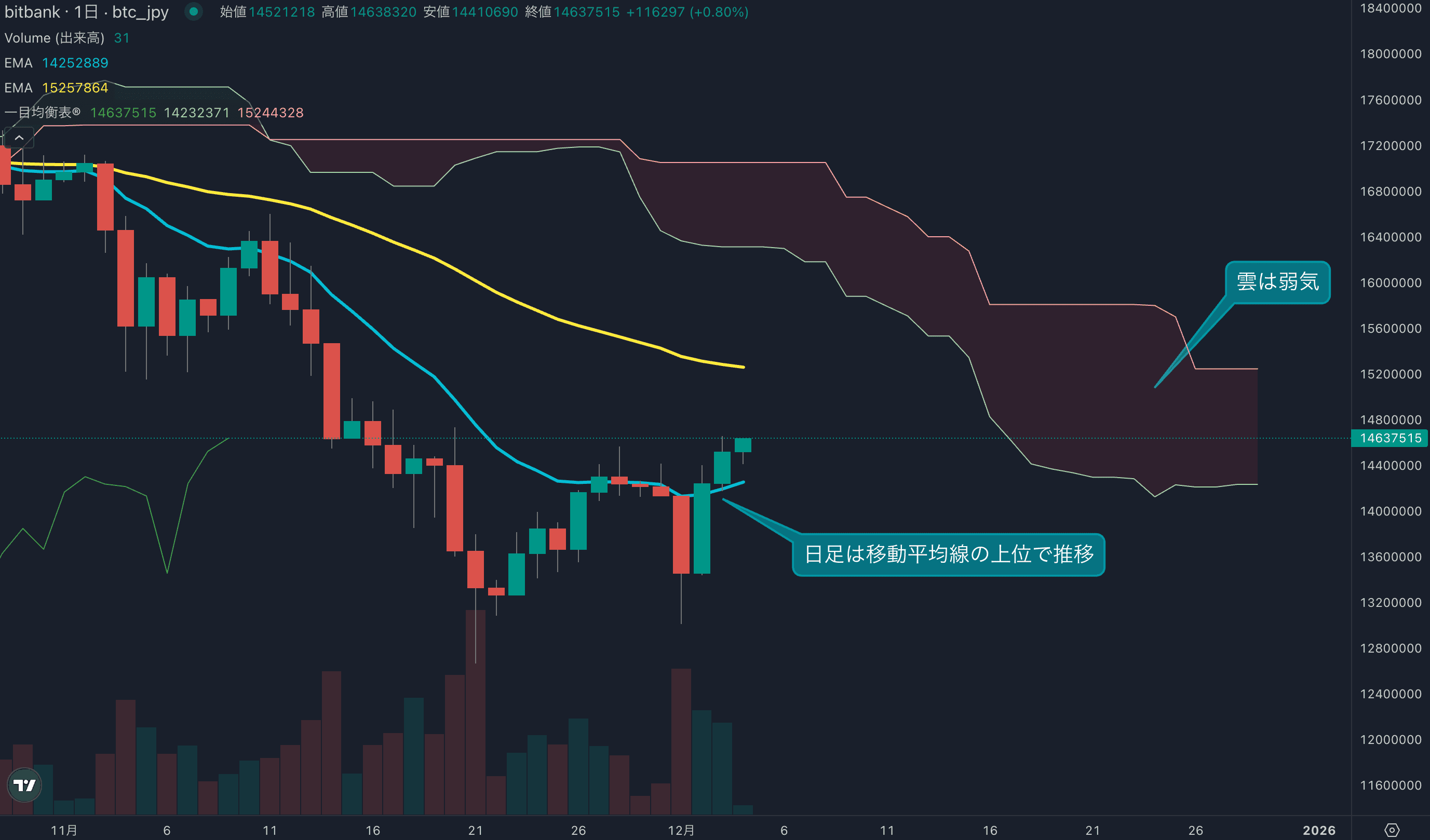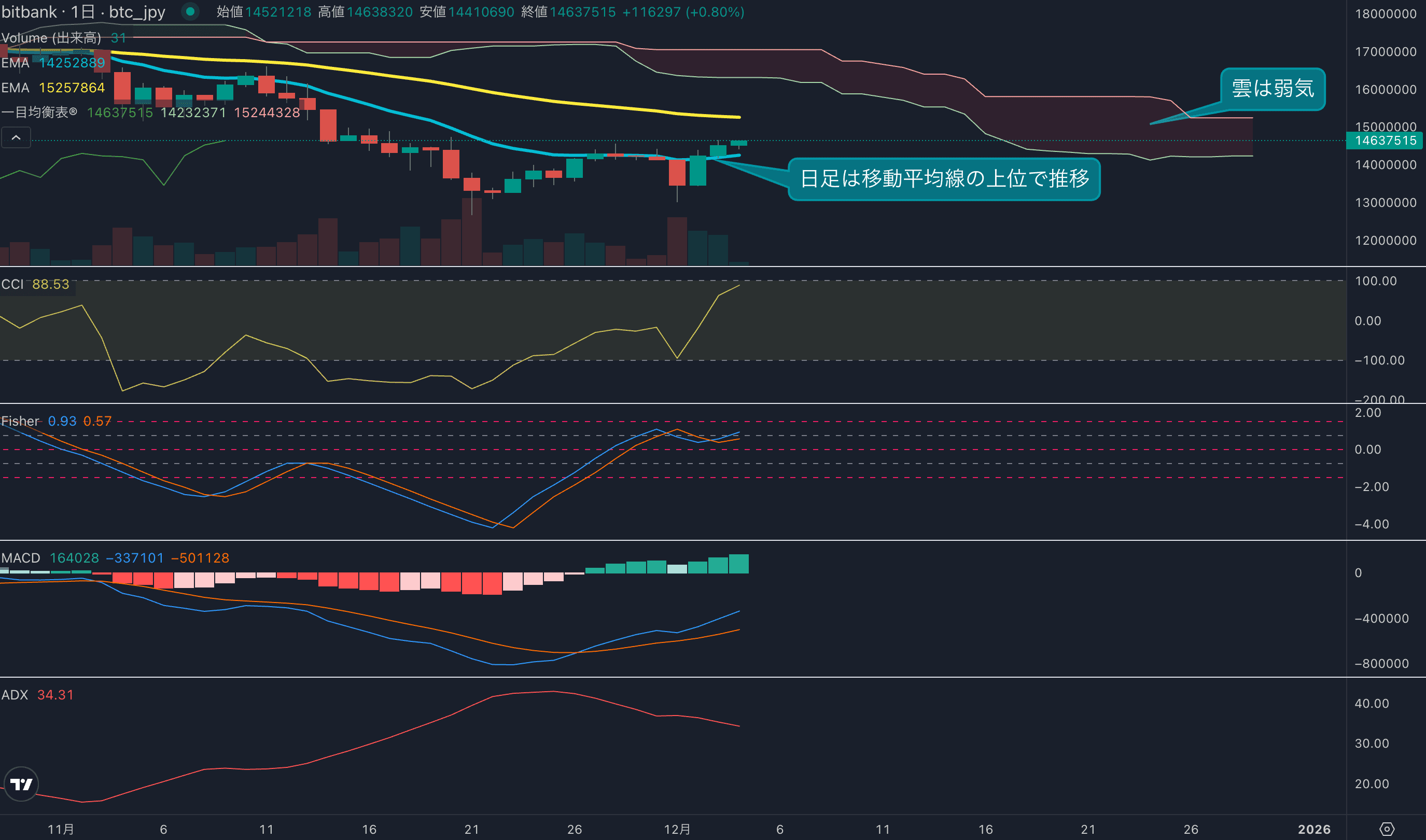 - 価格は14EMA(1419万円)を上回り強気示唆です。53EMA(1528万円)は下落傾向で、長期トレンドは弱気です。一目均衡表の雲は先行スパン1(1423万円)が先行スパン2(1524万円)を下回り弱気示唆です。