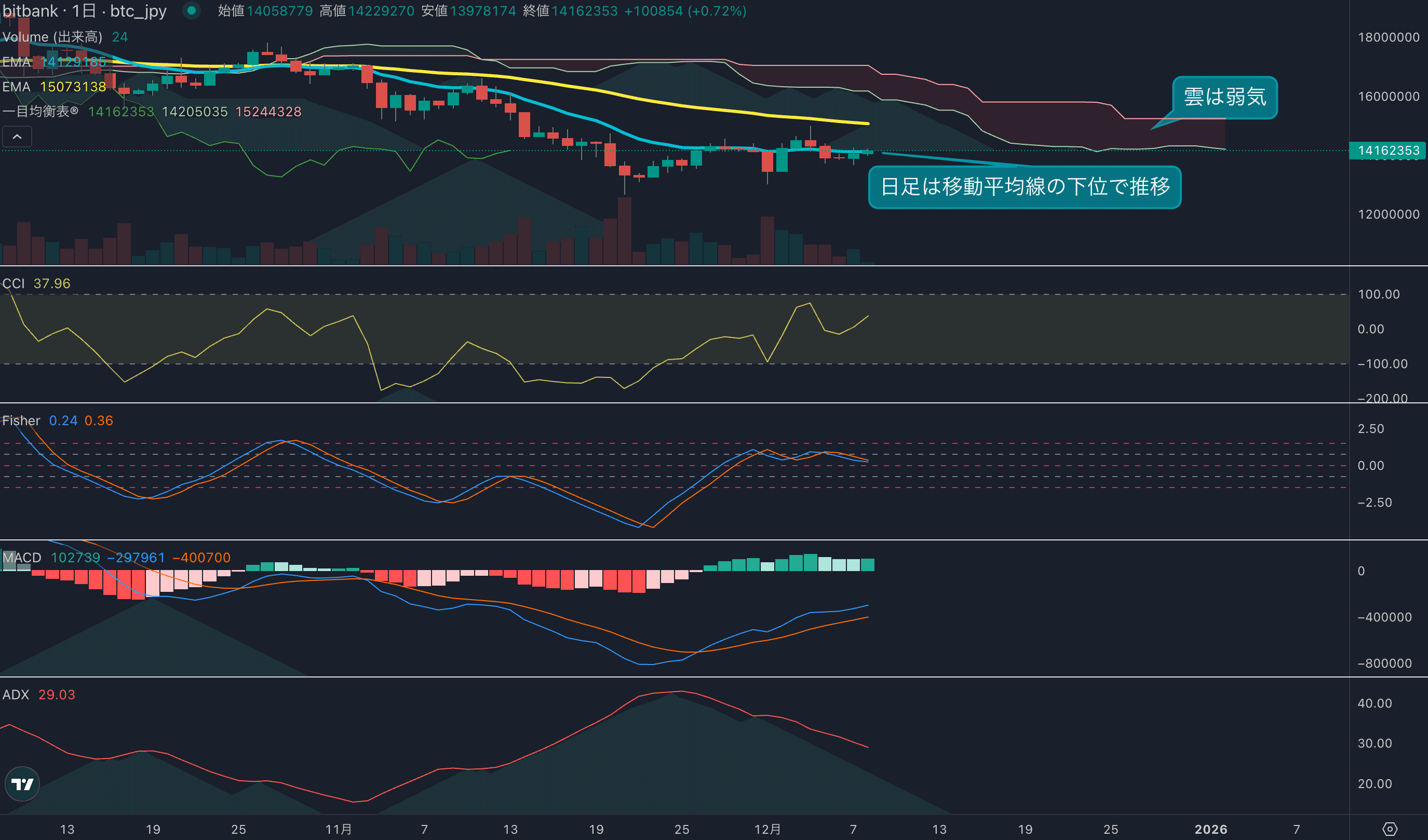 - 価格は14EMA(1412万円)を下回り弱気示唆です。53EMA(1510万円)は下落傾向で、長期トレンドは弱気です。一目均衡表の雲は先行スパン1(1425万円)が先行スパン2(1524万円)を下回り弱気示唆です。
