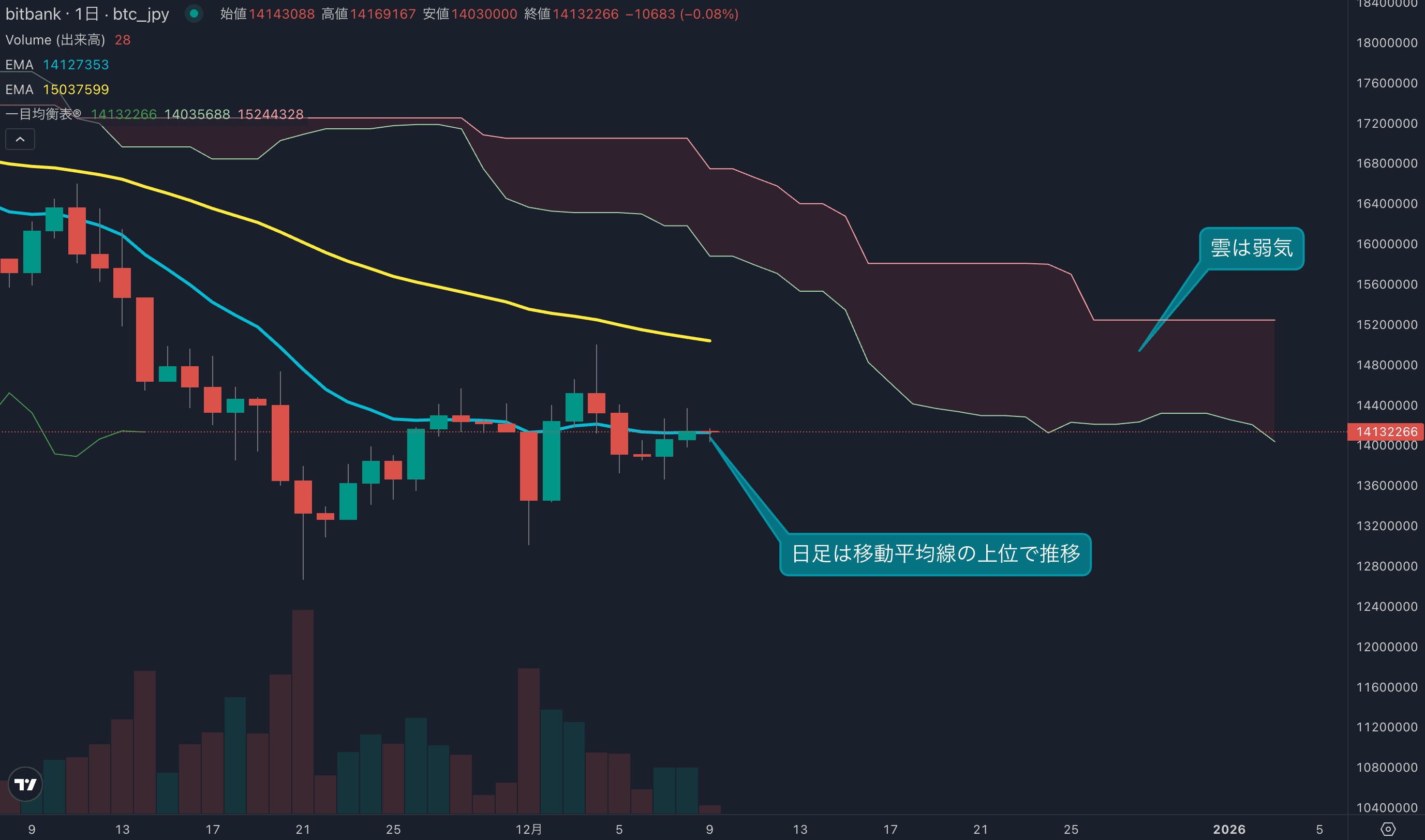 - 価格は14EMA(1412万円)を上回り強気示唆です。53EMA(1507万円)は下落傾向で、長期トレンドは弱気です。一目均衡表の雲は先行スパン1(1420万円)が先行スパン2(1524万円)を下回り弱気示唆です。