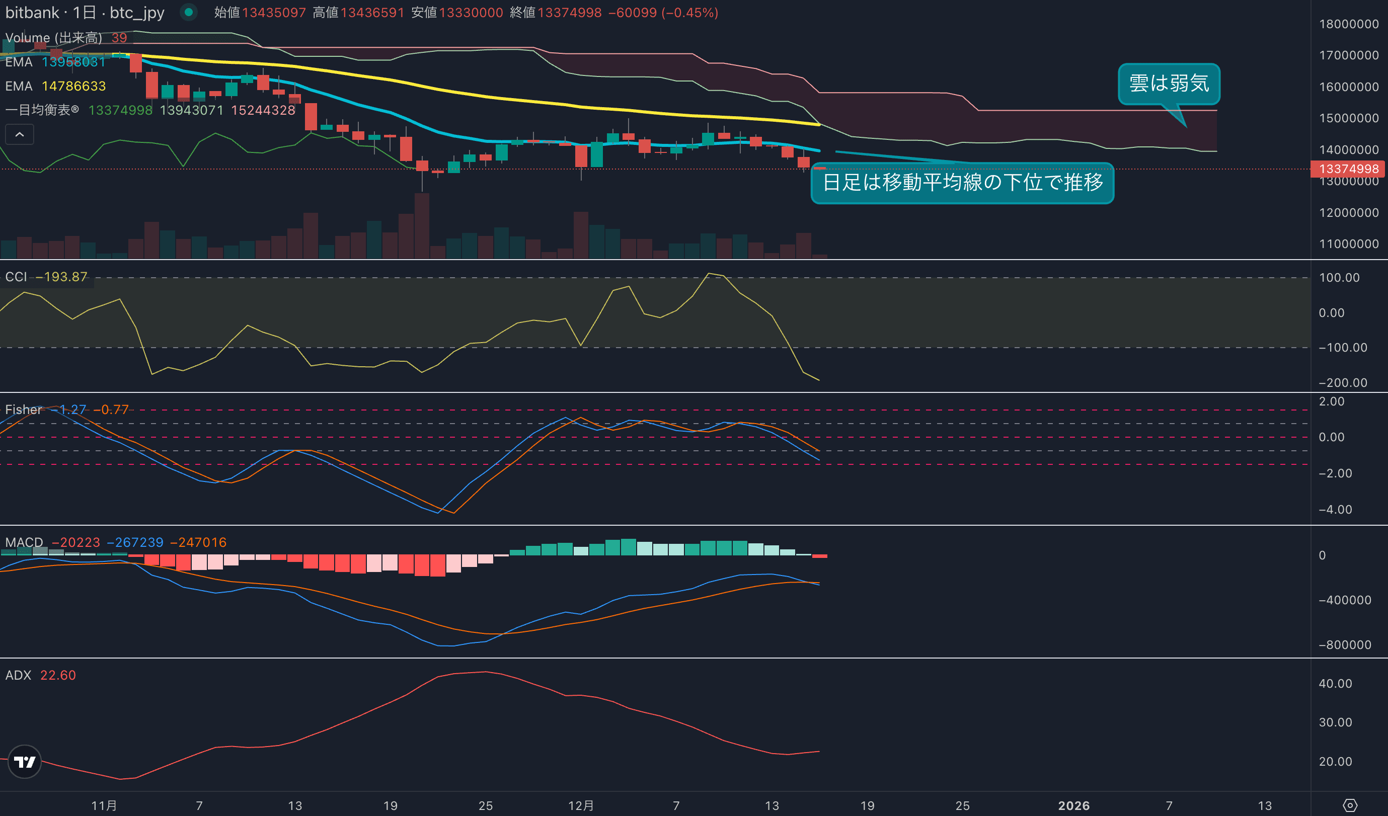 - 価格は14EMA(1404万円)を下回り弱気示唆です。53EMA(1484万円)は下落傾向で、長期トレンドは弱気です。一目均衡表の雲は先行スパン1(1394万円)が先行スパン2(1524万円)を下回り弱気示唆です。