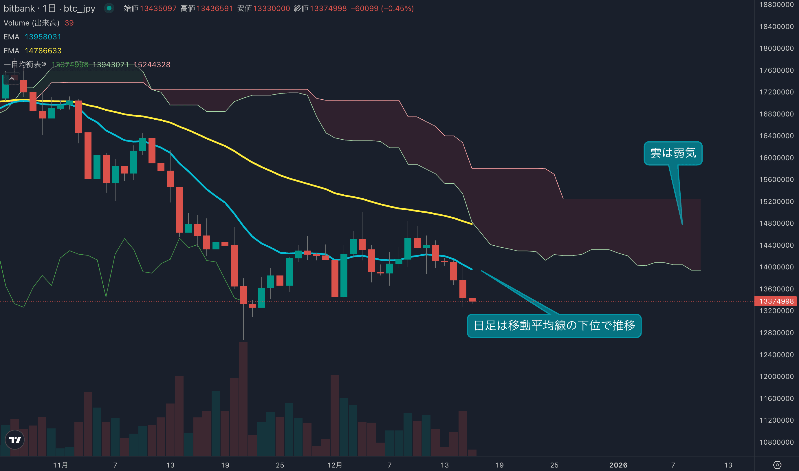 - 昨日のビットコインは2.3%下落し、終値は1343万円でした。日足は4日連続の陰線を記録しています。先週金曜日から移動平均線を下回り、弱い動きが見られます。