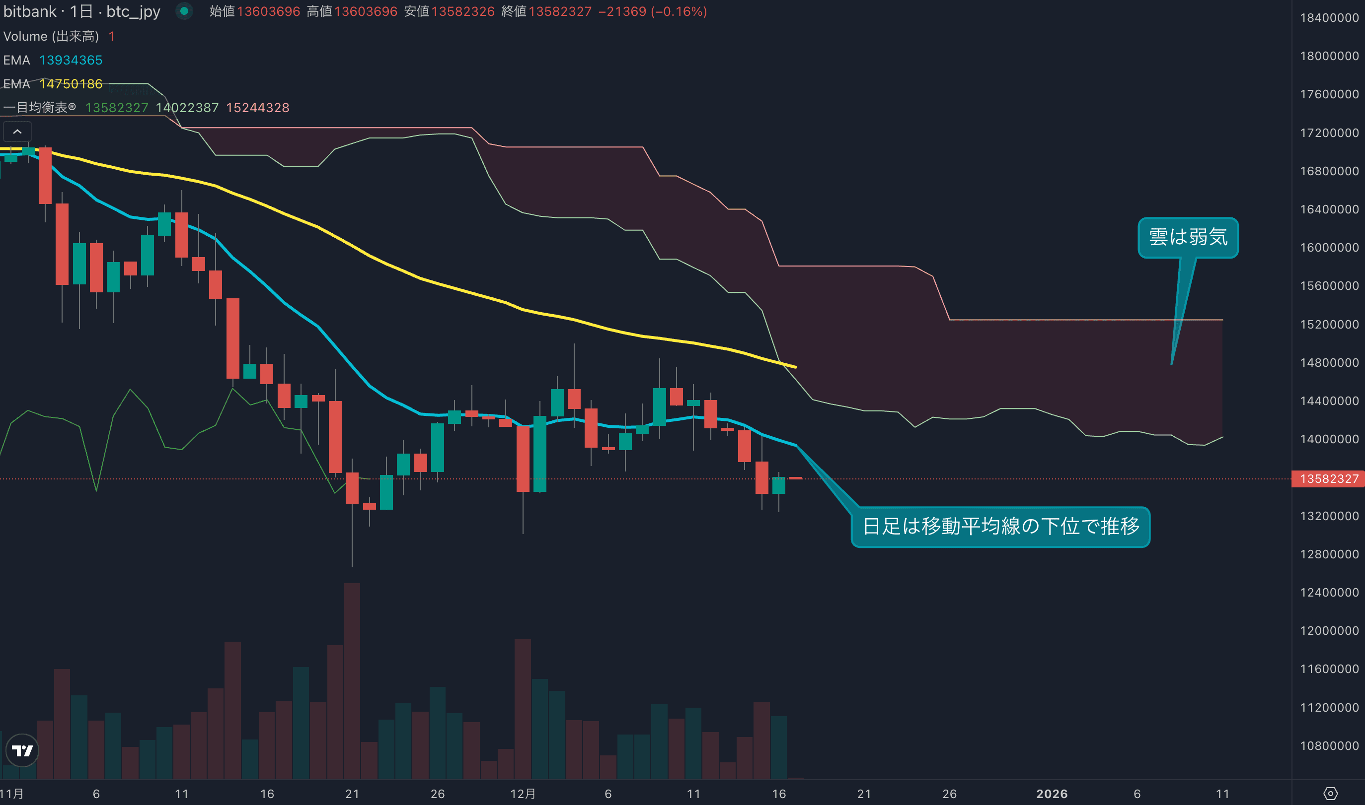 - 価格は14EMA(1398万円)を下回り弱気示唆です。53EMA(1479万円)は下落傾向で、長期トレンドは弱気です。一目均衡表の雲は先行スパン1(1393万円)が先行スパン2(1524万円)を下回り弱気示唆です。
