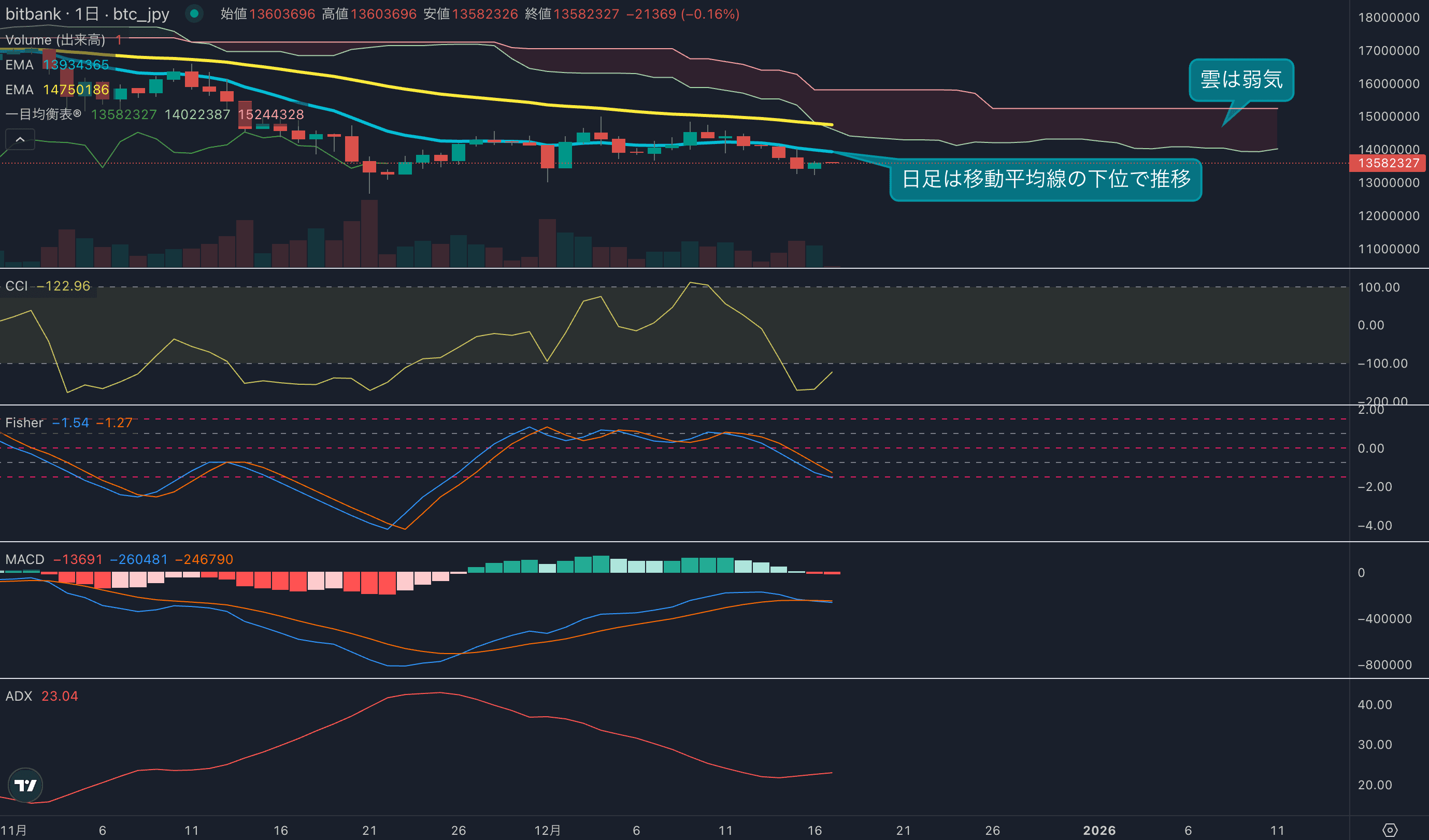 - 昨日のビットコインは1.2%上昇し、終値は1360万円でした。日足は5日ぶりに陽線を記録しました。価格は移動平均線を下回り、弱気の値動きが維持されています。