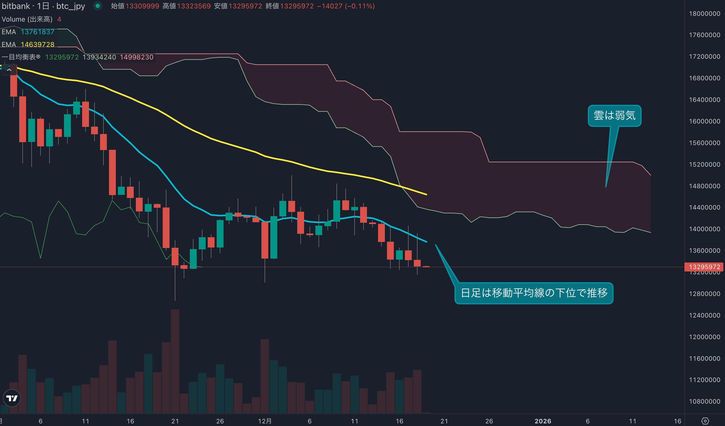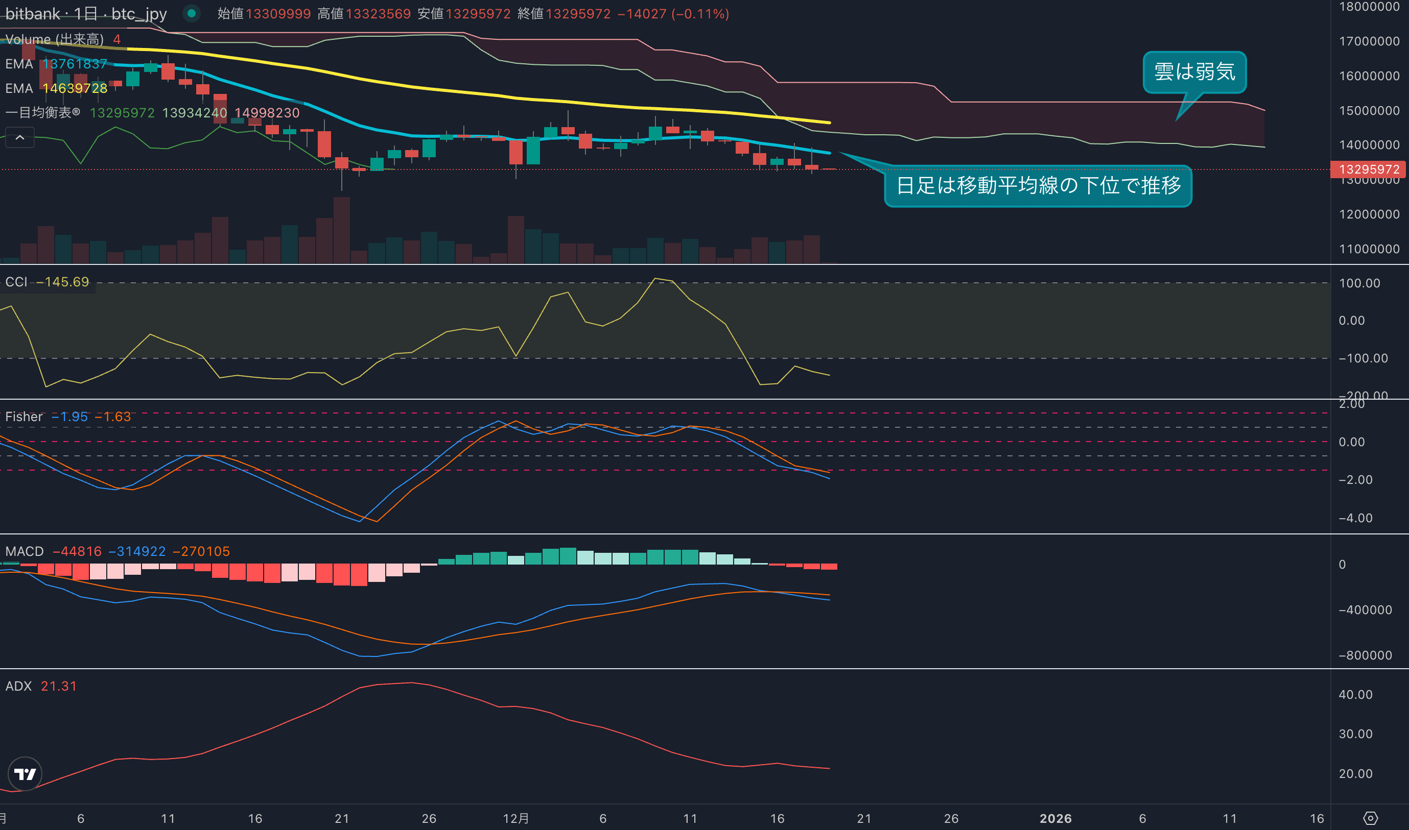 - 価格は14EMA(1383万円)を下回り弱気示唆です。53EMA(1469万円)は下落傾向で、長期トレンドは弱気です。一目均衡表の雲は先行スパン1(1397円)が先行スパン2(1517万円)を下回り弱気示唆です。