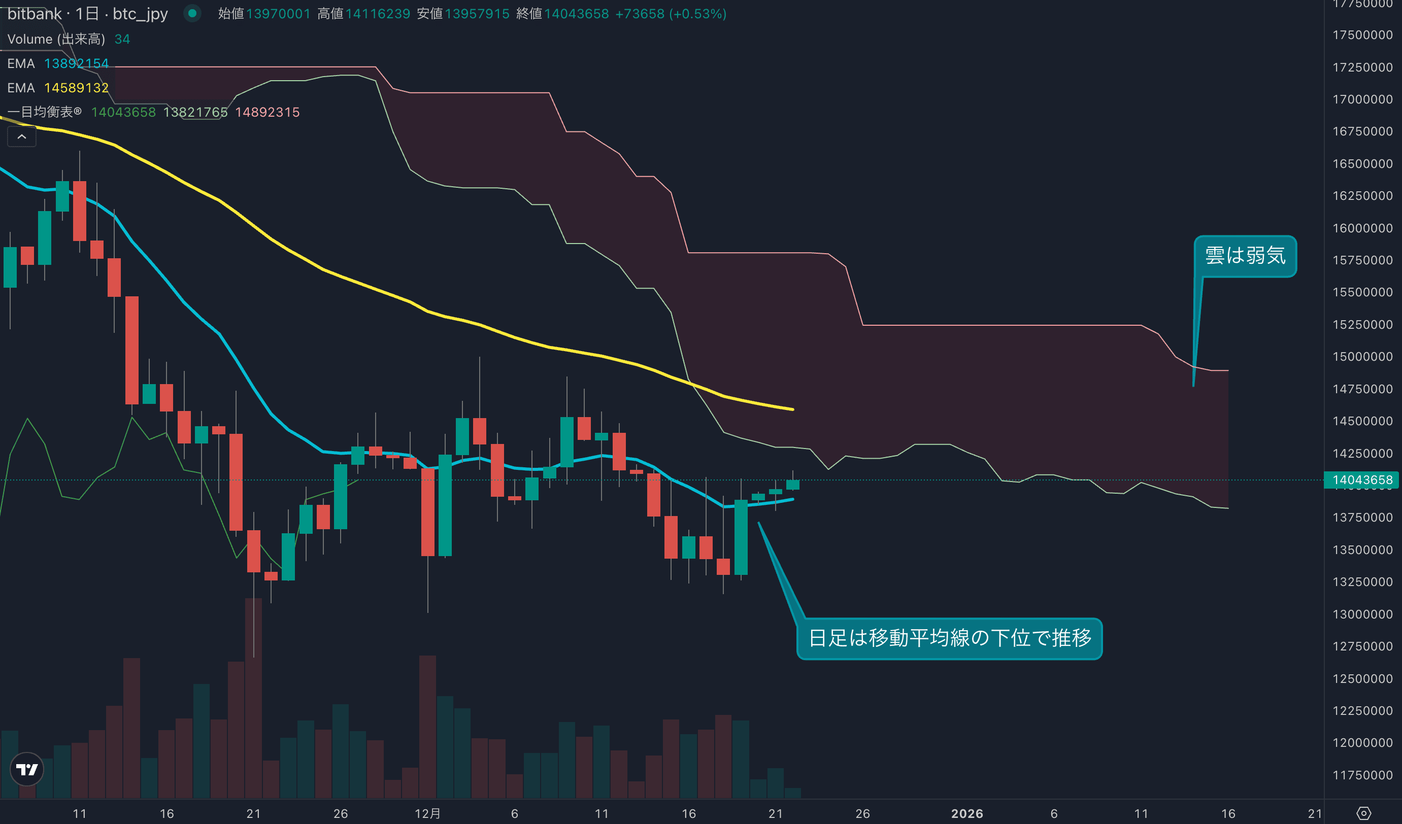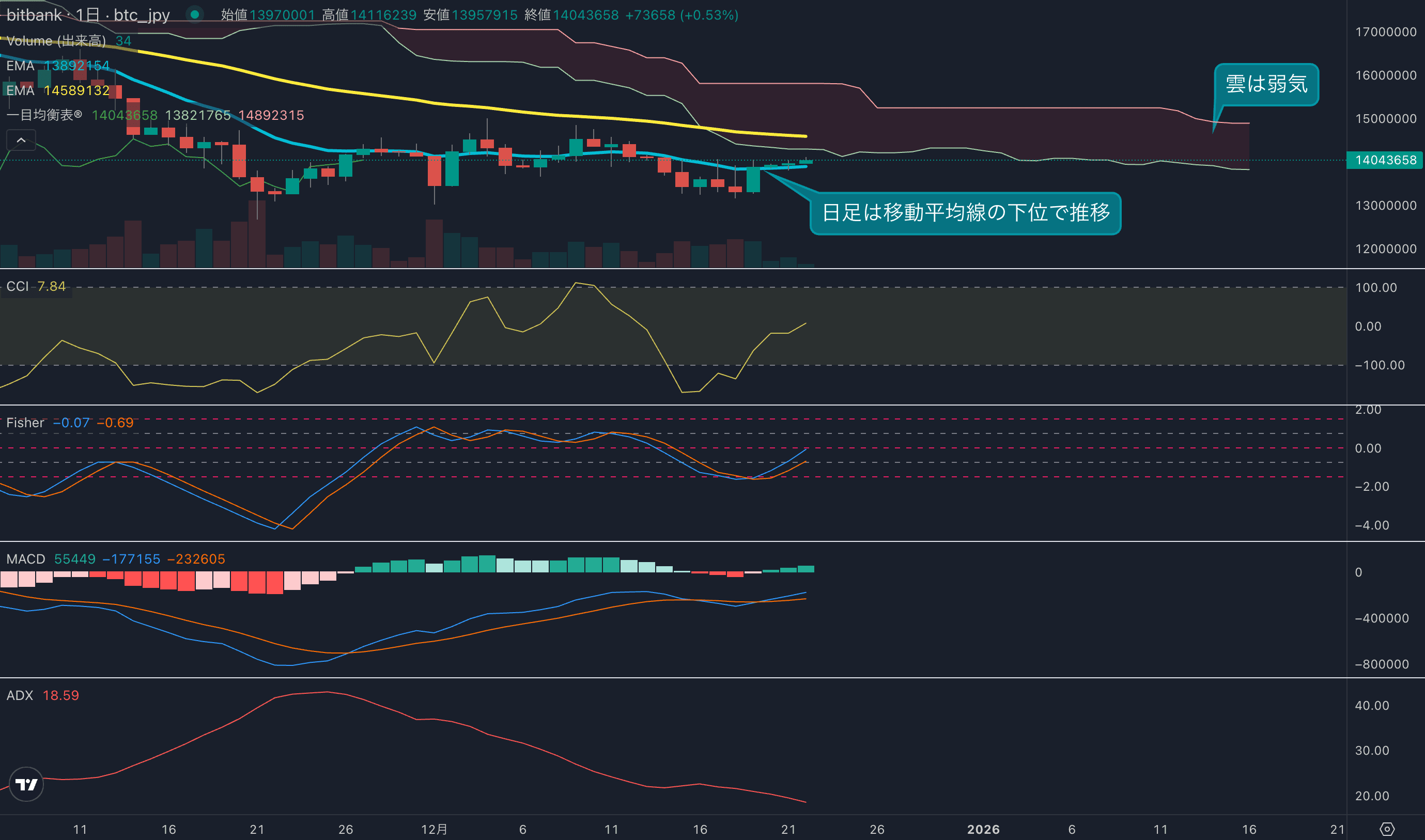- 価格は14EMA(1386万円)を上回り強気示唆です。53EMA(1383万円)は下落傾向で、長期トレンドは弱気です。一目均衡表の雲は先行スパン1(1383万円)が先行スパン2(1489万円)を下回り弱気示唆です。